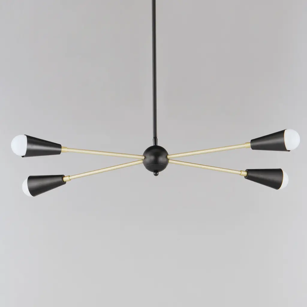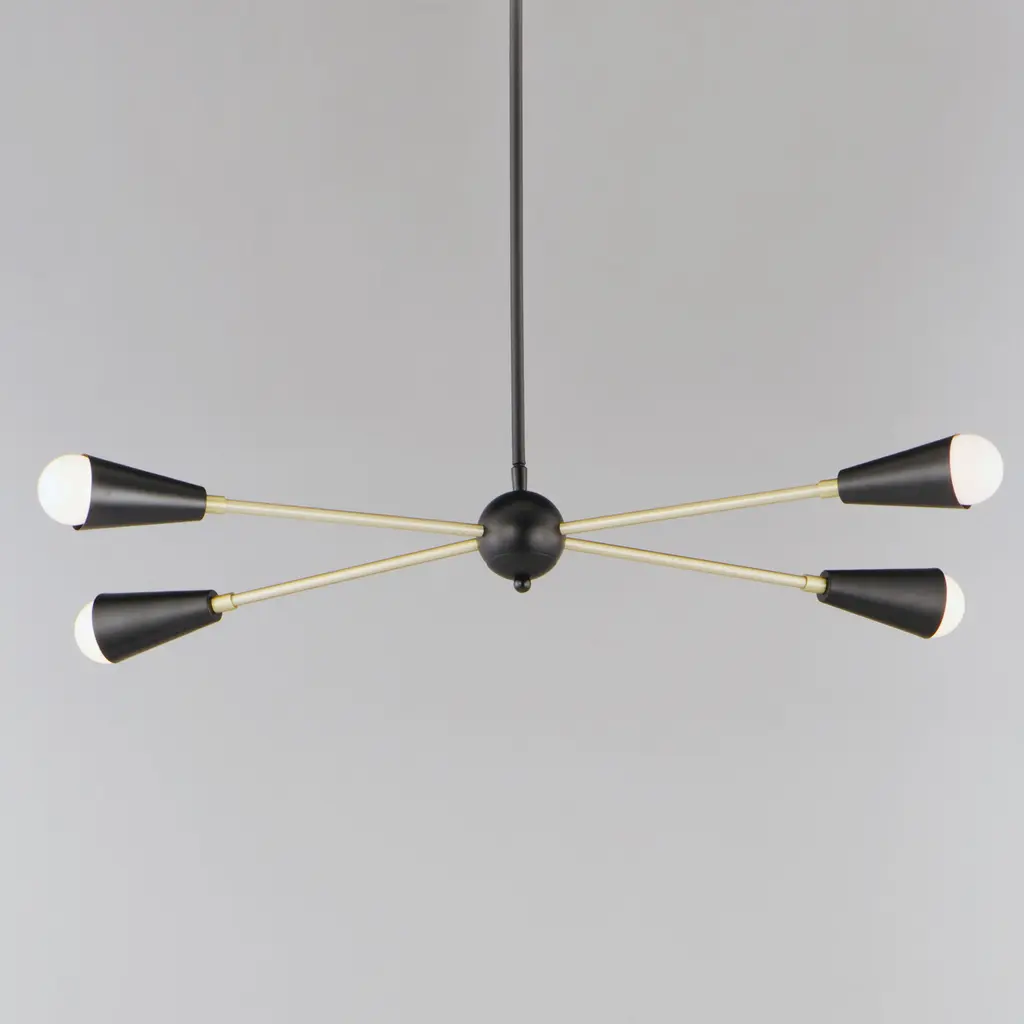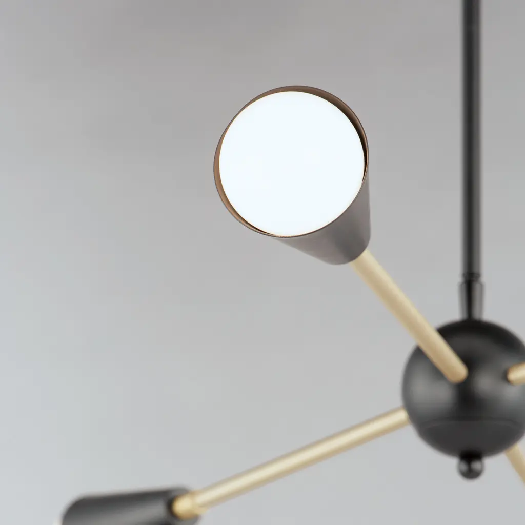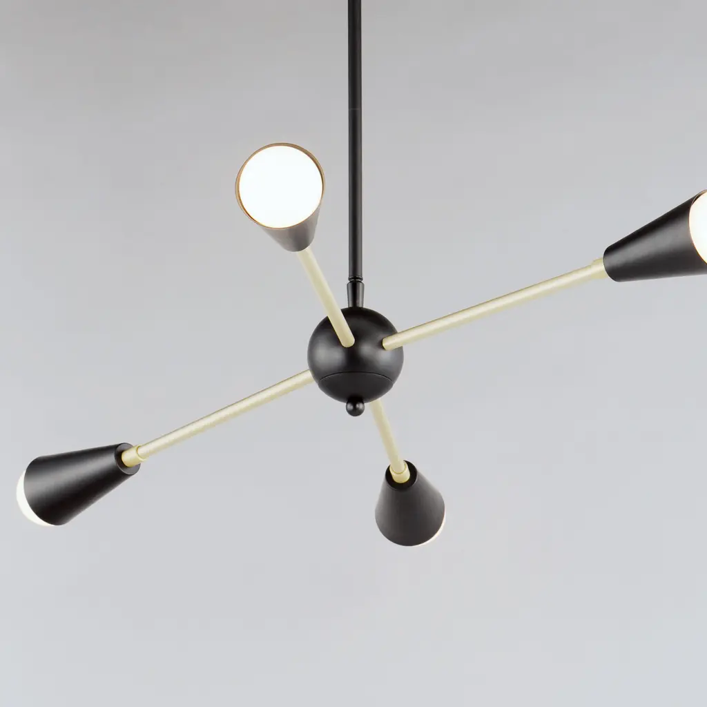 A classic mid-century look, the Lovell collection features two sizes of sputnik chandeliers and streamlined sconces perfect for bath vanity applications. Available in a Black/Satin Brass finish combination. Light bulbs nest inside the metal cones to become an element of the design.