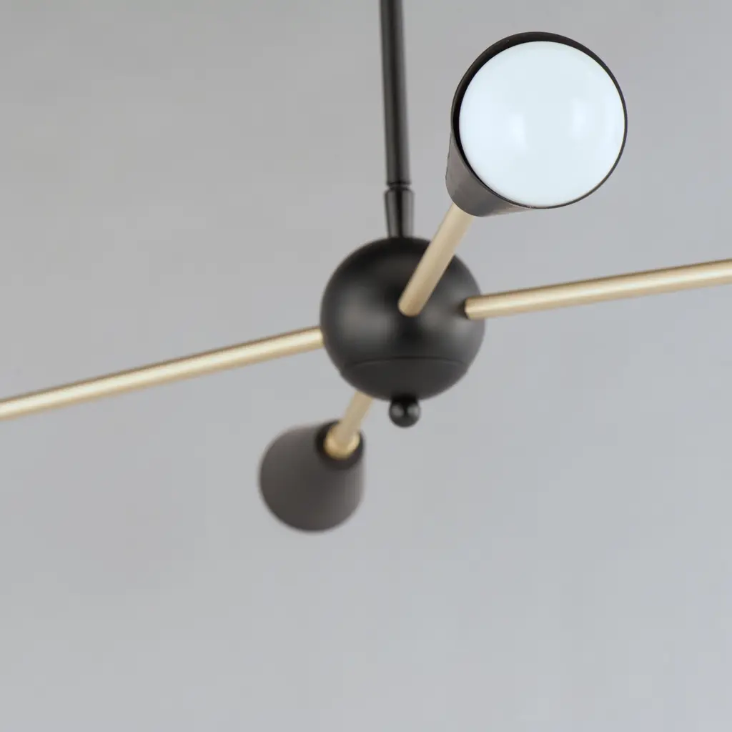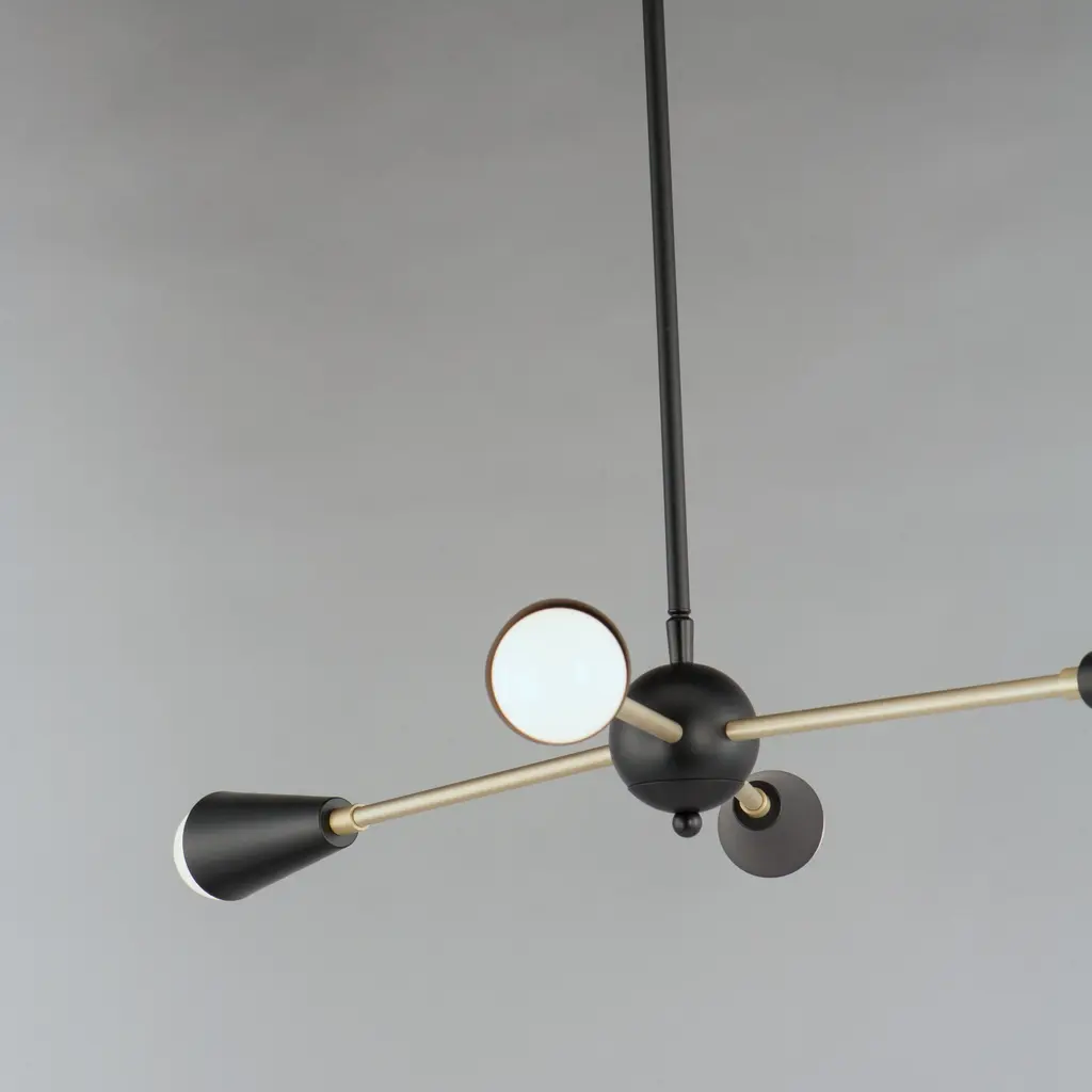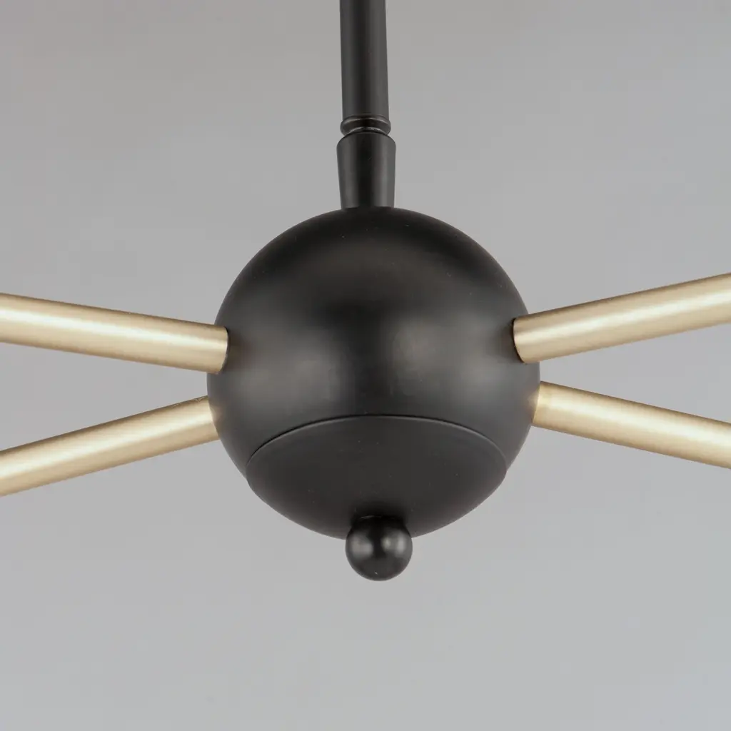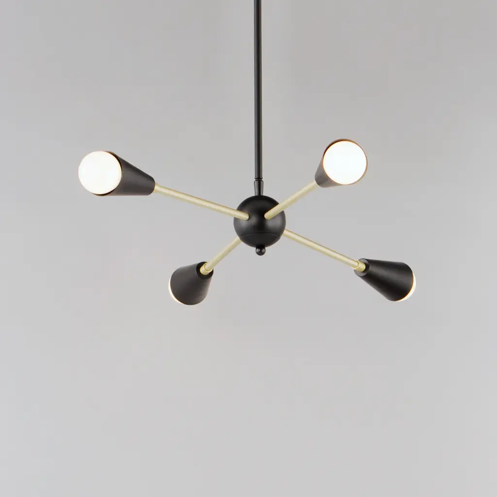 A classic mid-century look, the Lovell collection features two sizes of sputnik chandeliers and streamlined sconces perfect for bath vanity applications. Available in a Black/Satin Brass finish combination. Light bulbs nest inside the metal cones to become an element of the design.