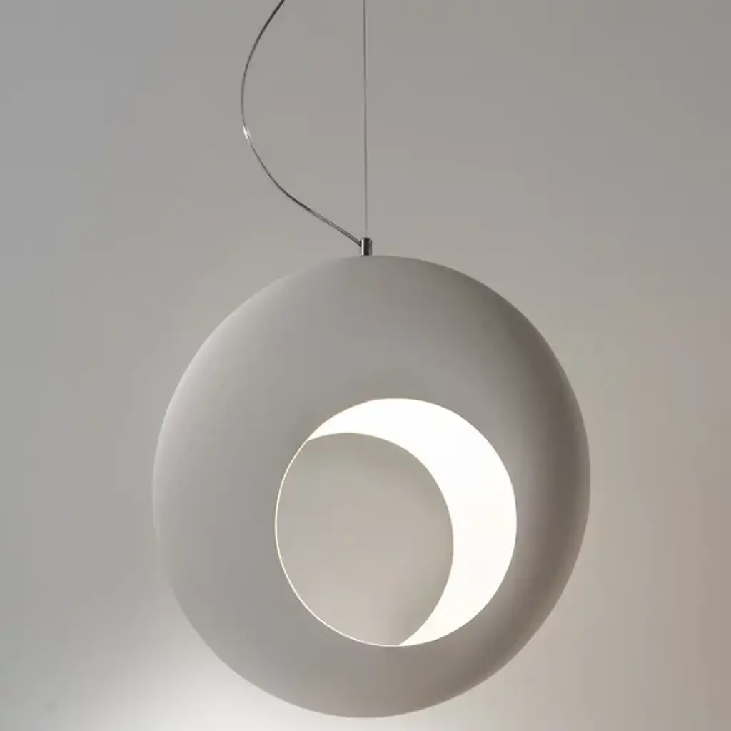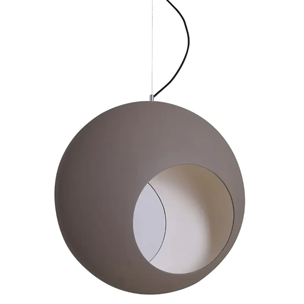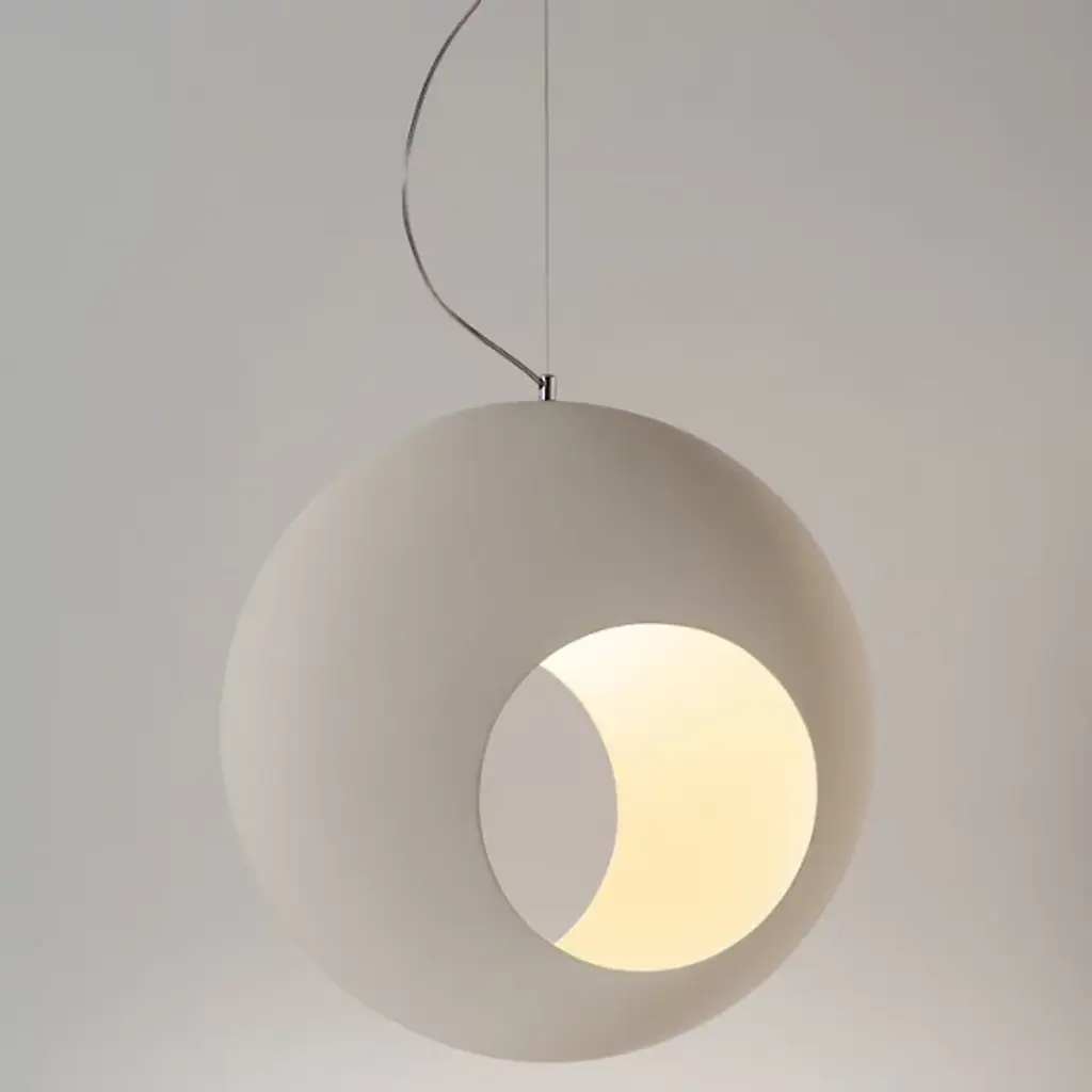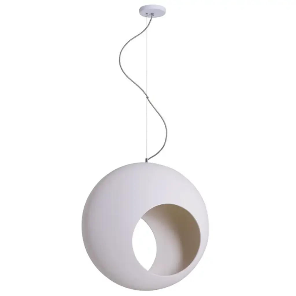 The Lua Pendant from Geo Contemporary is a celestial wonder brought down to earth. Its spherical form evokes the moon, with a crescent-shaped cutout. This pendant's clean, geometric design makes it a standout piece in any room. When illuminated, it casts a soft, diffused glow through its opening, creating an ambient atmosphere reminiscent of moonlight. Its substantial size makes it an ideal centerpiece for dining rooms, entryways, or living spaces. The Lua Pendant transforms your space into a nocturnal paradise, even in broad daylight.