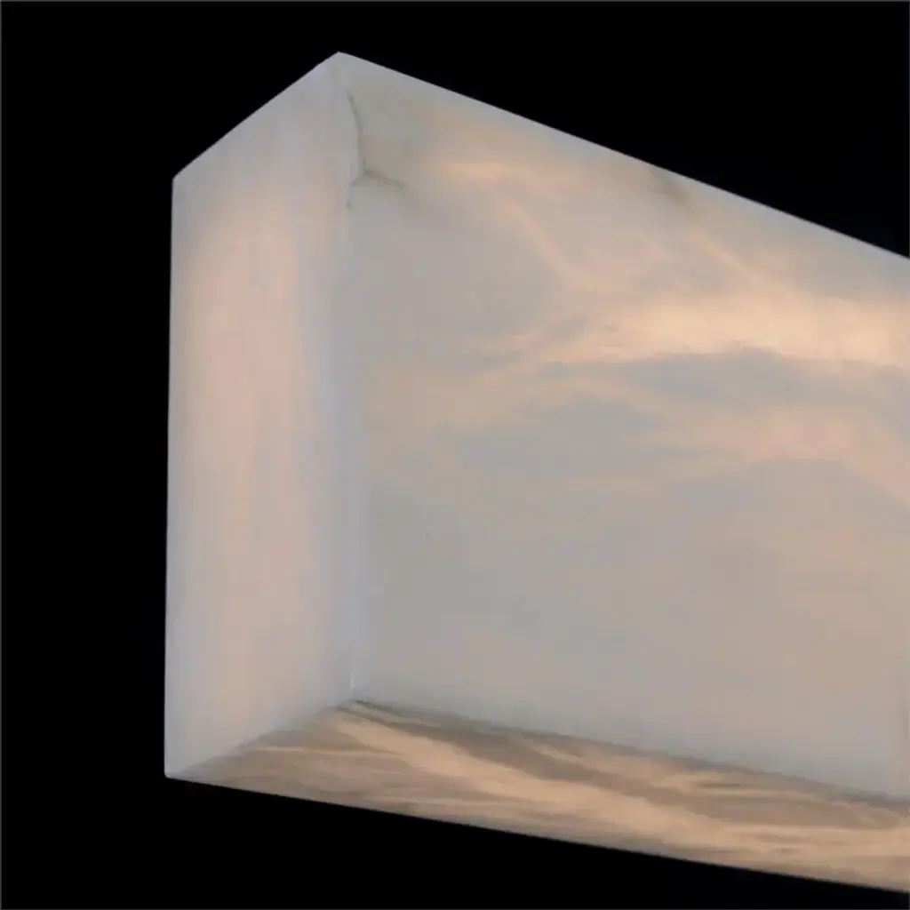 The Luca Pendant is an elegant statement piece, showcasing a stunning rectangular cut of natural alabaster stone affixed to metallic hardware in an alluring Gunmetal finish. Light is beautifully diffused through the gorgeous stone, creating a wonderful ambience in any décor.