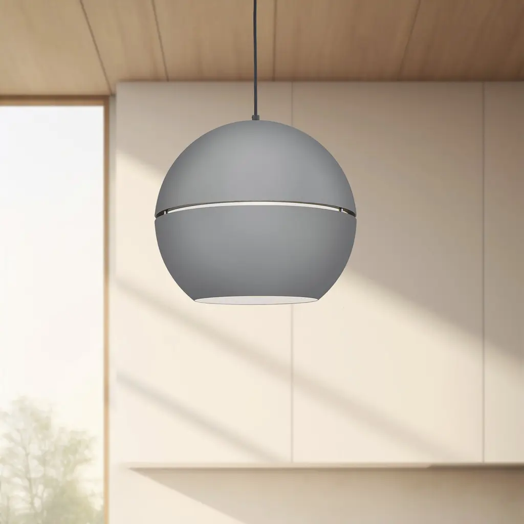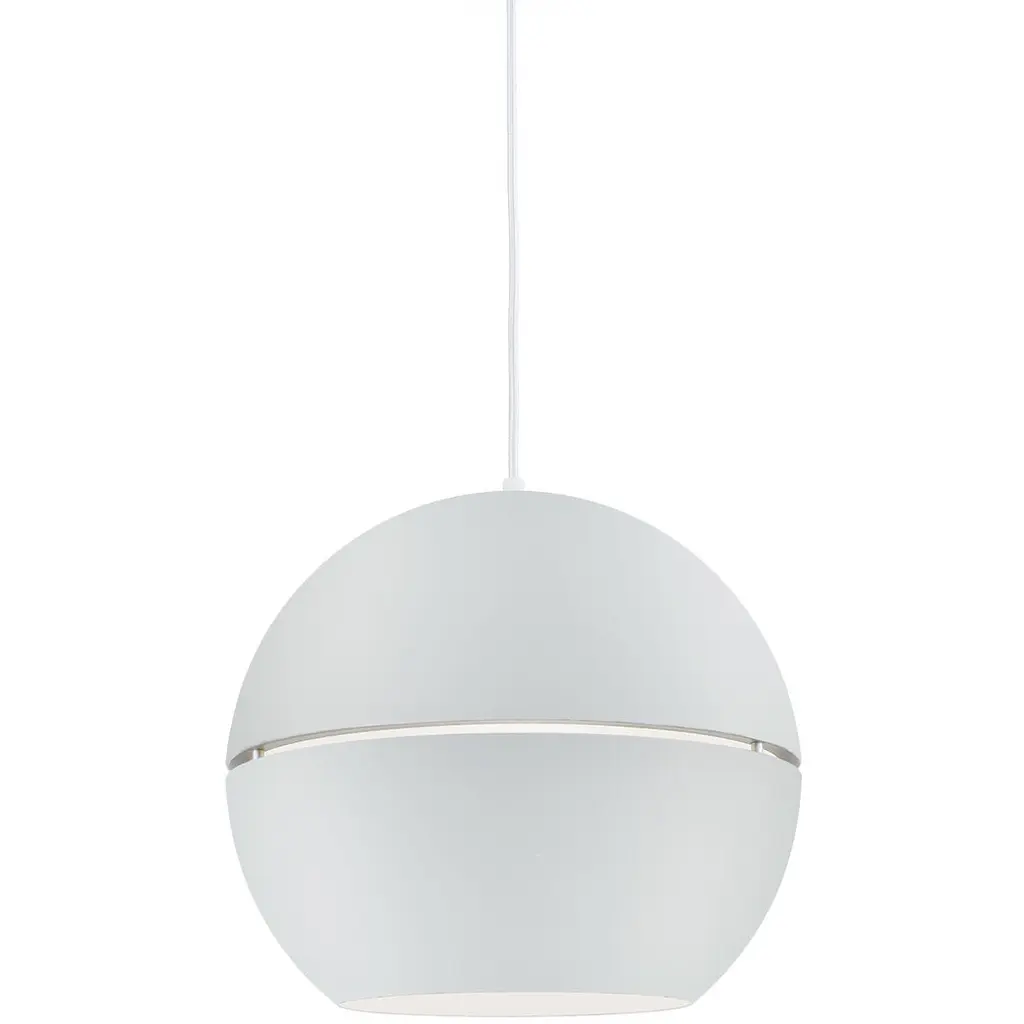 Single-lamp pendant with split spherical aluminum shade showcasing powder-coated finishes against a matte white interior. Exterior shade colors are gray, white or black. Suspended by cloth cable. Available in two sizes.