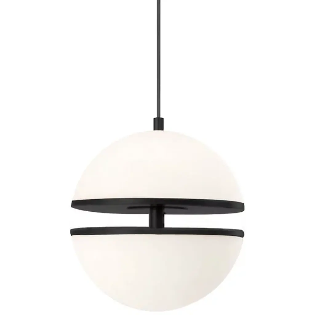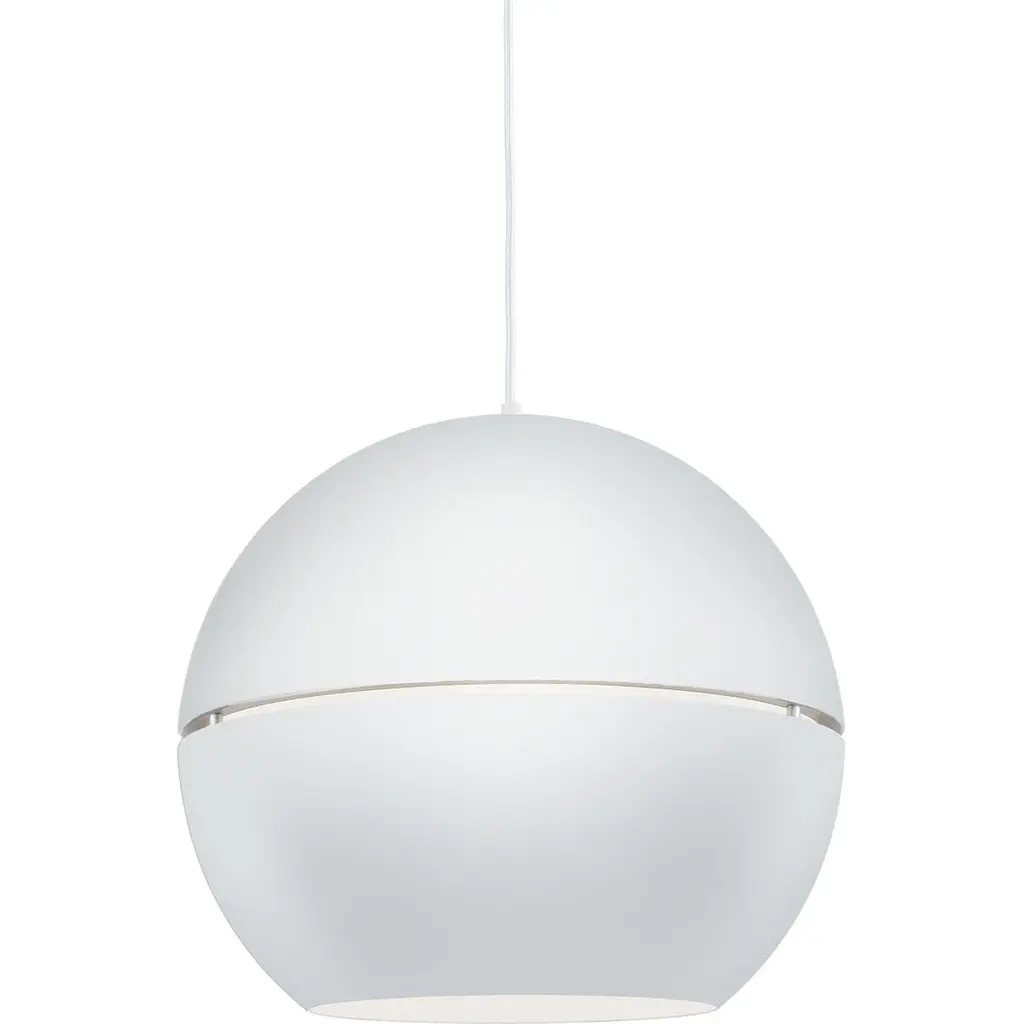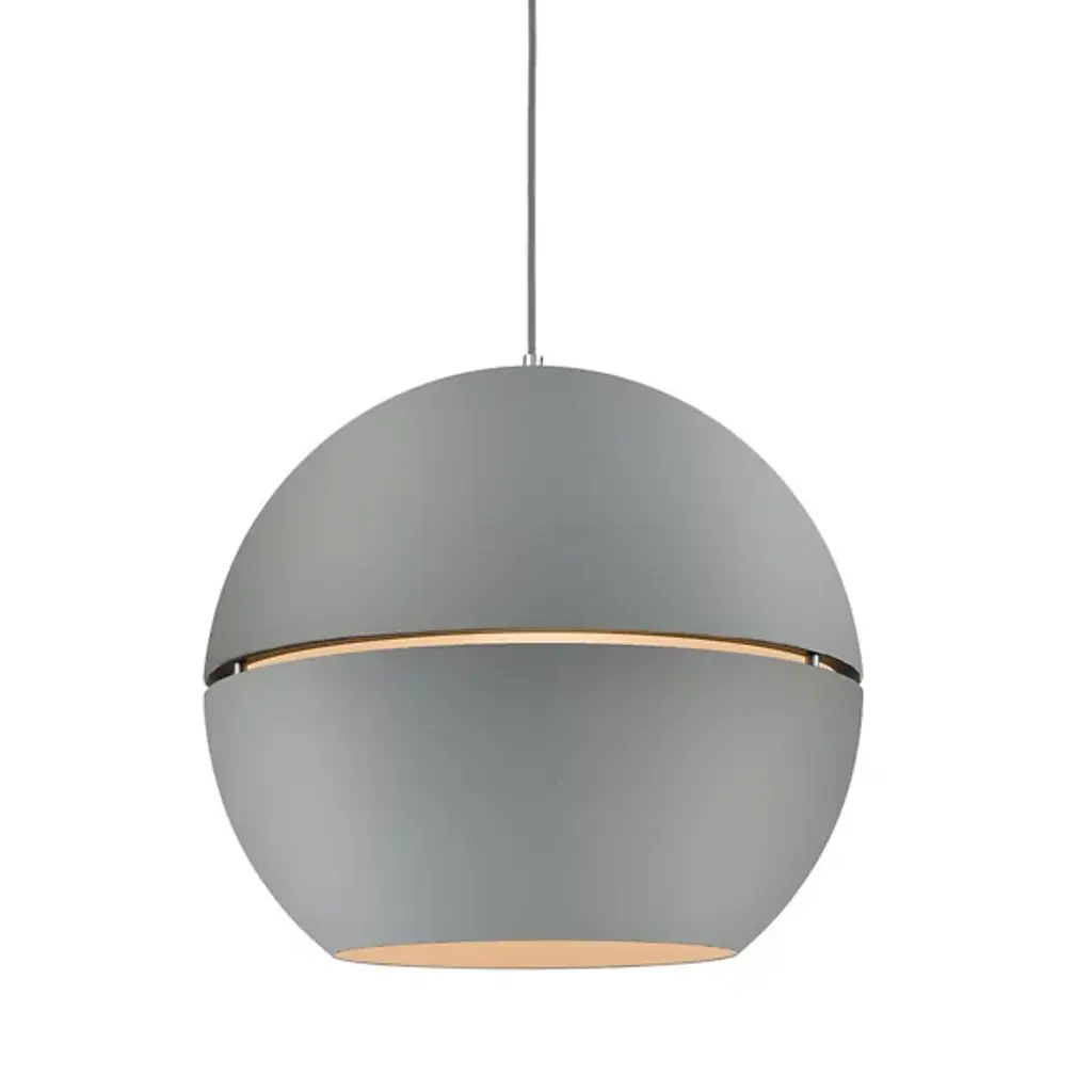 Single-lamp pendant with split spherical aluminum shade showcasing powder-coated finishes against a matte white interior. Exterior shade colors are gray, white or black. Suspended by cloth cable. Available in two sizes.