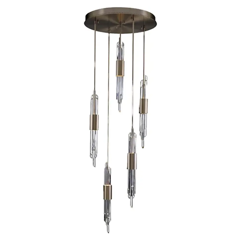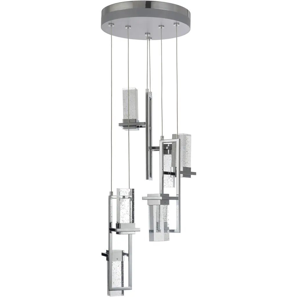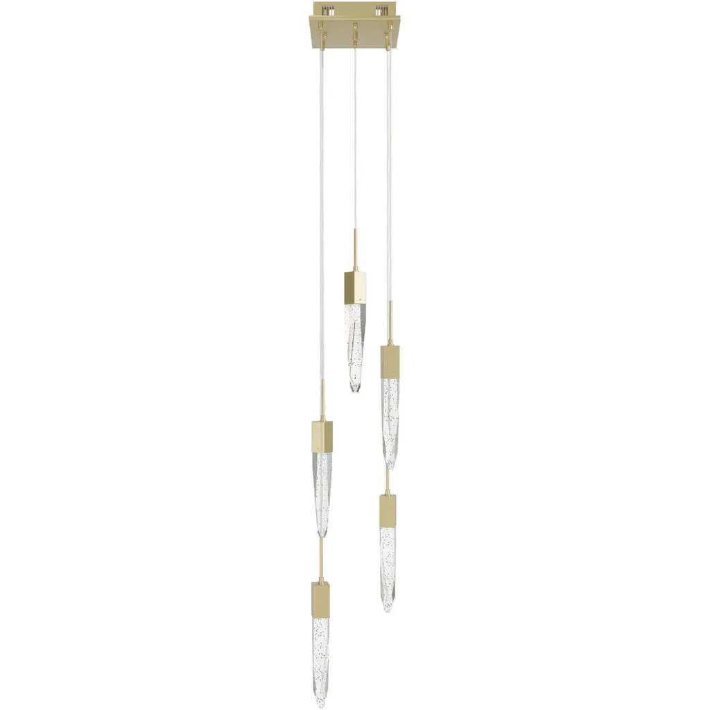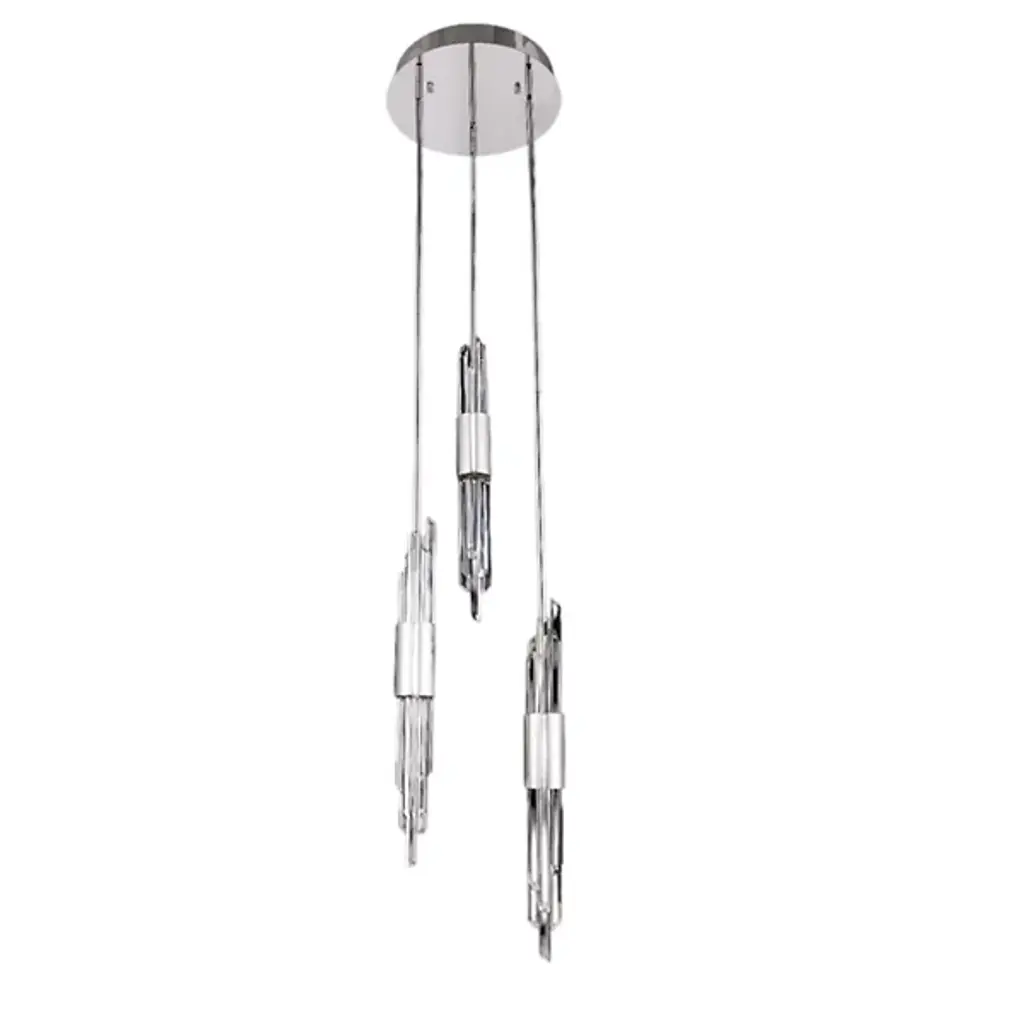 The Lucca LED Multi-Light Pendant is a refined design that brings the beauty of diffused light into spaces. Suspended from a round canopy, a collection of faceted, hexagonal crystal rods that are wrapped around their middle with a jewelry-like band are supported by sleek metal rods. The band around each piece emits a soft, energy-efficient layer of light that filters beautifully through each crystal piece, adding a dazzling touch to its surroundings.