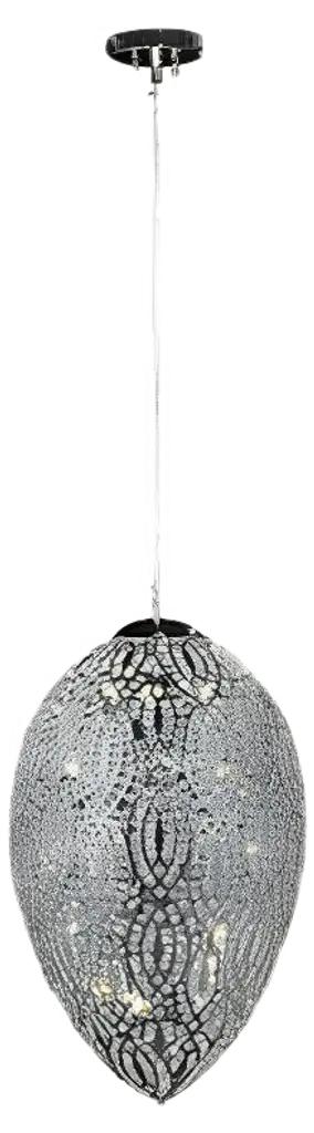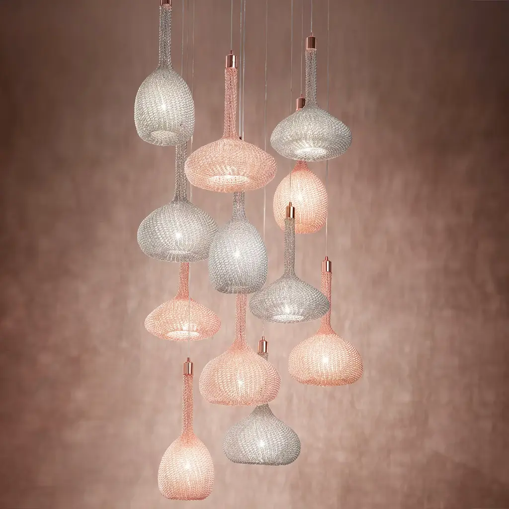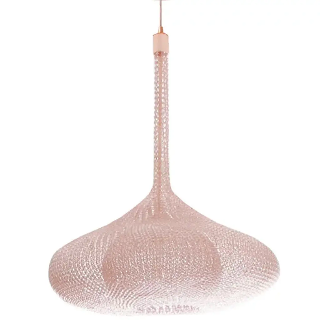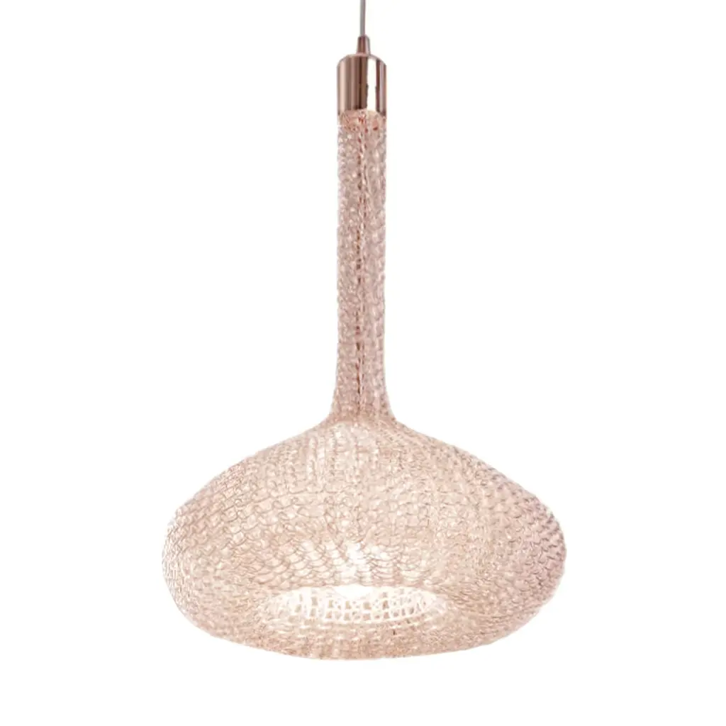 Suspended from the ceiling with a copper-finished metal cap, this unique pendant lamp is crafted by minutely hand-weaving, both inside and outside, a single copper thread coated with a double layer of resin in a delicate pearl-gray hue. Generating a suggestive glow, the internal light source radiates beyond the openwork surface of the bulb-shaped shade, giving the piece an appealing, airy aesthetic. Resistant to UV rays, high temperatures, and dust thanks to the resin that also protects the copper from oxidation, this design will make a statement in any interior.