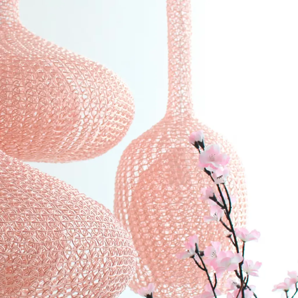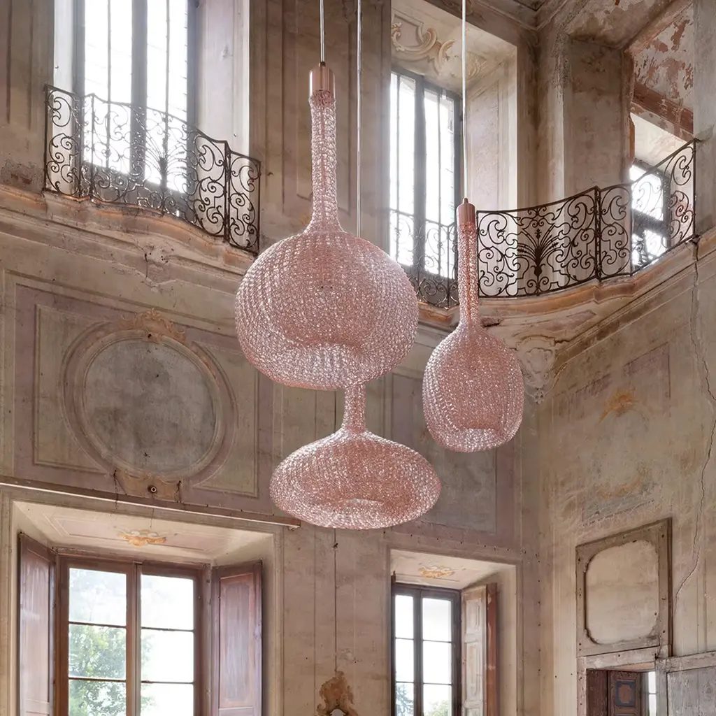 Classy and sculptural, this pendant lamp features a copper-finished metal mount as support for its luminous shade, a mesh intertwined by hand using a single, pink-hued copper thread covered with a double layer of resin to make it UV-resistant, dust-proof, and enhance its antioxidant properties. An appealing interplay of reflections and show lines will uplift any decor thanks to the light radiating from within and filtering through the links.