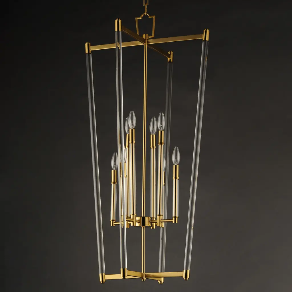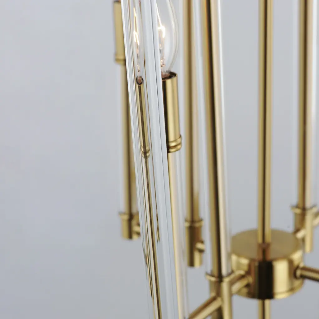 Unique and dramatic pendants are created using solid, Clear glass rods that fit into castings finished in Polished Nickel or Heritage Brass. The elongated forms are great for foyer spaces and stairways, while the sconces provide a chic accent to the space they are installed. Combining contemporary sleekness with classic styling, this collection complements a wide range of decor styles.