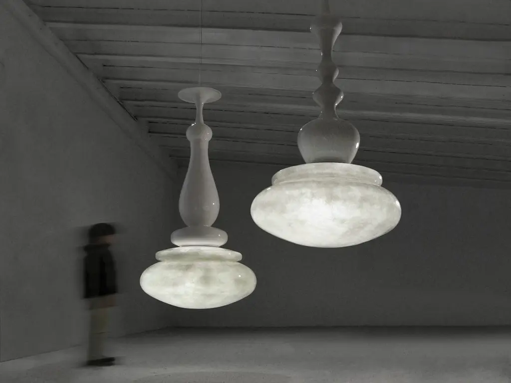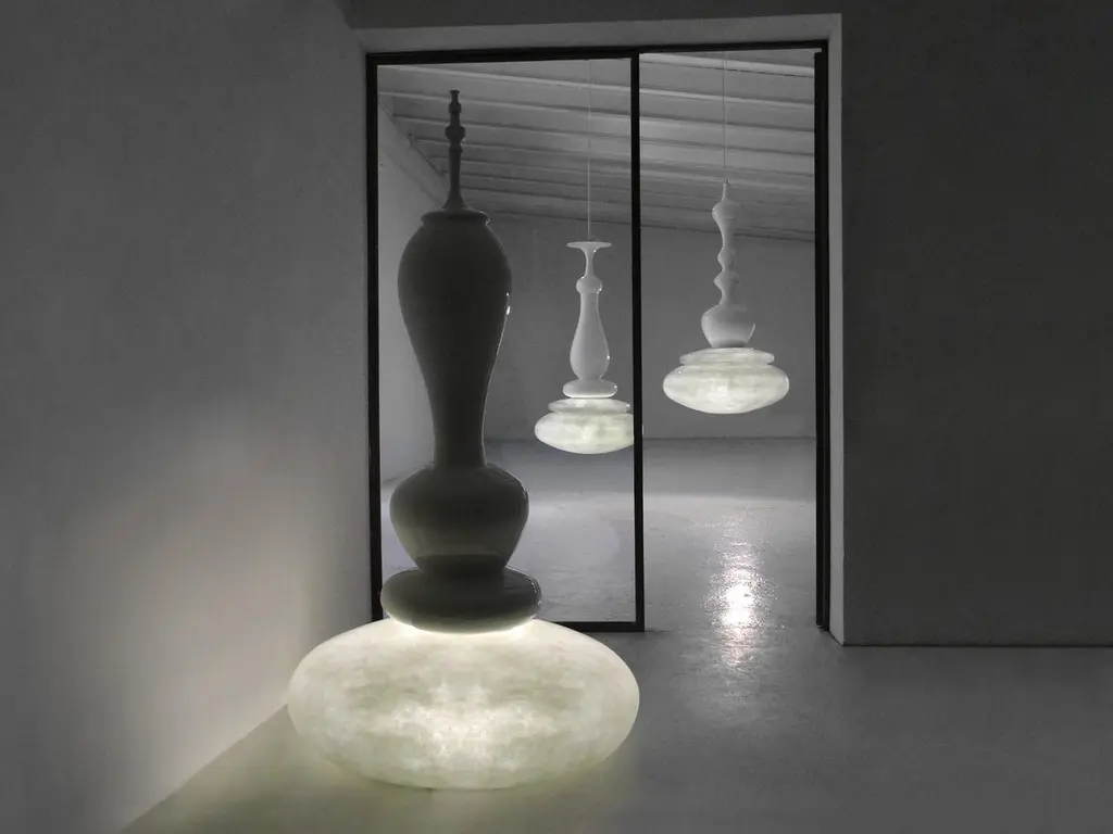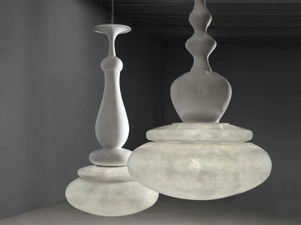 Lucilla lamp by Imperfettolab2010Dimensions : Ø 100 x D 195 cmMaterials : Fibreglass Modular lamp system.Imperfetto LabWho we are ? We are a family.Verter Turroni, Emanuela Ravelli and our children Elia, Margherita and Eusebio.All together, we are separate parts and their expansion.The laboratory is in the care of Verter.From the sketch on paper he mixes materials, shapes and colours to the definition of the object.His intuitive and visionary research is performed with the complicity, recognition and practical support of his brother Erich.Emanuela is the voice of a vivid and silent work.She connects Imperfettolab with the other and with the rest of the world, respecting its nature and identity.She watches over its wholeness and authenticity.The playful spirit is entrusted to our children.They are the ones who test our works, certify their durability, functionality and enjoyment.We believe it is their expression, after all, that validates and makes our work universal.Since 1992, our thoughts and actions have moved, grown and taken shape in the land of Romagna.Between hills of cherry and olive trees, cultivated plains and piles of recyclable steel and iron.In between, the ancient Roman road via Emilia.A contrasting and mutating landscape that reflects in our furnishing sculptures.Ours is an open space, the times of art and life seamlessly merge.
