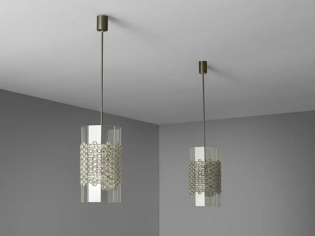 Chandeliers, Perspex, metal, Germany, 1970sSeveral shimmering pendants that were implemented in ships and high-class trains. The lucite sheets embrace a simple layout, whereas the diamond-shaped petals adhere to a decorative character. The transparent lucite allows the light to get captured by the glass jewels, creating an absolute stunning light partition and reflection, strengthened by the metal fixture. Please note the price is per item. We have more of these lamps available, which makes these lights perfect for a large scale interior project.