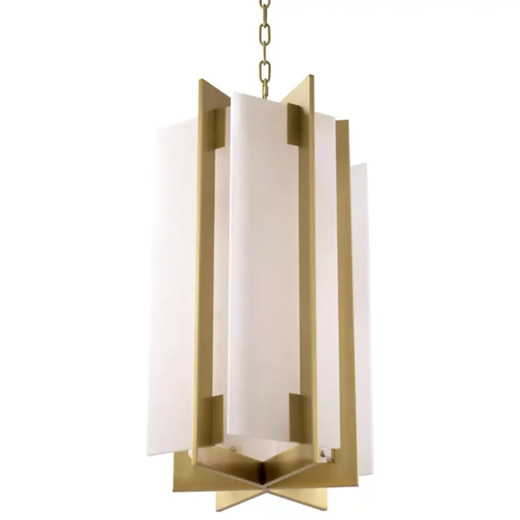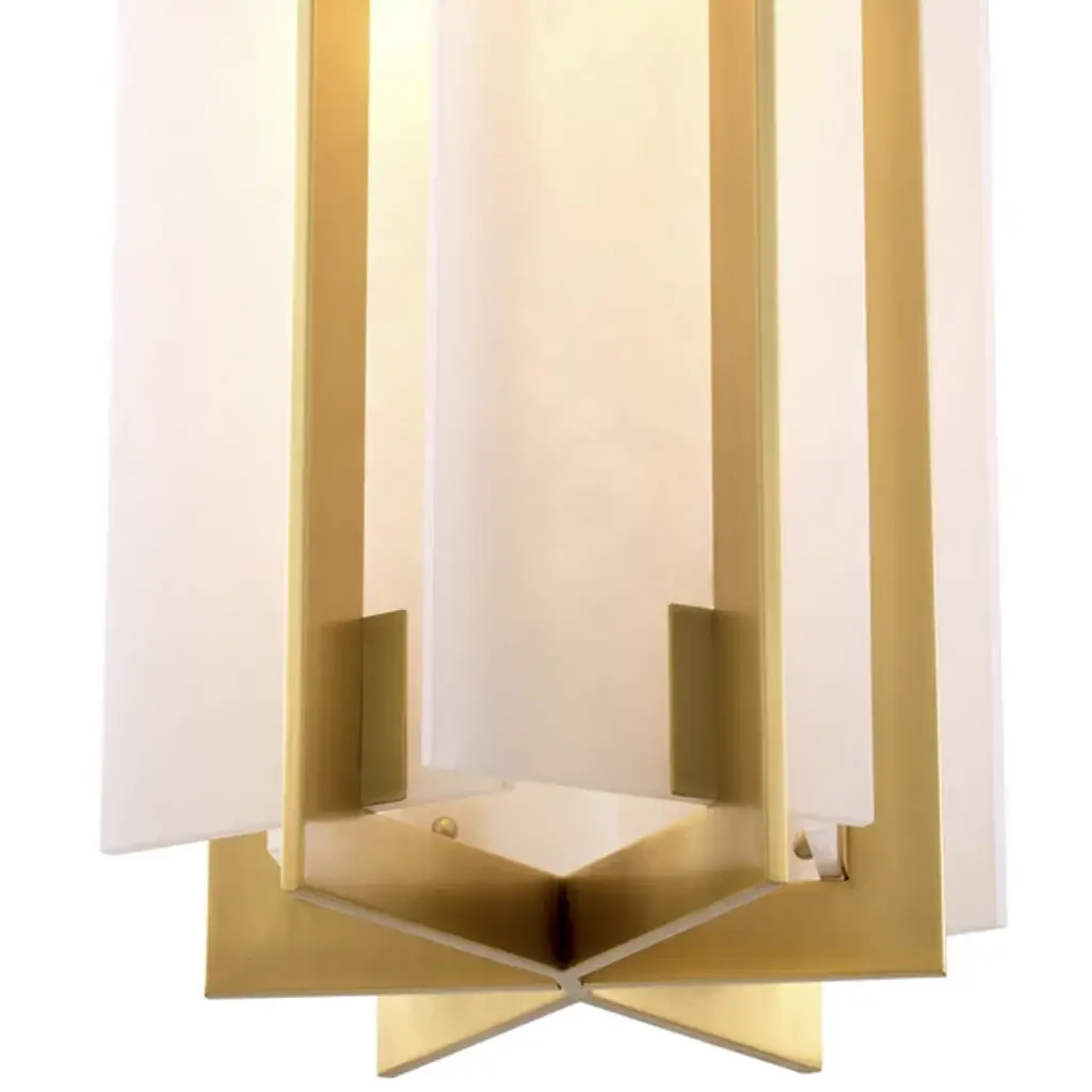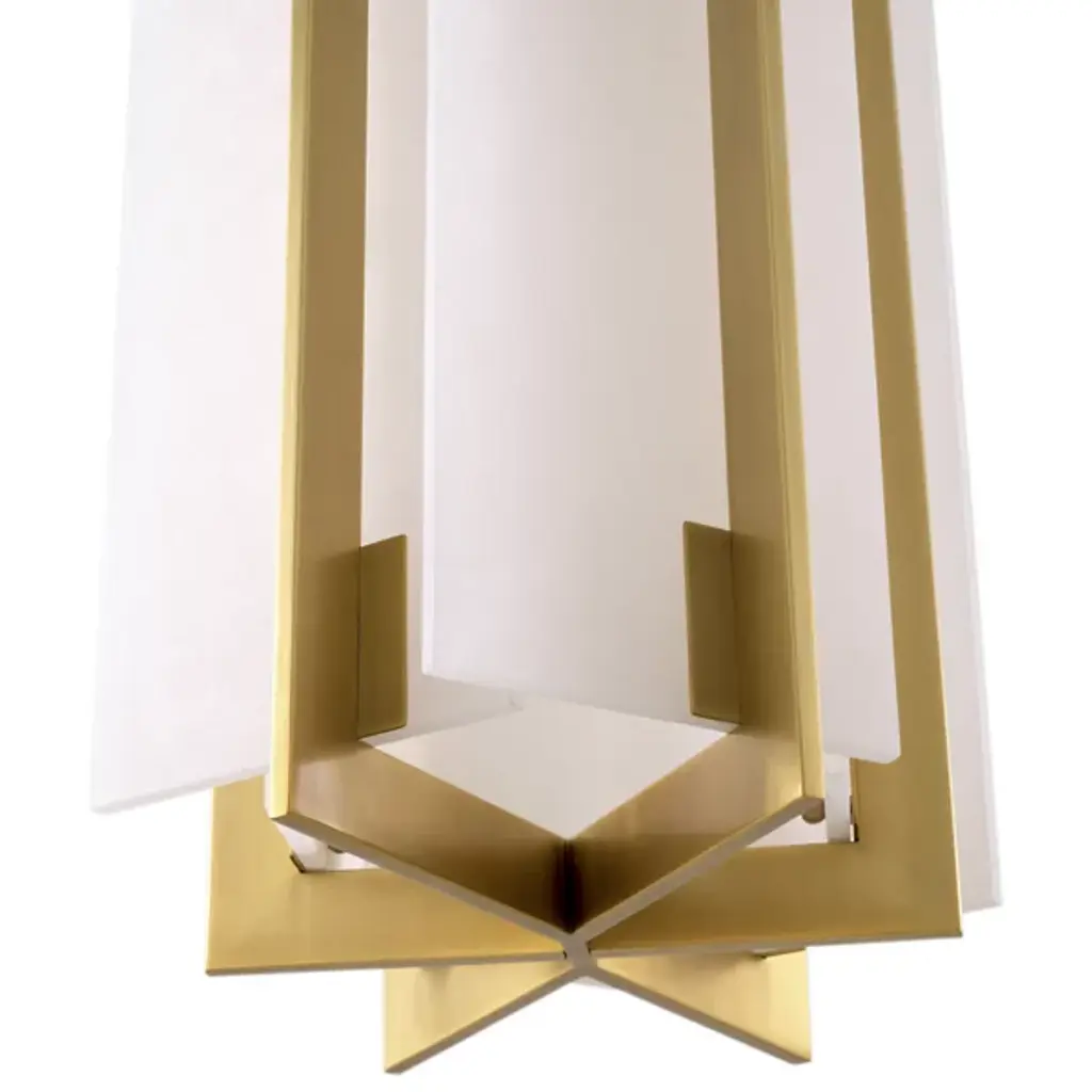 Give your home a Modern Artisanal appearance with the Lugano Pendant by Eichholtz. A link of chains extends from a canopy at your ceiling. Durable metal has been cut into sleek panes that intersect shades of glass at an angle. The resulting visual is a refined, partitioned look that gives the pendant an elegant composition. The base of the pendant is arranged in a modern crossing pattern. Frosted Bulbs within the glass shade diffuse light throughout your 21st-century living arrangement.