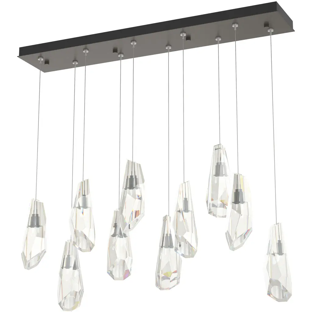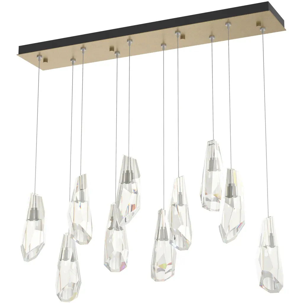 A linear multi-port fixture, the Luma 10-Light features two rows of large, stunning hand-cut and polished crystals that can be hung at the same level or staggered to suit the space. Customizable in length, as well, this graceful array of crystal-adorned lights creates a focal point in any room.