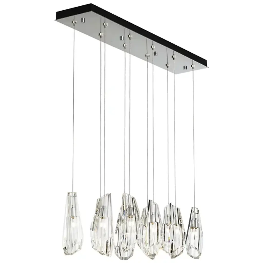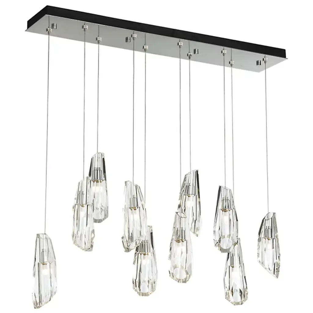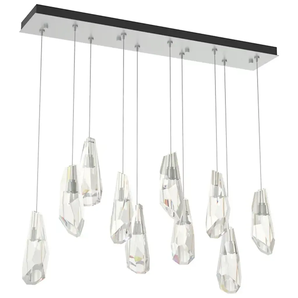 A luxurious, modern take on a classic crystal chandelier. With the Luma 10-Light Crystal Rectangular Multi-Light Pendant by Hubbardton Forge, you can hang each crystal element at the same level or stagger them for a totally custom look in a dining room or other living area. Each shade has numerous irregular facets, like a geometric teardrop. Enhanced by the warm glow of the petite lightbulbs housed within, the unique angles of the shades refract light and cast dazzling shards all around a room.