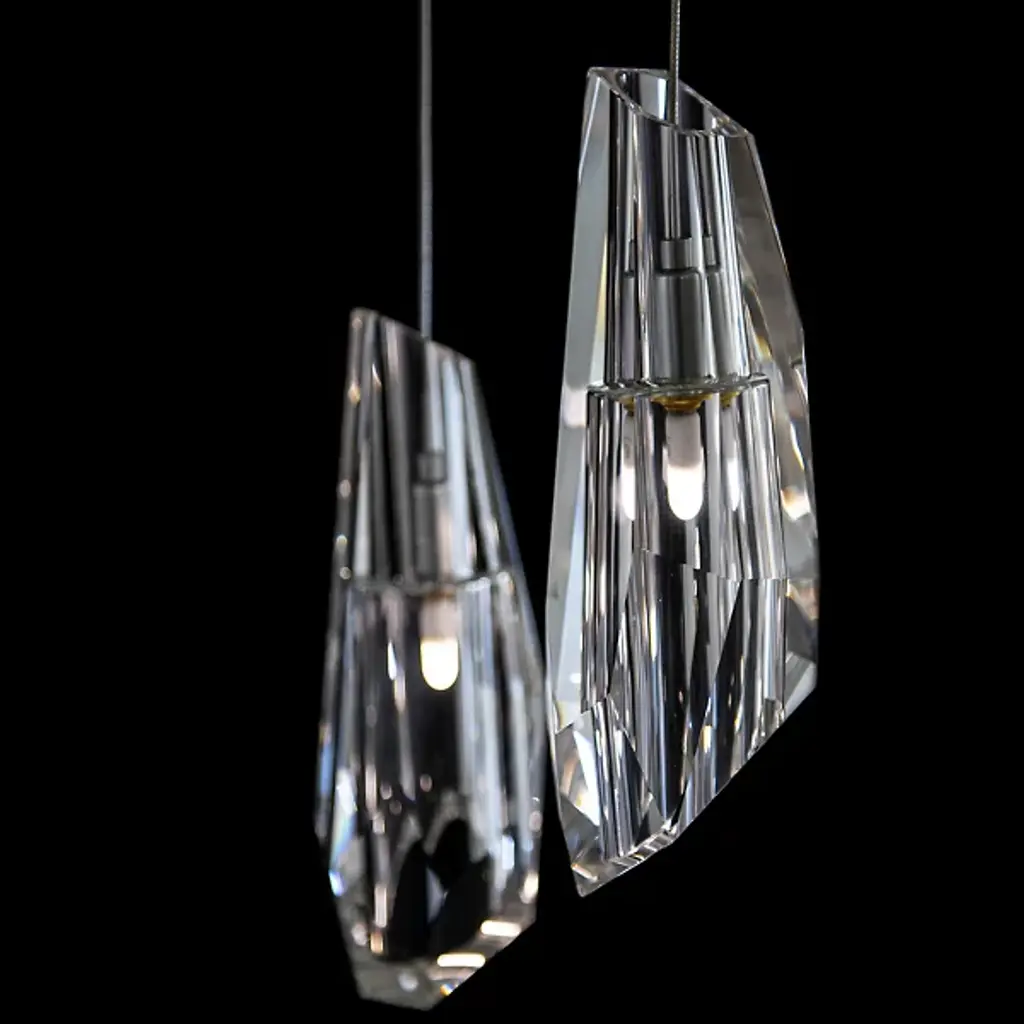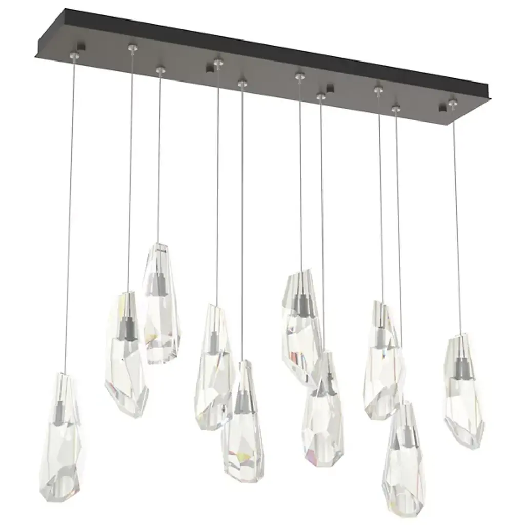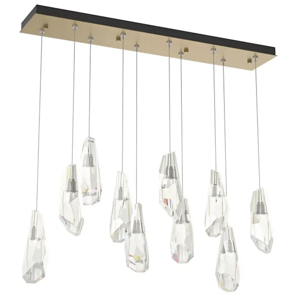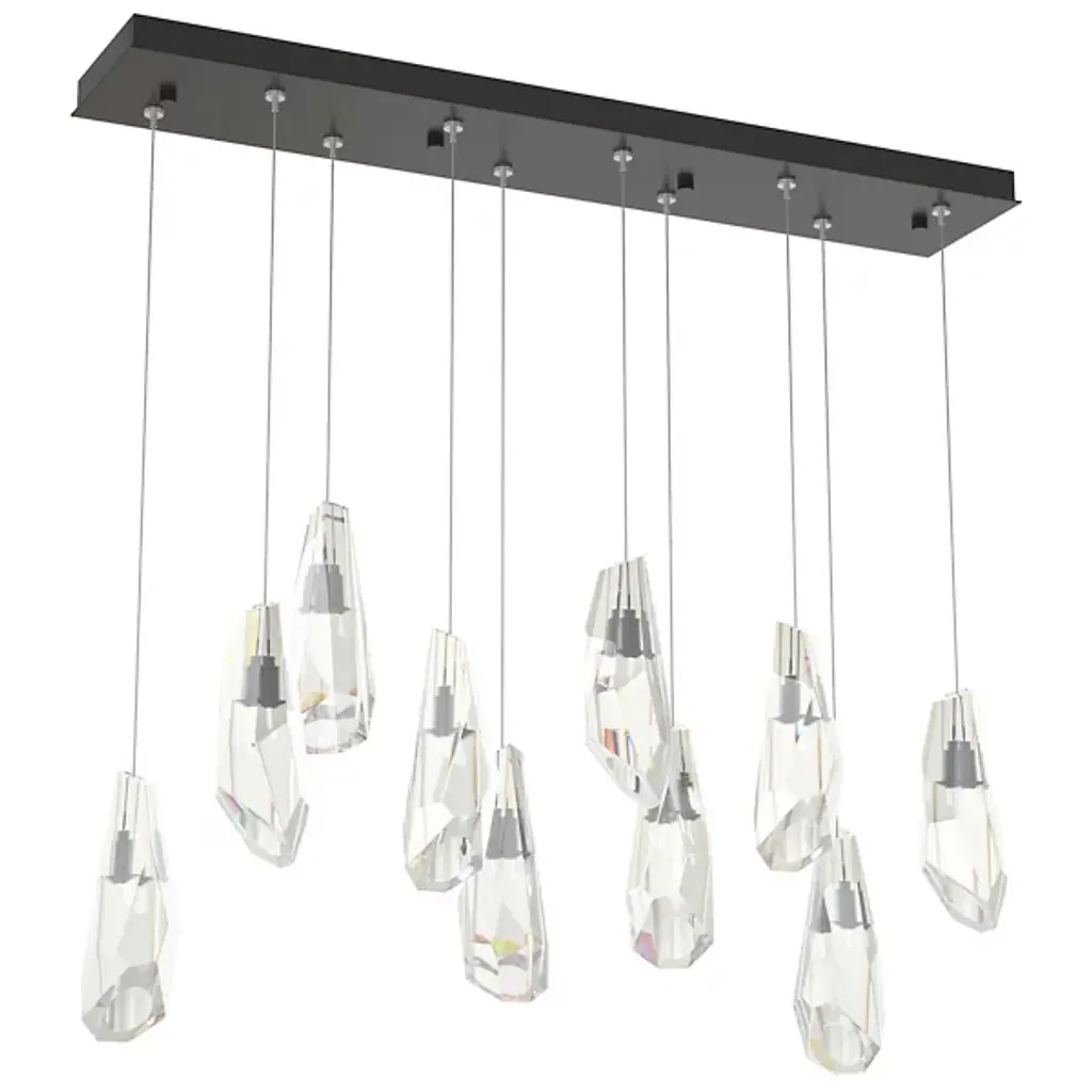A luxurious, modern take on a classic crystal chandelier. With the Luma 10-Light Crystal Rectangular Multi-Light Pendant by Hubbardton Forge, you can hang each crystal element at the same level or stagger them for a totally custom look in a dining room or other living area. Each shade has numerous irregular facets, like a geometric teardrop. Enhanced by the warm glow of the petite lightbulbs housed within, the unique angles of the shades refract light and cast dazzling shards all around a room.