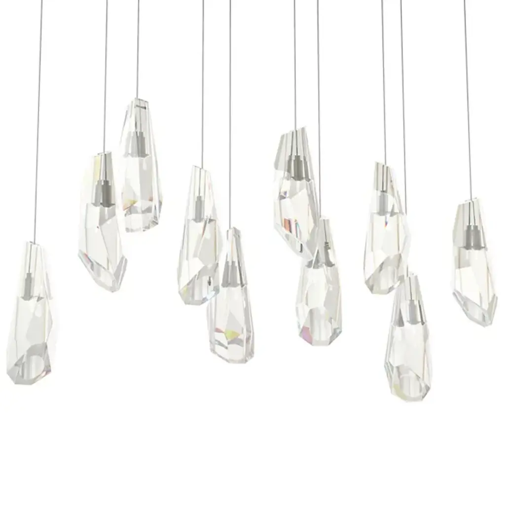A luxurious, modern take on a classic crystal chandelier. With the Luma 10-Light Crystal Rectangular Multi-Light Pendant by Hubbardton Forge, you can hang each crystal element at the same level or stagger them for a totally custom look in a dining room or other living area. Each shade has numerous irregular facets, like a geometric teardrop. Enhanced by the warm glow of the petite lightbulbs housed within, the unique angles of the shades refract light and cast dazzling shards all around a room.