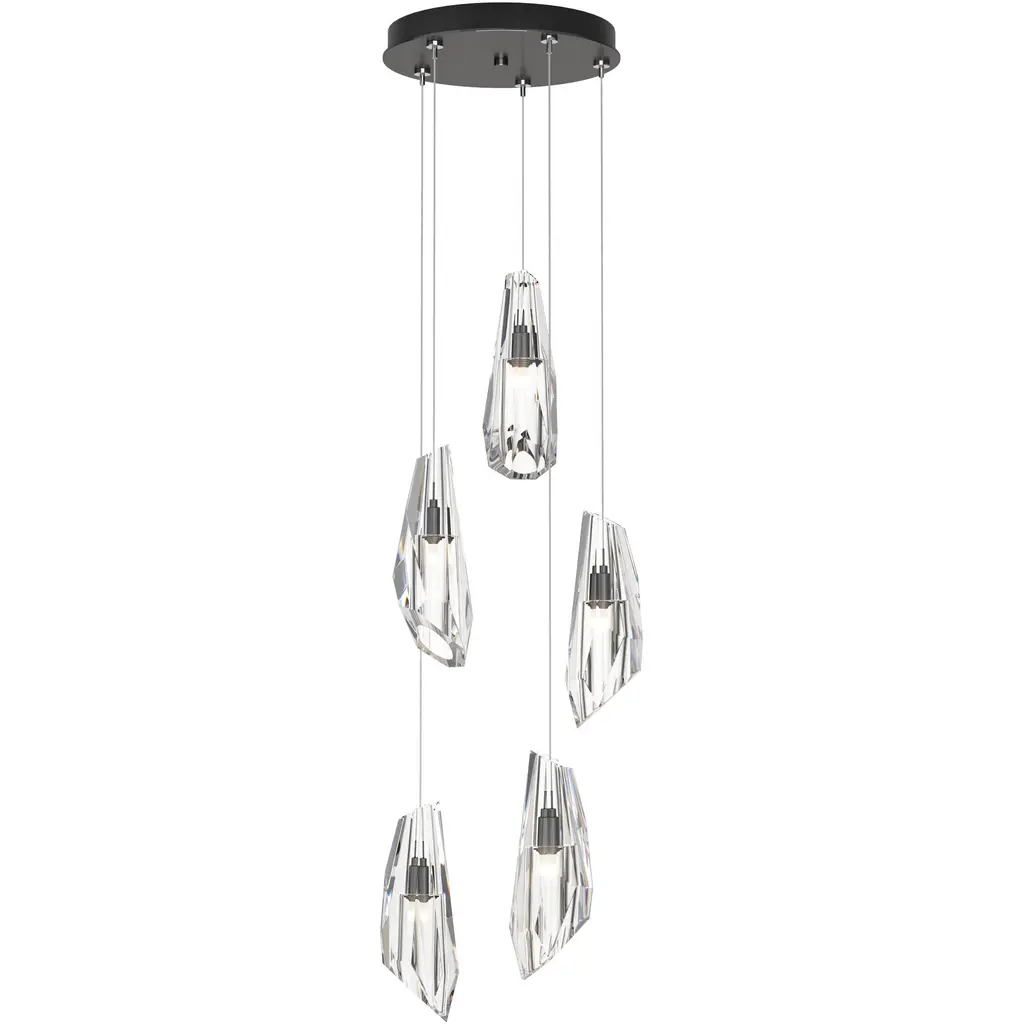 Large hand-cut and polished crystal shades adorn the stunning Luma 5-Light Pendant. A smaller multi-port chandelier with remarkable versatility thanks to the large adjustability of its cable heights, the Luma can serve as either a pendant or a dramatic semi-flush. With 5 Luma crystals, this elegant piece offers the ability to customize the length of each individual pendant to suit the space.