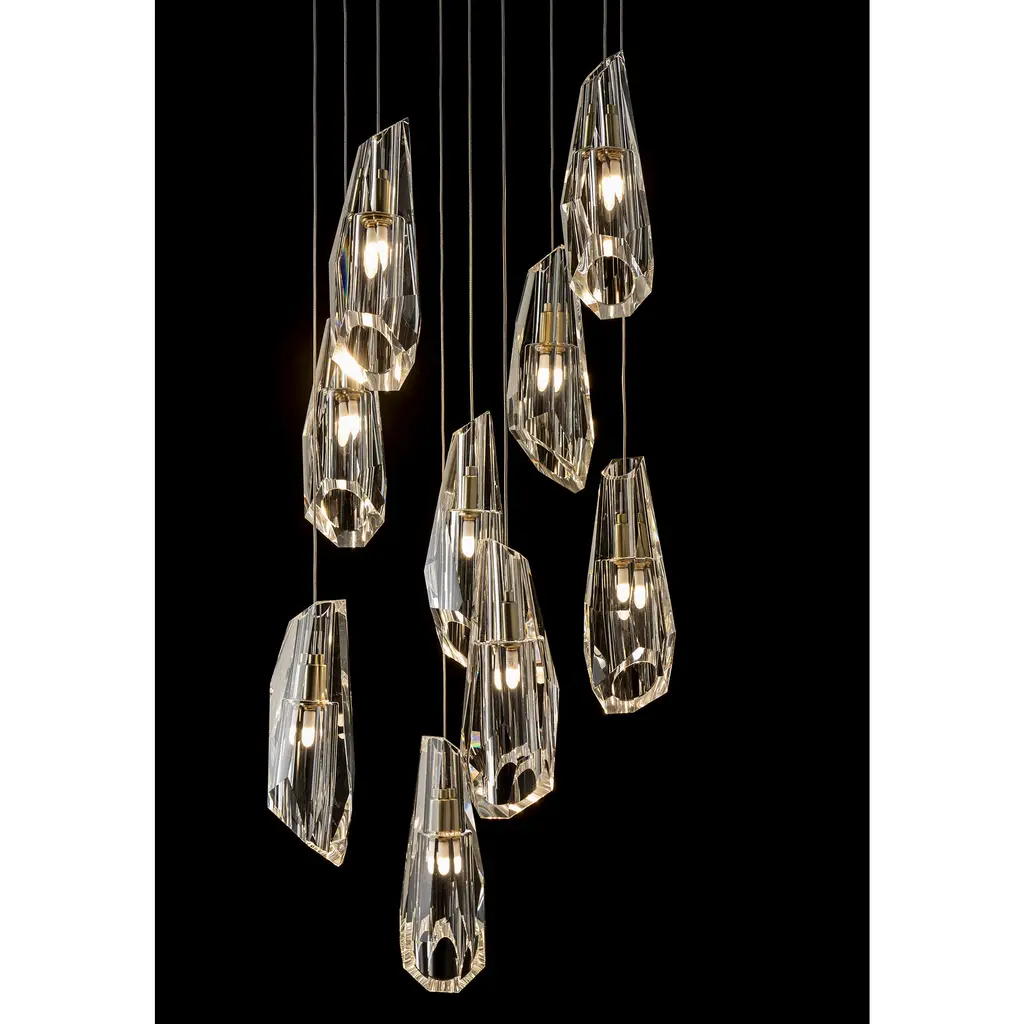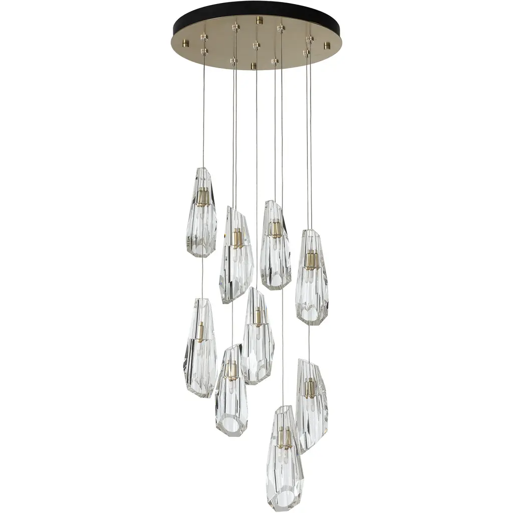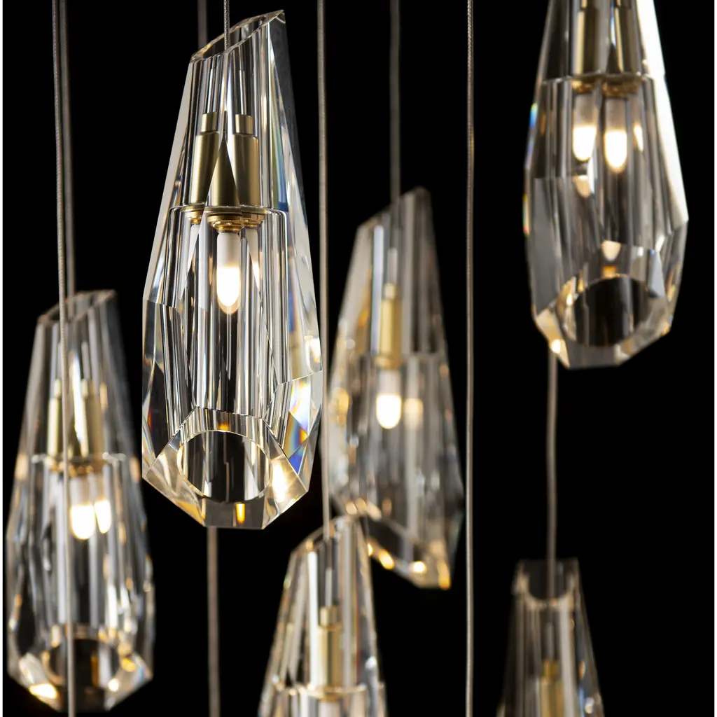Large hand-cut and polished crystal shades adorn this stunning multi-port chandelier. With 9 Luma crystals, this elegant piece offers the ability to customize the length of each to suit the space.