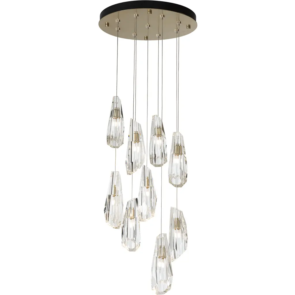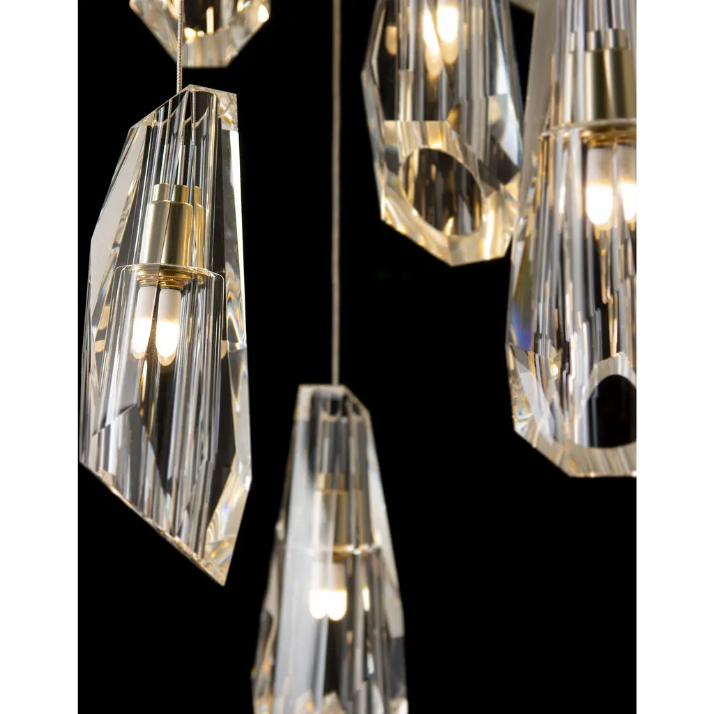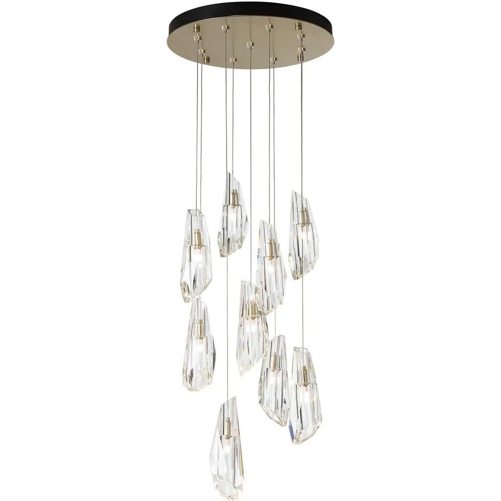 Large hand-cut and polished crystal shades adorn this stunning multi-port chandelier. With 9 Luma crystals, this elegant piece offers the ability to customize the length of each to suit the space.