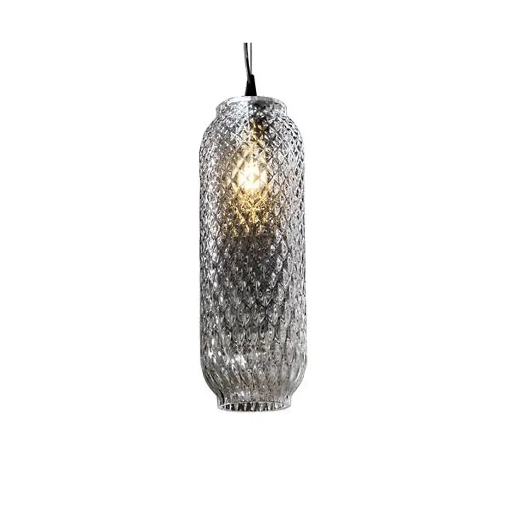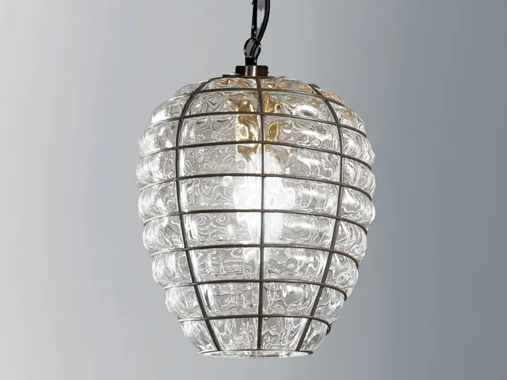 Expand your interior spaces with the airy lines and inviting design of the Lume Balloton Mini Pendant from Mazzega 1946. An inspired creation crafted by Giovanni Barbato, it uses a slender cable to suspend a single socket housing below the canopy, surrounded by an elongated vase-shaped shade of Murano glass with a puffy, pleated pattern that stretches across its outer surface. This design softens bright light to the sides while a small beam of light protrudes from a small opening in the base, extending a prominent pool of light below it.