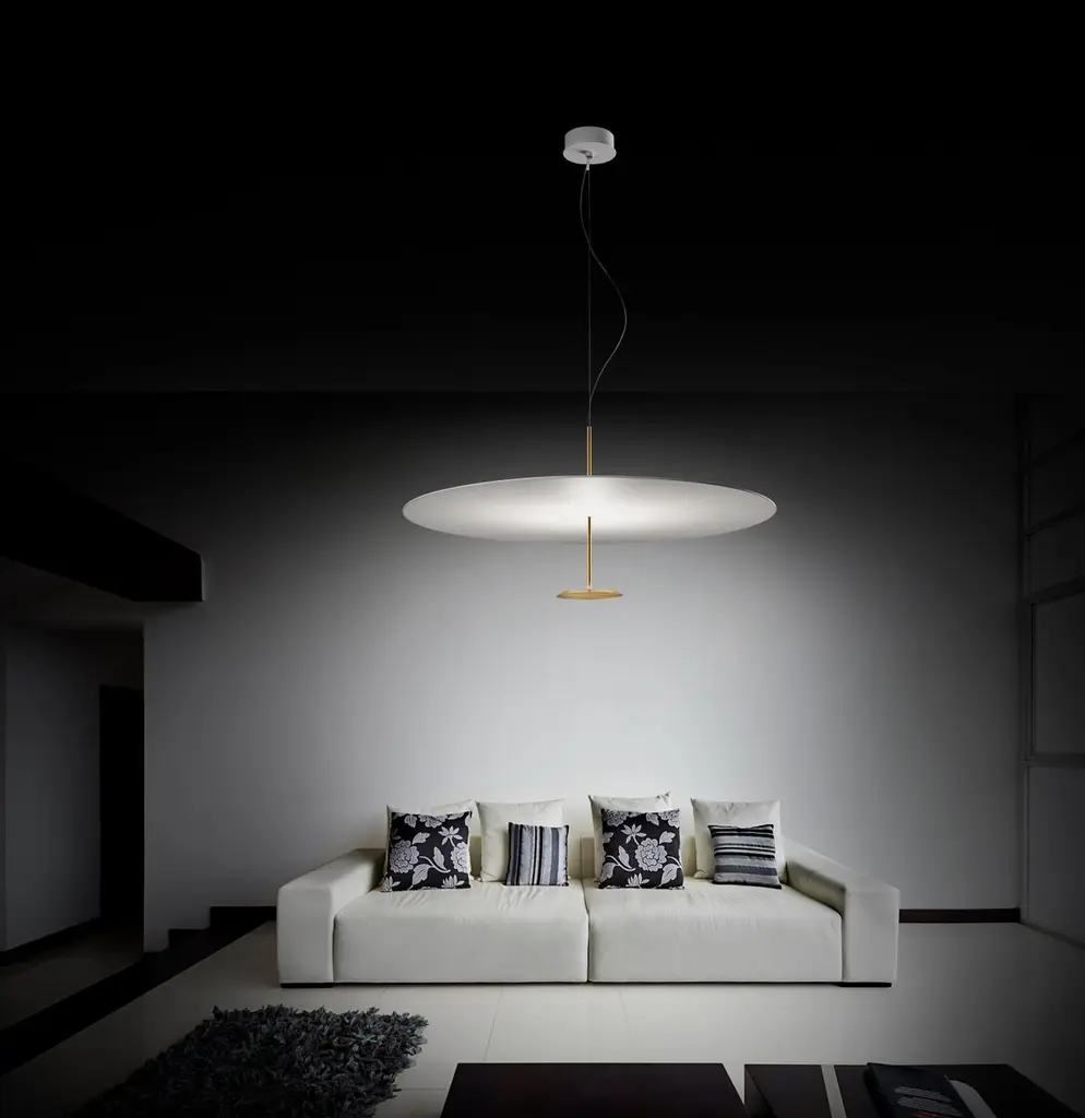 Suspended lamp for indirect lighting with a 40W LED source and diffused light optic system. aluminum structure with steel matt-painted reflector. This item is also available in a small and large size on 1stdibs.DimmableSource:1× 40W LED3000K / 3250lmCode:131MA13001XO.