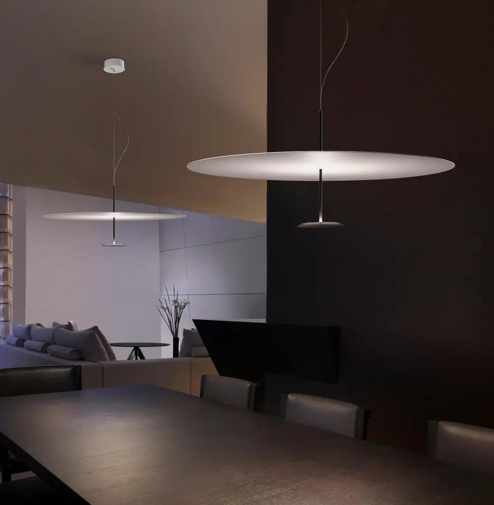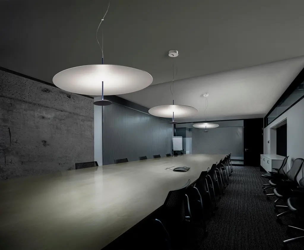 Suspended lamp for indirect lighting with a 20W LED source and diffused light optic system. aluminum structure with steel matt-painted reflector. This item is also available in a medium and large size on 1stdibs.DimmableSource:1× 20W LED3000K / 2350lmCode:130MA13050XO.