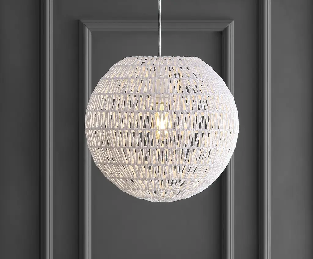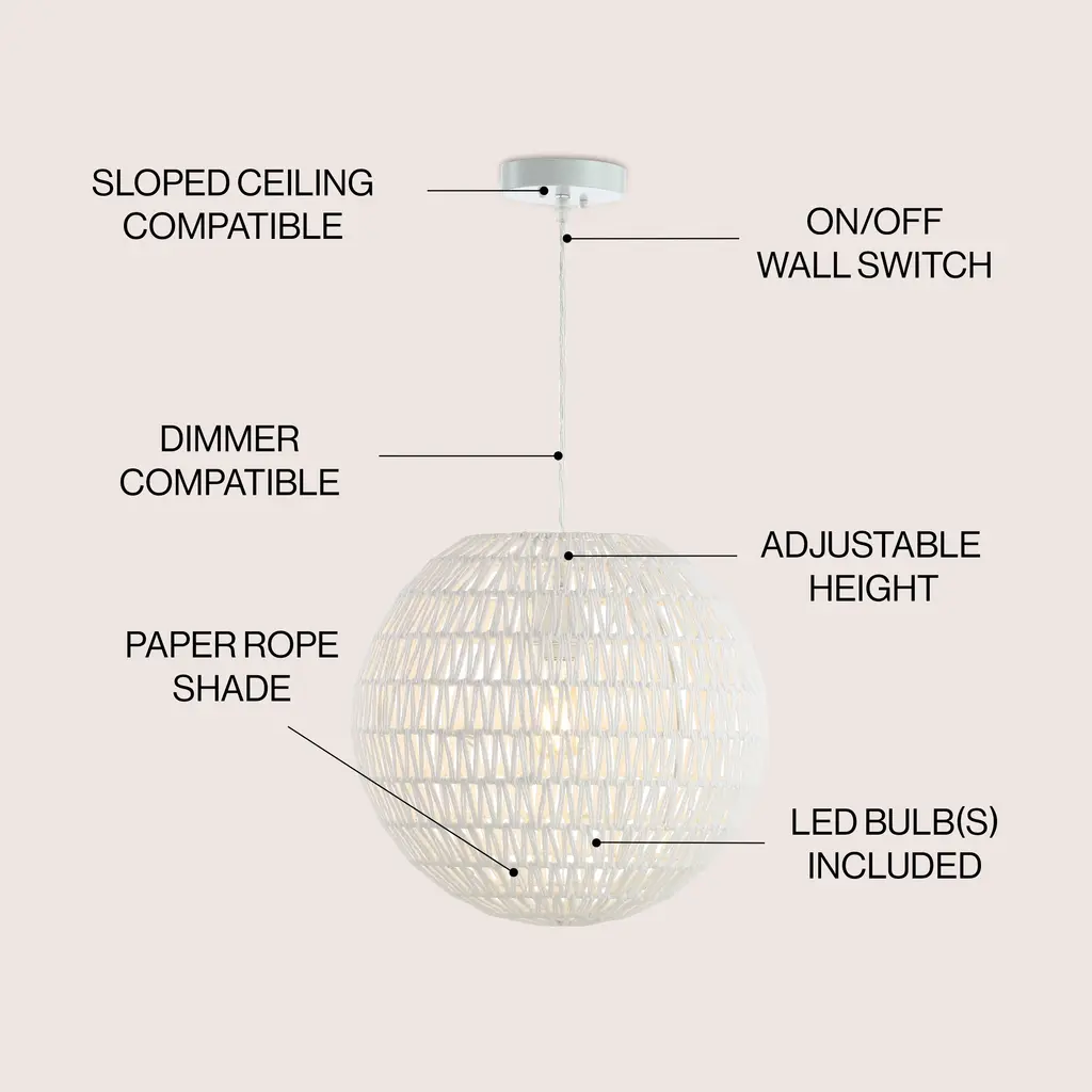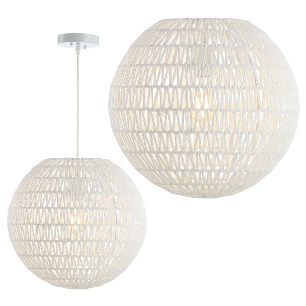 Modern design meets traditional craftsmanship in our white woven globe pendant. Made from paper wicker woven onto a sturdy metal frame, this ceiling fixture adds a Bohemian touch to your living room, bedroom, or dining room. Additionally, the drop is adjustable from 16" to 88", making it suitable for a ceiling of any height.