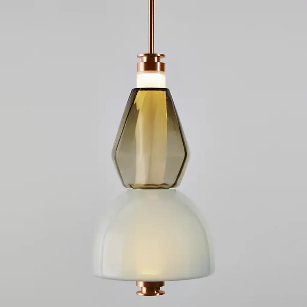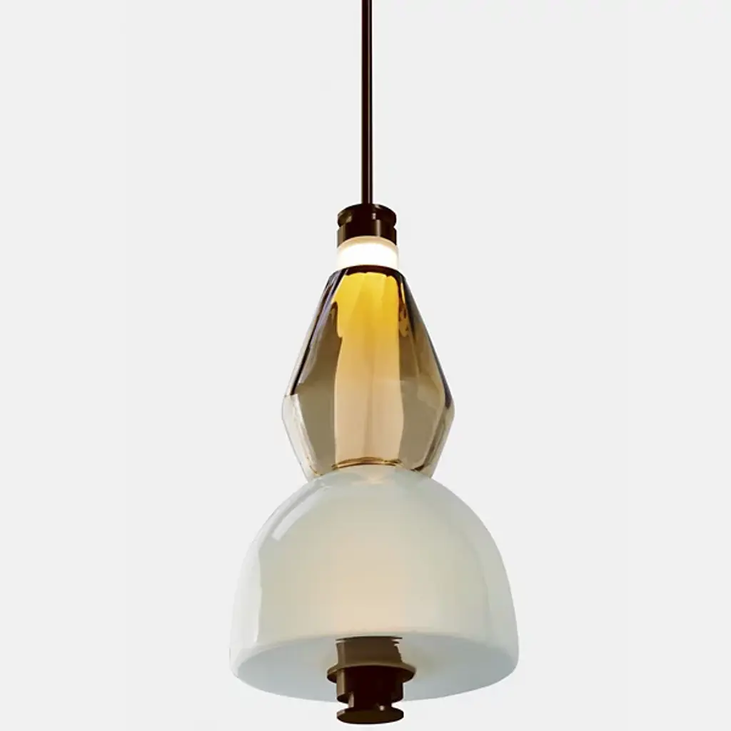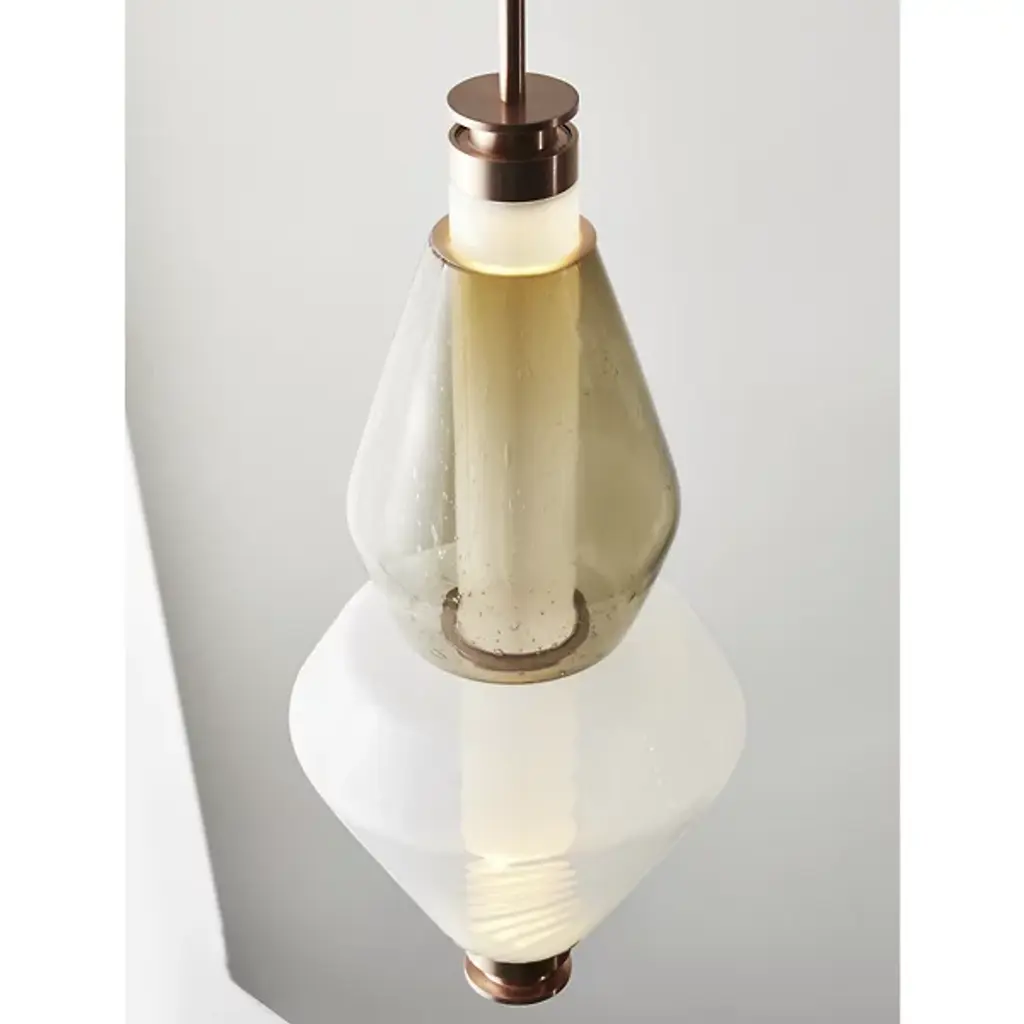 Bring elegance to your interiors with the decadent design of the LUNA Kaleido Small Pendant - B from Gabriel Scott. A stylish fixture created in honor of the lunar halo, it uses a robust steel canopy and single downrod to suspend LED lamping beneath a cylindrical diffuser. Two beads of glass are threaded around the diffuser, hand-blown to order, juxtaposing a slender upward-pointing cone with a wider, inverted cone with a beveled top. The beads are available in a profusion of textures and colors, adding a rich individuality to their surroundings.