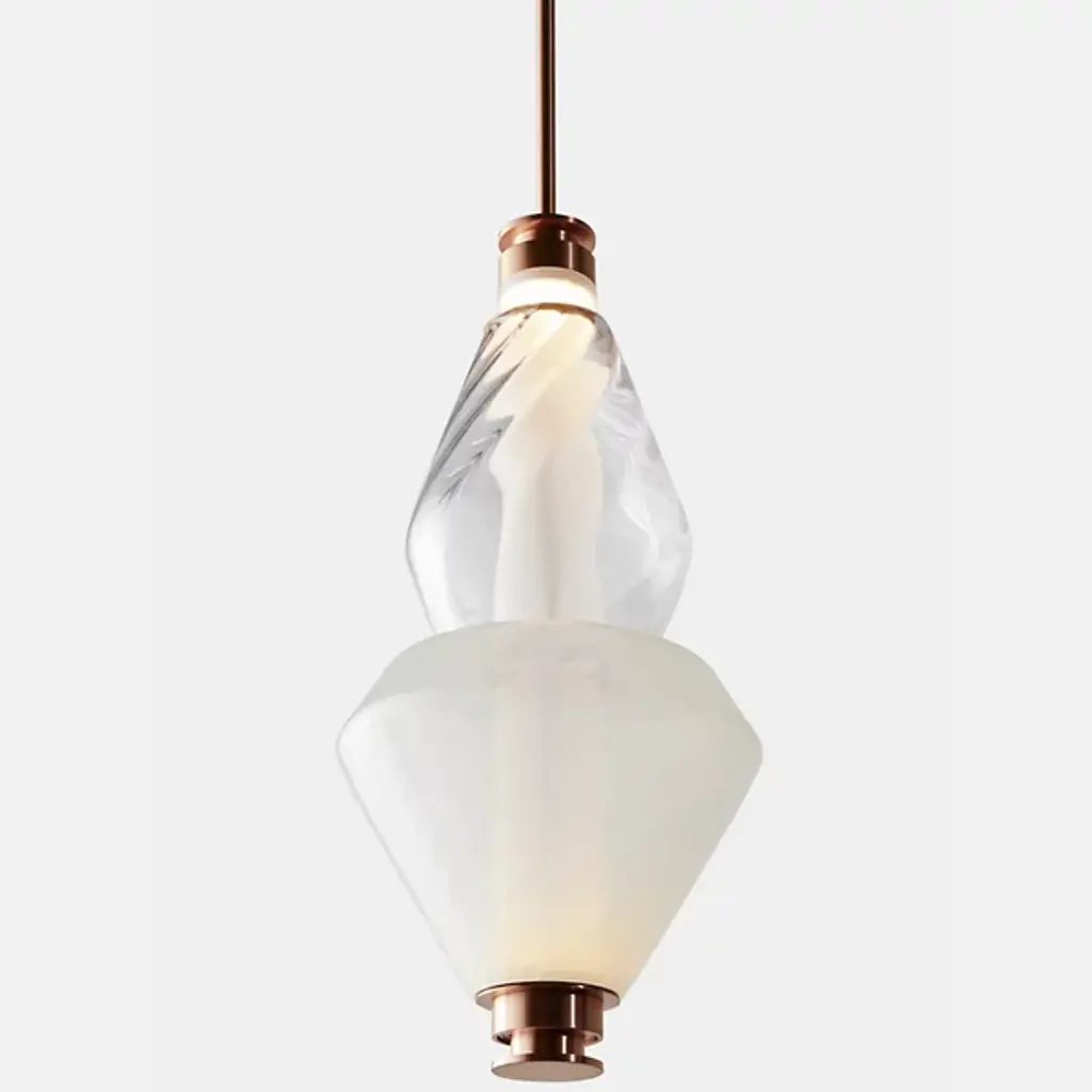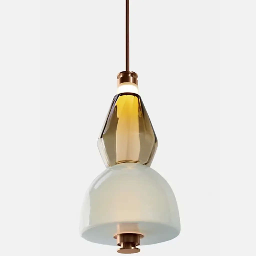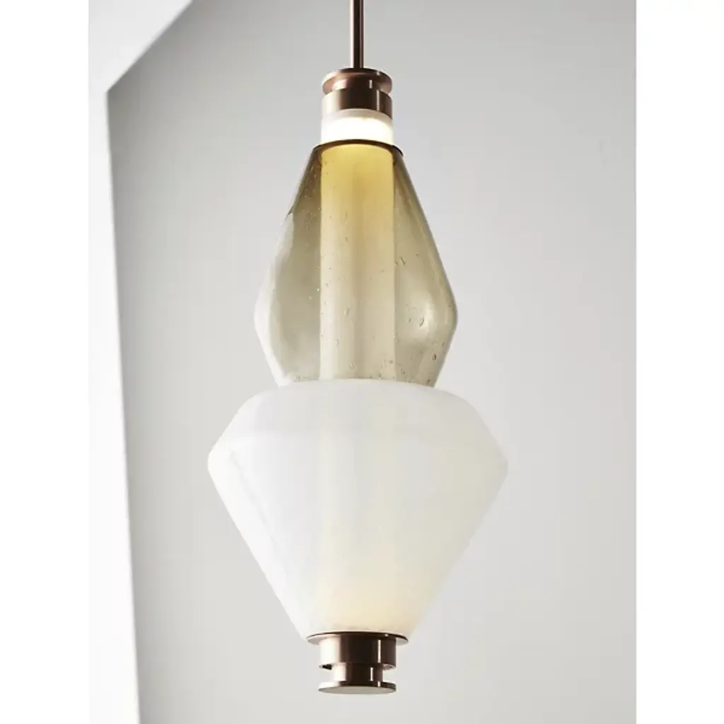 Bring elegance to your interiors with the decadent design of the LUNA Kaleido Small Pendant - B from Gabriel Scott. A stylish fixture created in honor of the lunar halo, it uses a robust steel canopy and single downrod to suspend LED lamping beneath a cylindrical diffuser. Two beads of glass are threaded around the diffuser, hand-blown to order, juxtaposing a slender upward-pointing cone with a wider, inverted cone with a beveled top. The beads are available in a profusion of textures and colors, adding a rich individuality to their surroundings.