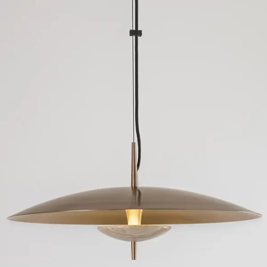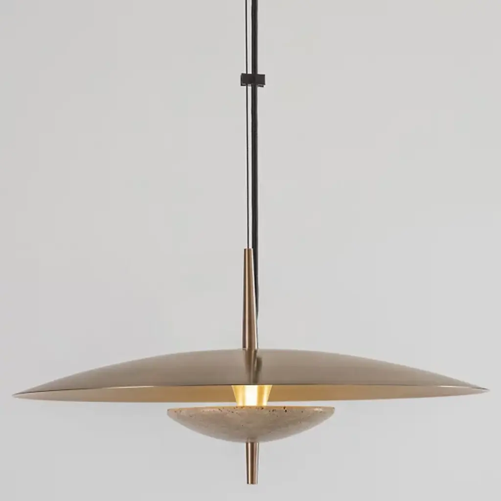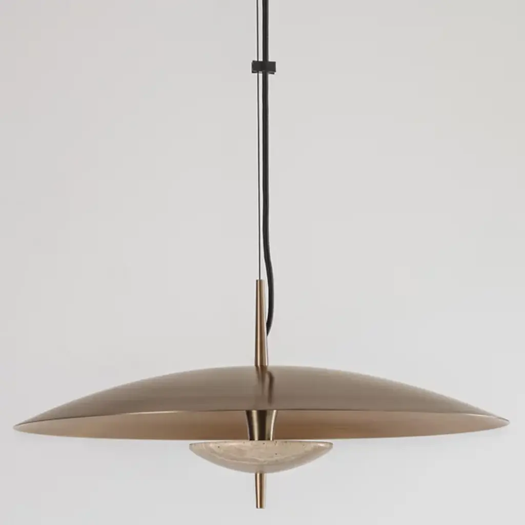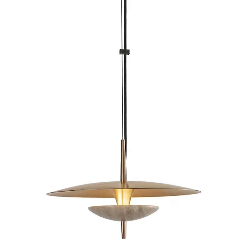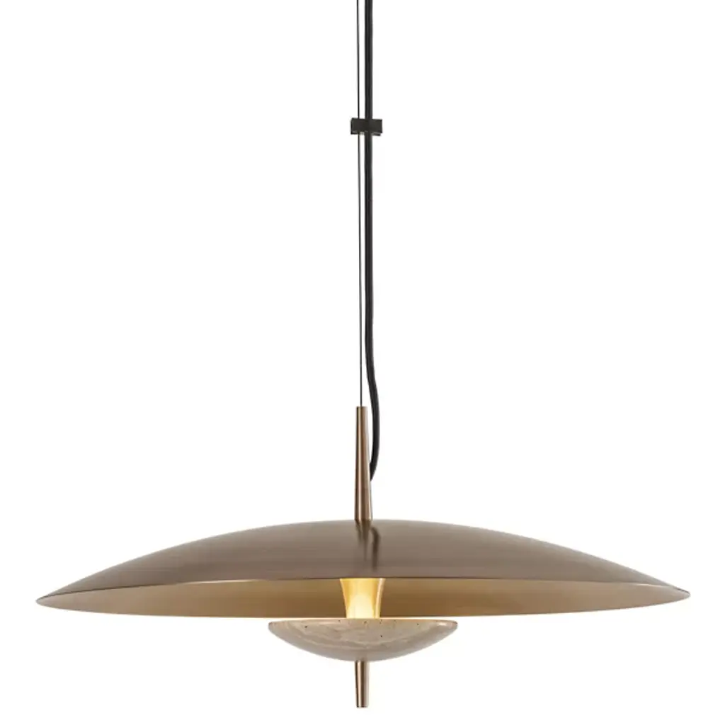Create a galactic aura within your living space. The Luna LED Pendant from J. Adams & Co. lives up to its name. An elegant shade of brass has been smoothened into a saucer formation to serve as the resting place for a luminous bulb. The shade’s flat surface allows light to easily emanate over your contemporary living arrangements. The bulb is encased by a pillar fixed between the underside of the saucer and the top of a carved stone plate. The plate of stone continues the theme of space exploration as the texture calls to mind the rocky surface of the moon.