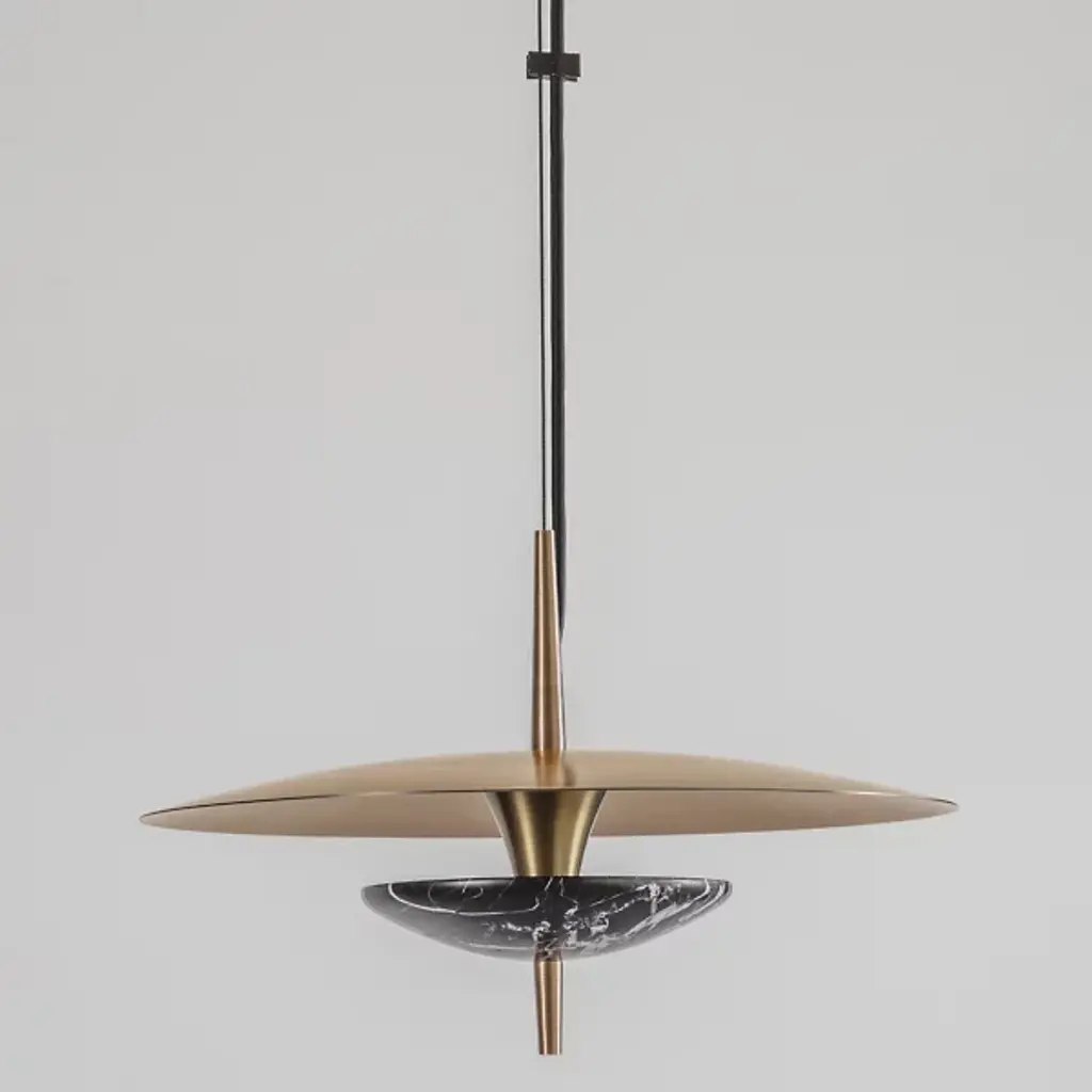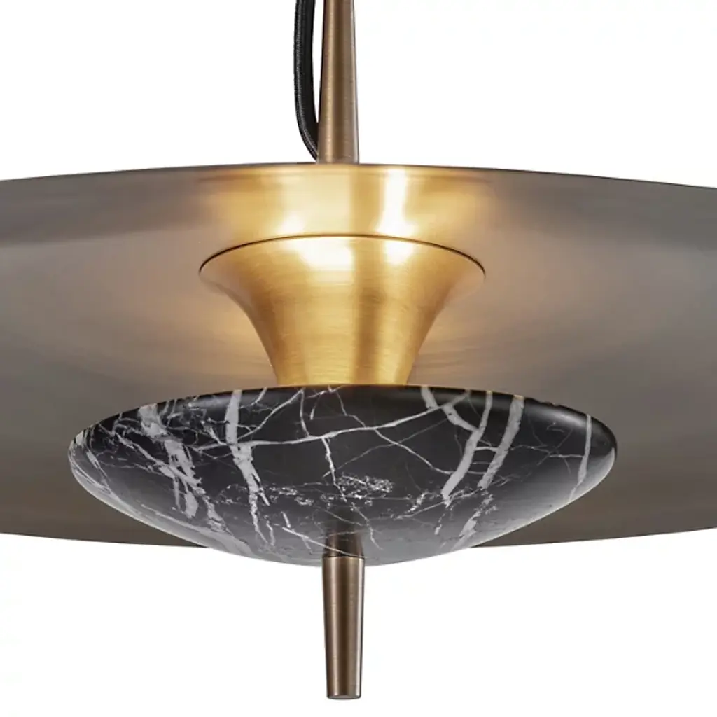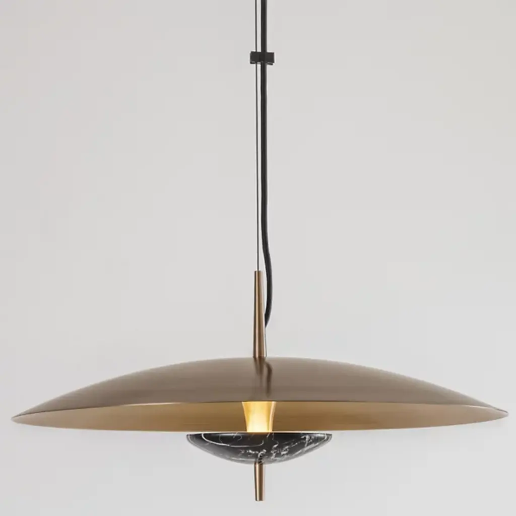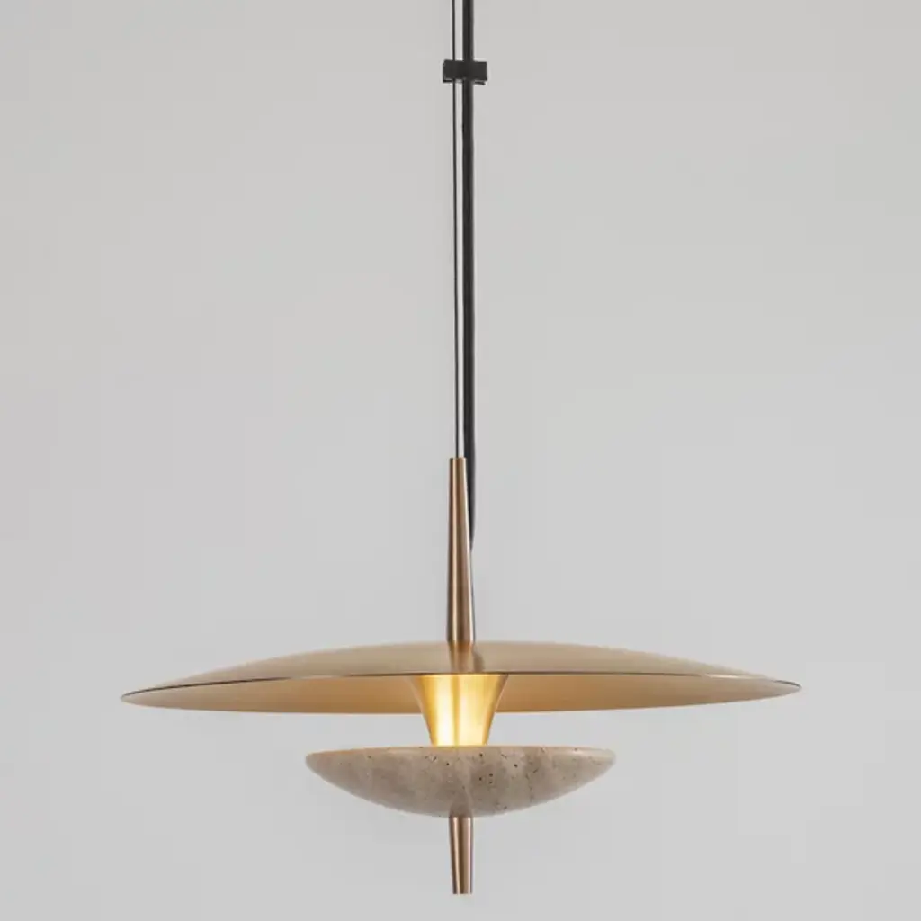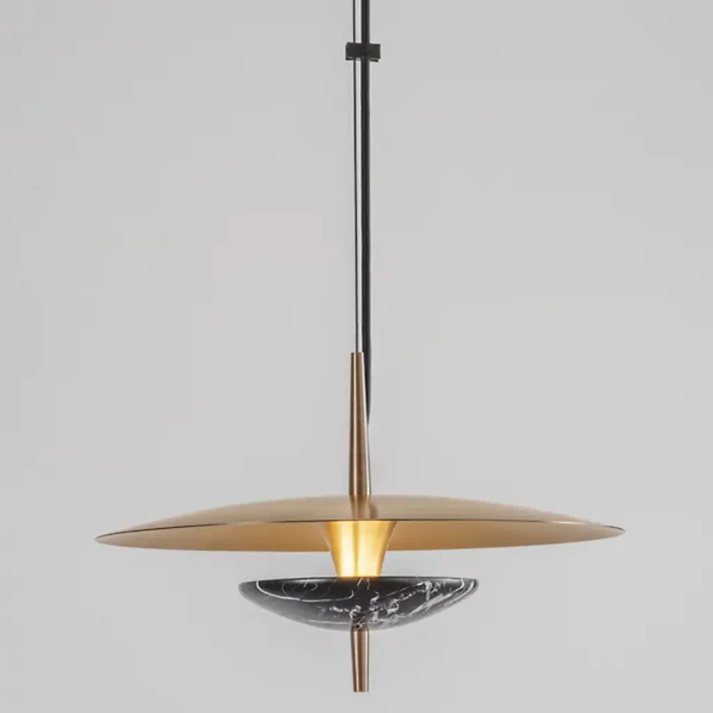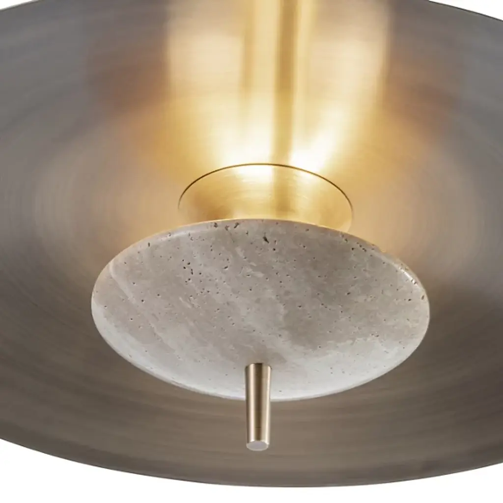 Create a galactic aura within your living space. The Luna LED Pendant from J. Adams & Co. lives up to its name. An elegant shade of brass has been smoothened into a saucer formation to serve as the resting place for a luminous bulb. The shade’s flat surface allows light to easily emanate over your contemporary living arrangements. The bulb is encased by a pillar fixed between the underside of the saucer and the top of a carved stone plate. The plate of stone continues the theme of space exploration as the texture calls to mind the rocky surface of the moon.