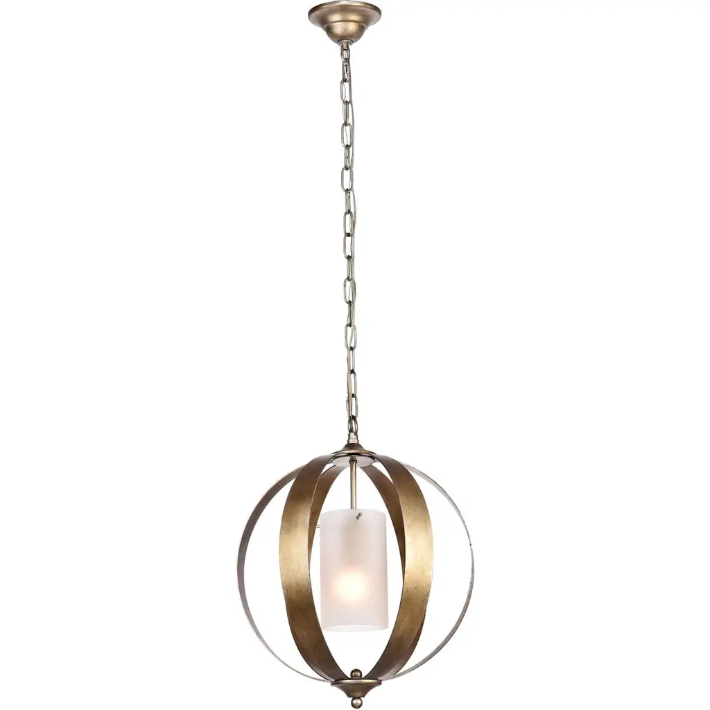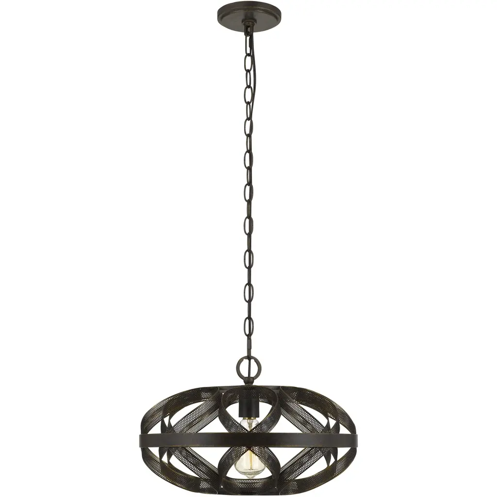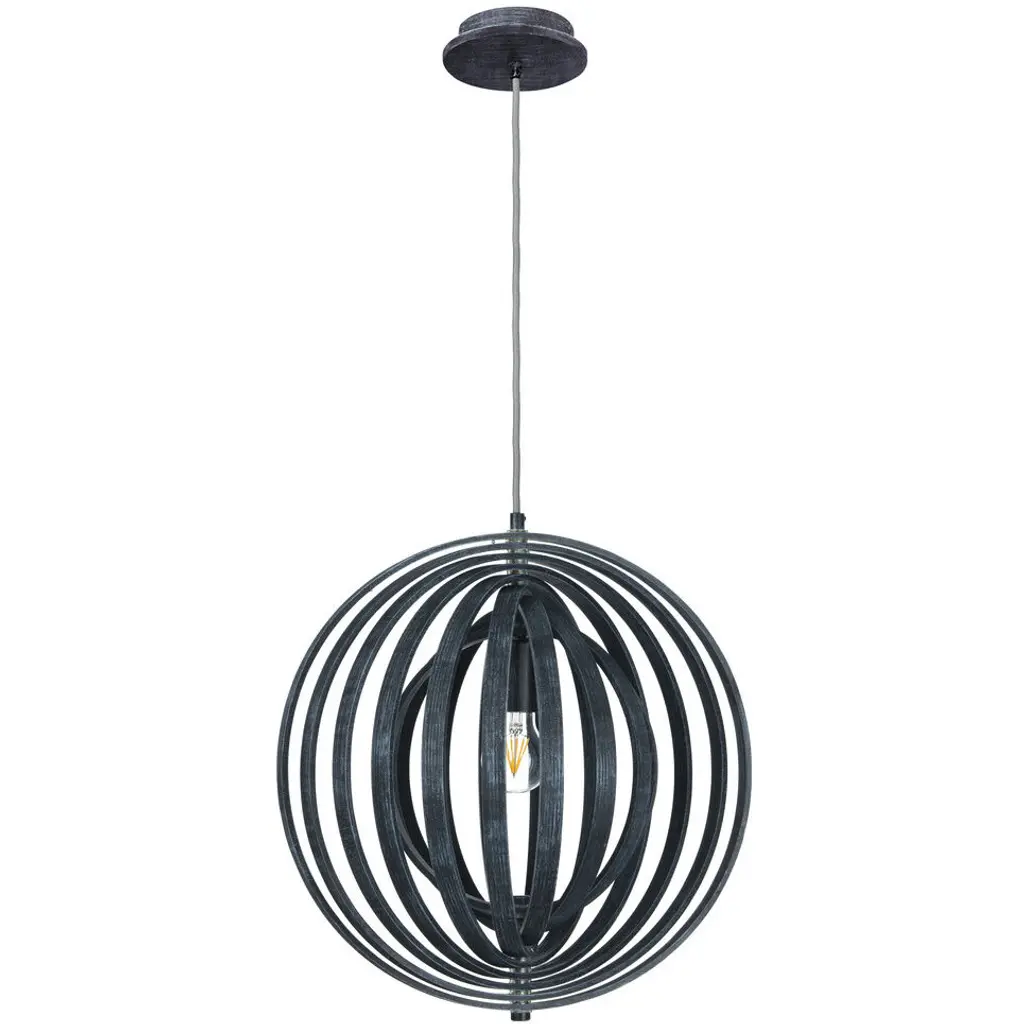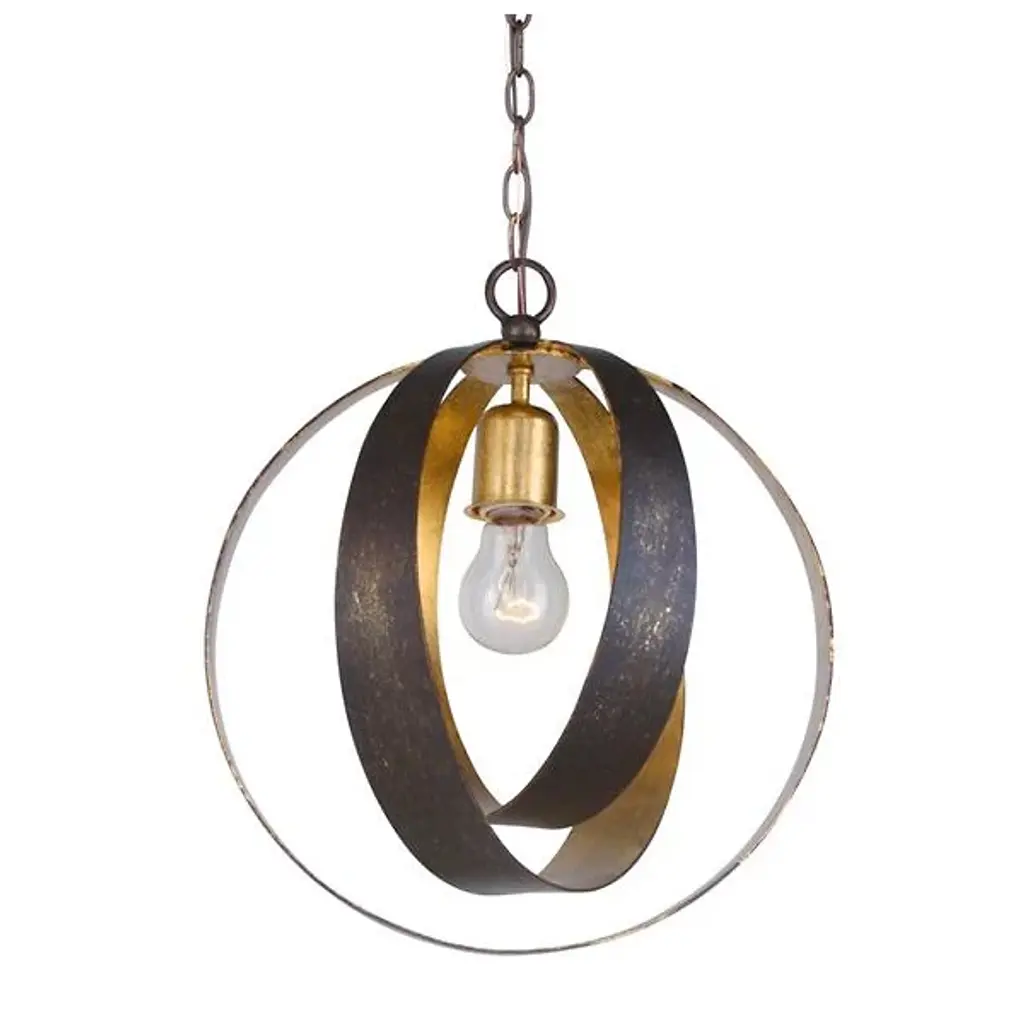 The Crystorama Luna Sphere Pendant is influenced by Industrial Design, made of 3 Wrought Iron rings in varying sizes to form a sphere shape. The two tone contrasting finish adds a unique quality with plenty of juxtaposition. The illumination from the single exposed bulb gives a beautiful gleam to the inside finish, as well as illuminating the surrounding space with an industry derived aesthetic.
