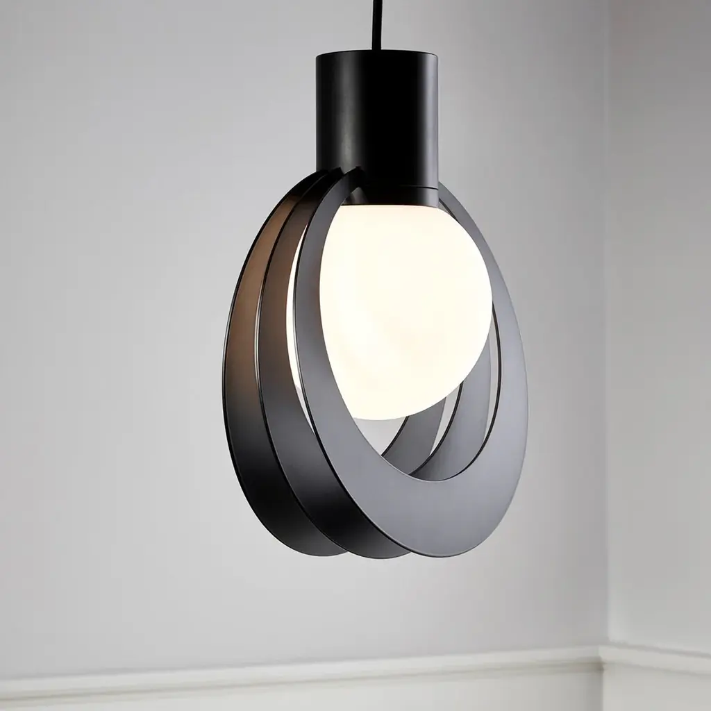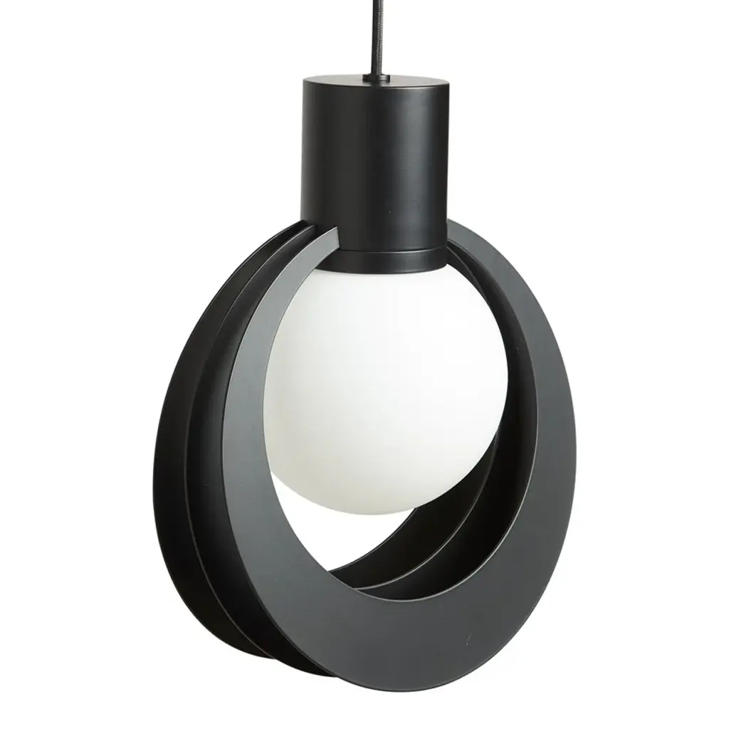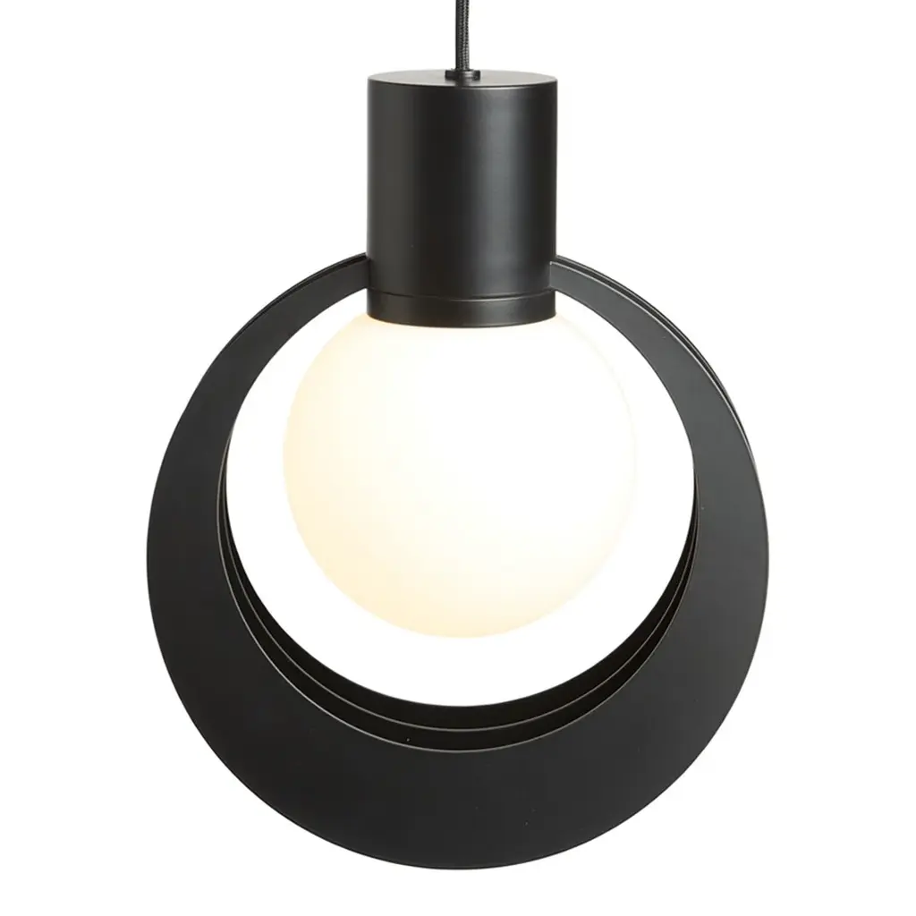 The Lunar pendant is an elegant combination of soft light and sleek black metal inspired by the night sky. Embracing modern architectural design while honouring the ancient astronomical observations. The three halos circling the opal glass sphere illustrate the cycle of waning and waxing moons and create an impression of a glorious full moon. Viewing the design from different angles, the moons phases will change and throw harmonious shadows. The minimalistic design and sculptured form make Lunar a delicate, distinctive piece above the dining or coffee table, both individually and in clusters.