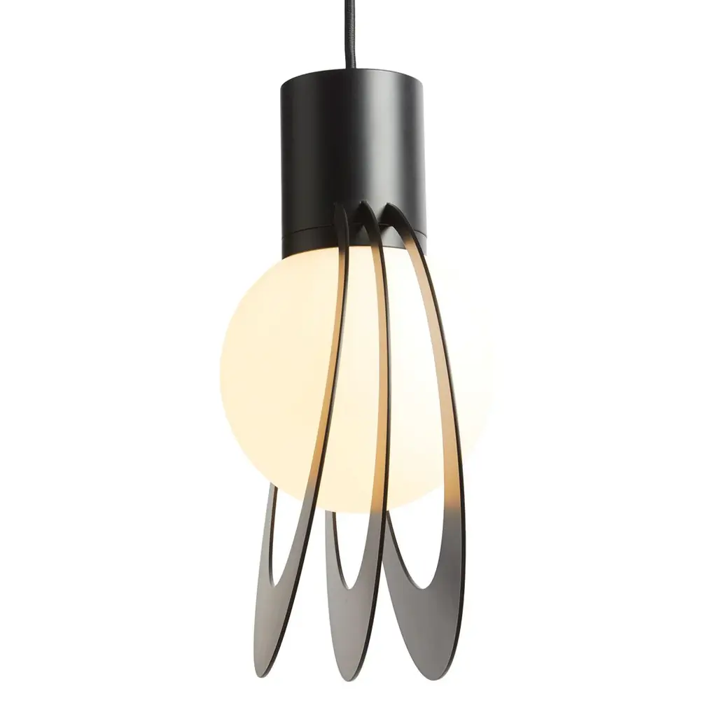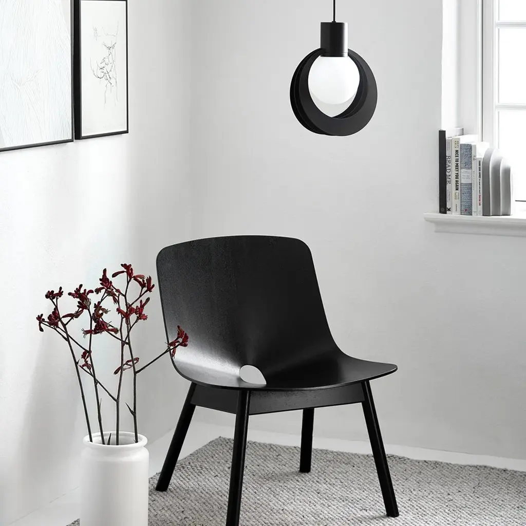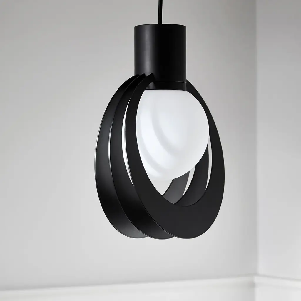 The Lunar pendant is an elegant combination of soft light and sleek black metal inspired by the night sky. Embracing modern architectural design while honouring the ancient astronomical observations. The three halos circling the opal glass sphere illustrate the cycle of waning and waxing moons and create an impression of a glorious full moon. Viewing the design from different angles, the moons phases will change and throw harmonious shadows. The minimalistic design and sculptured form make Lunar a delicate, distinctive piece above the dining or coffee table, both individually and in clusters.