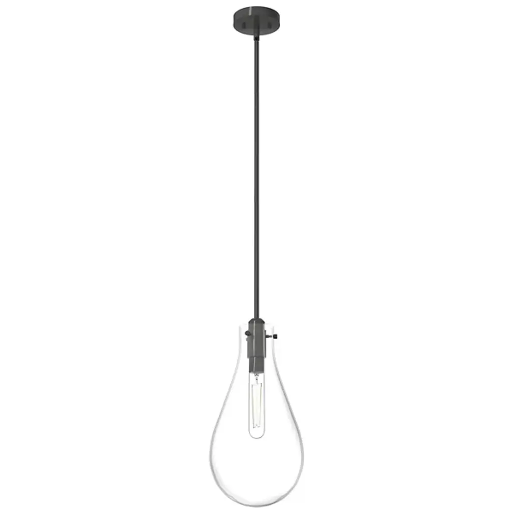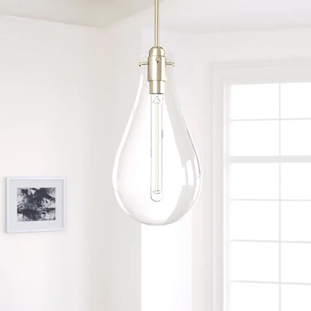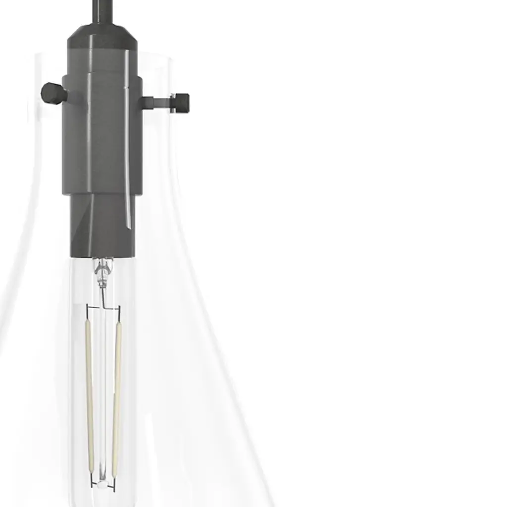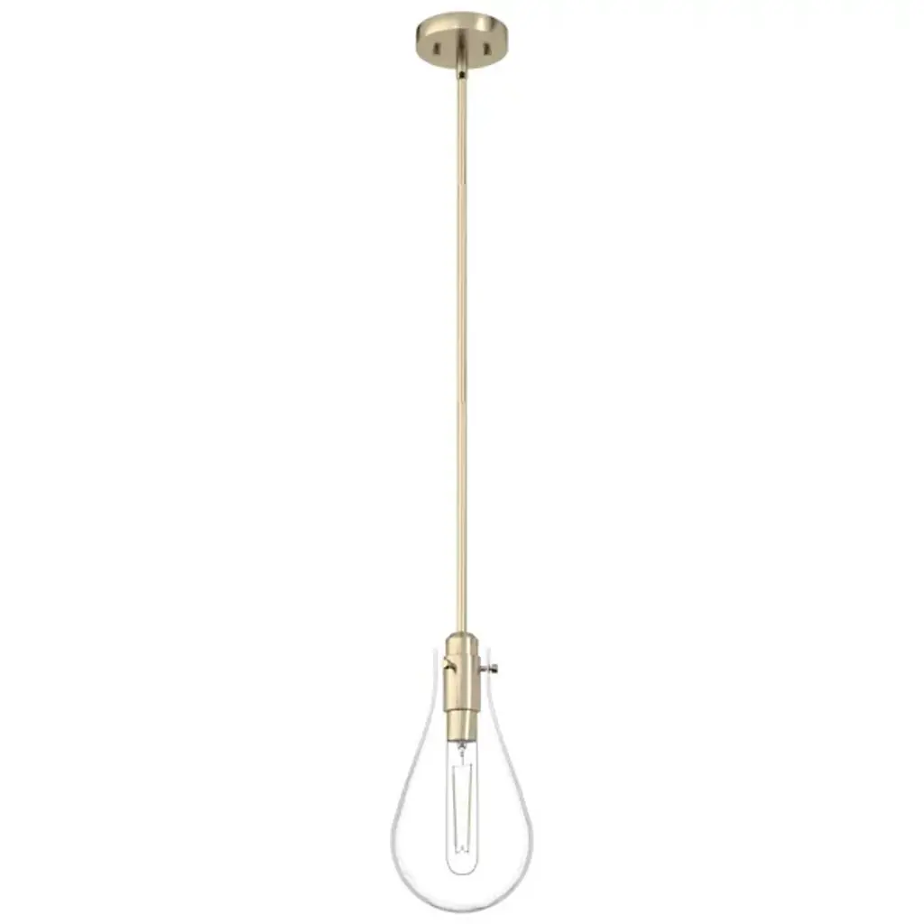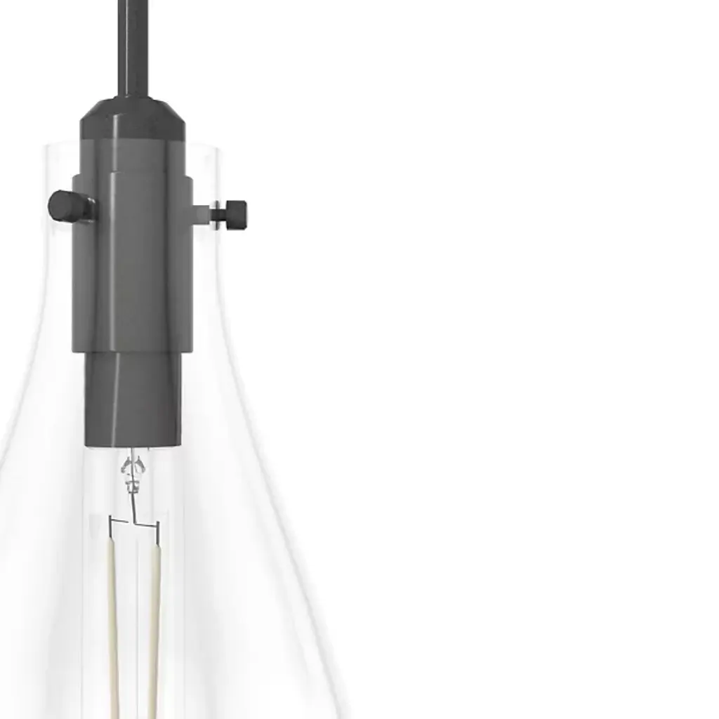 Seductive and suggestive. The Lundin Pendant from Hunter Fans brings a clean feeling to the room through its delicate silhouette and crisp, see-through light source. The contemporary design pairs beautifully with the refined setting. Its slender down rod suspension and compact canopy invite a series placement over a table. The eyes lock into the pendant's handsome metal hardware that suggests industrial lighting classics. A clear glass shade flows down with a rounded form evocative of the classic bulb. The actual bulb nestles inside, adding crisp reflections to the glass. The bulb's light glazes table surfaces below while producing an ambient glow.