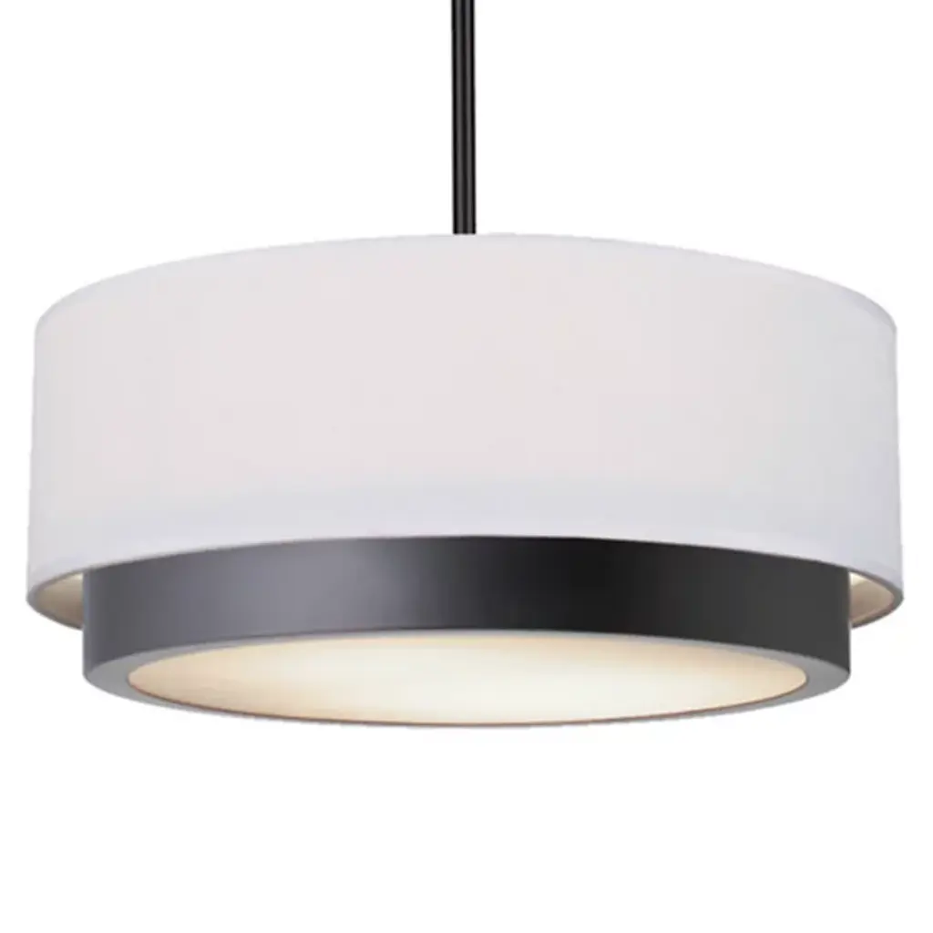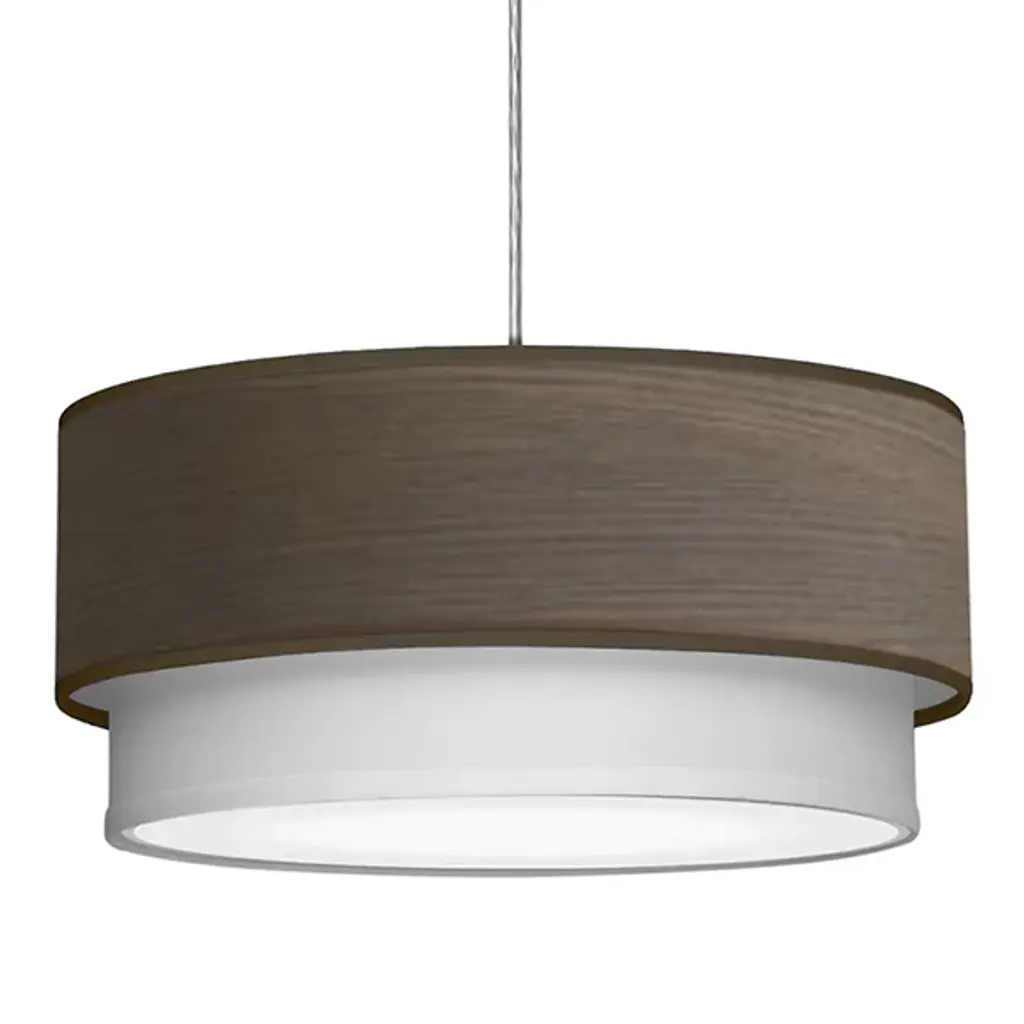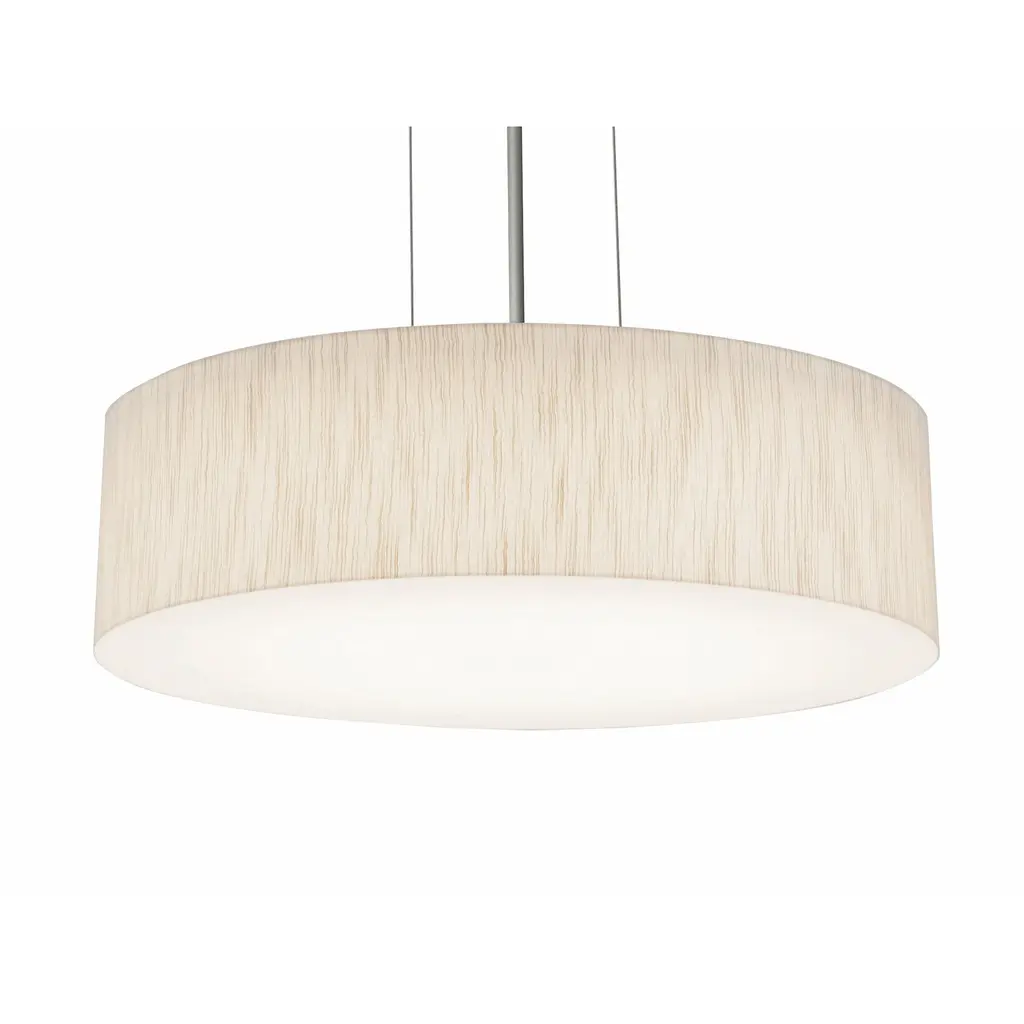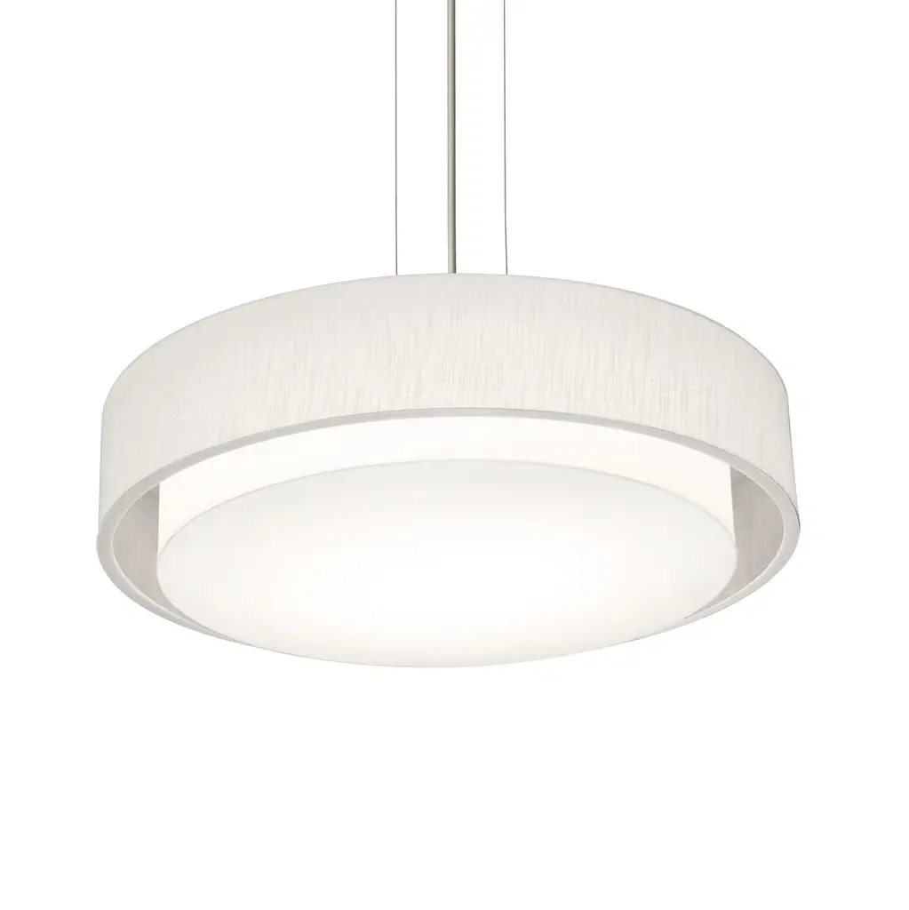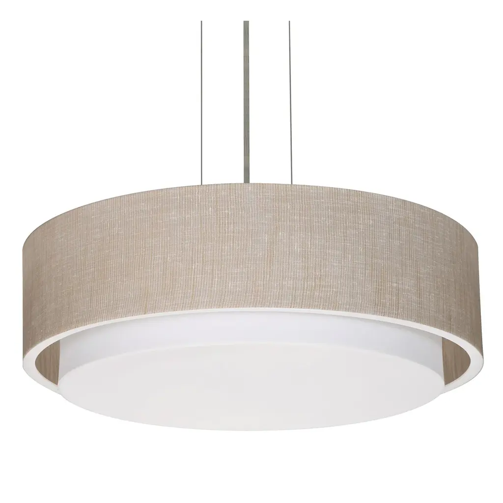 Composed with great precision, Luther Grande Pendant from Seascape Lamps takes simple geometry and doubles it up in a depth-filled design. Your living spaces will appreciate the low-profile quality of its metal canopy and the adjustability of its suspension. Like a pair of halos, two drum forms float alongside each other with an elegant contrast to their surfaces. The white linen shade accentuates the color and quality of the outer silk shade. An acrylic diffuser plate at the base wraps the piece up with its light mellowing properties. The piece catches pockets of ambient light while pushing out a grand aura of illumination.
