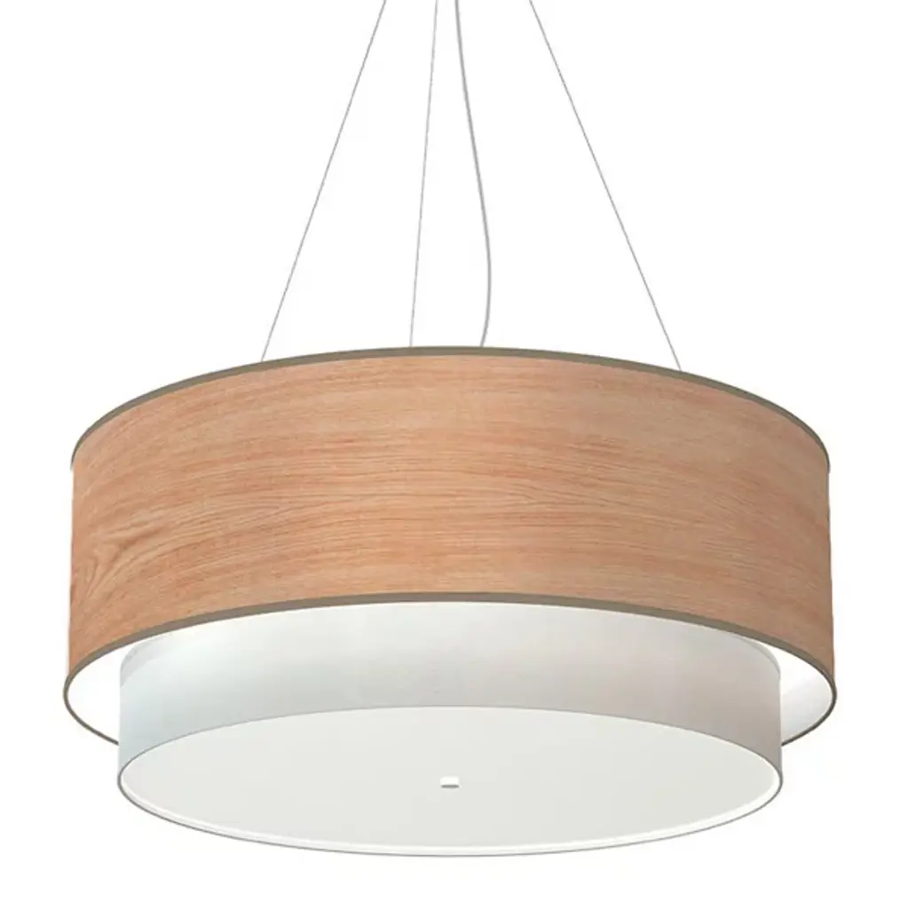 Introduce a soothing and inviting layer of light to your home or hospitality spaces with the Luther Grande Photo Veneer Pendant from Seascape Lamps. A large and welcoming modern piece, this oversized drum pendant hangs from a set of thin wires and consists of a set of rounded shades. The larger upper piece is made of smooth wood and gently nests the lower, fabric shade. Four bulbs rest within the material, emitting a bright glow through the acrylic diffuser that instantly shapes the atmosphere of the space around it.