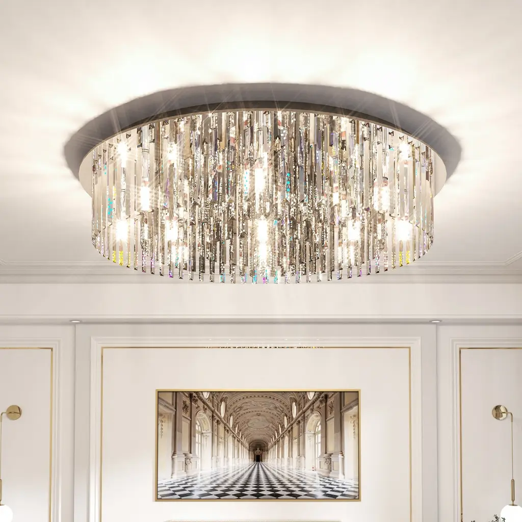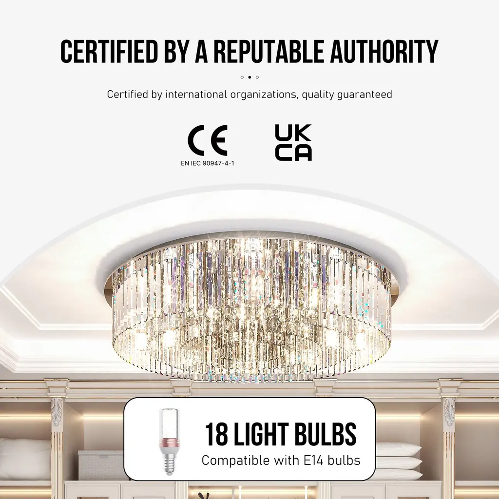 Absolutely fancy crystal chandelier lamp, it is modern contemporary and reflects light beautifully throughout the spaces. Hanging suspended in the middle of a living room, kitchen, or dining room can truly elevate the ambiance of the rooms. Not only does it provide ample lighting, but it also serves as a stunning statement piece that draws the attention of anyone who enters the room. Feature:【Luxurious Crystals Chandelier】This newly chandelier features 201pcs smoky gray crystals with special cutting and intricate facets, the play of light through crystals will creates a dazzling effect, casting mesmerizing light patterns on the walls and ceiling, a centerpiece of interior design, it elevates the aesthetic of any room, infusing it with an unmistakable air of sophistication and opulence【Adjustable Three Settings】The top-grade crystals sparkle like diamonds, creating an enchanting beauty that will captivate anyone who enters the room, with 18pcs E14 led corn lights included, each emitting 4W, 4800lm, this chandelier lamp is capable of illuminating a large area up to 50㎡ with ease, three color temperature for settings, warm lighting 3000K, warm white 4000K, cool white 6000K, offers versatility in setting the tone for your desired atmosphere【Decorative Art Chandelier】When hung in the middle of a living room, state room, banquet hall, foyer, kitchen, or dining room, the crystal chandelier lamp becomes the focal point of the rooms, adding elegance and sophistication, drawing attention with its sparkling beauty and instantly elevates the ambiance, whether it's day or night, this piece fills the space with warmth and glamour, seamlessly blend with any Middle Ages, imperial, transitional, modern, traditional, farm styles【Beautiful Chandelier Fixture】More than just a source of light, it is a statement piece that commands attention and admiration, well-designed with stainless steel mounting bracket, ensures its durability and strength, built to last, offering a modern touch 【Professional Installation & After-Sale Service】The ceiling lamp measures 31.50” in diameter, fits comfortably in a variety of spaces, from dining rooms to living areas, all the electric wire conform to the UL Safety Standards, ensuring peace of mind along with elegance, the strong package includes all hardware and instruction, recommends to ask professionals for installation, and will take at least one hours due to having to individually hang 201 crystals, if the items such as crystals, led bulbs are damaged or lost, please send us email and we’ll resend to you in timeSpecifications:Type: Ceiling LampModel: Chandeliers LightFeature: DecorativeApplications: Dining room, hotel, kitchen, ballroom, pub, foyerMaterial: Crystals + Stainless Steel + Iron + CopperColor: Silver + Smoky GreyOccasion: CeilingPower: 90WInput Voltage : 100~240VWorking Voltage: 220V Input / Output Current: 0.02ALumen: 4800mlFrequency: 50/60HzIP Waterproof: IP23 Color Temperature: 3000K, 4000K, 6000KLed Irradiation Area: 50m²Light Source: 18pcs E14 Lighting Color: Cool White, Neutral, Warm White Package Included:1 x Crystal Chandelier Lamp1 x Instruction GuideNote-1. Feel free to contact after-sale services if the light doesn't work. 2. Please contact us for replacement if the crystals were lost or damaged in transit. - Please refer to the measurement. Tiny measuring error is allowable in normal range.- There might be a little color difference due to the monitor, camera or other factors, please refer to the physical item.