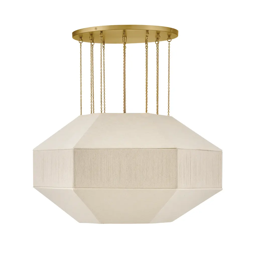The Lisa McDennon Collection offers a striking mix of edgy, sculptural silhouettes that incorporate modern, organic elements and luxe materials, brought to life by her innovative and original point of view. Elegant yet edgy, Lyla’s geometric Oatmeal Linen shade with a textured, wrapped middle band is suspended from refined Lacquered Brass micro-chains – inspired by delicate jewelry designs. A Lacquered Brass canopy and dimmable lamping add subtle warmth and a sophisticated atmosphere to the surrounding space. Features