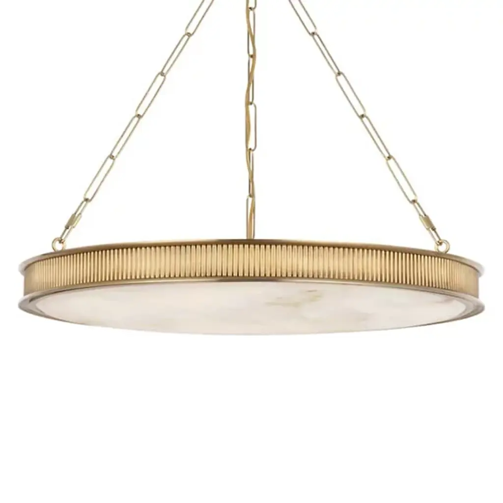 A beautifully detailed, corrugated cast metal frame surrounds the luxurious alabaster diffuser of this stunning drum-shaped pendant. Light passes through the alabaster giving off a soft glow. Available in three sizes and four finishes, Lynden is perfect in entryways, libraries, over large round tables or anywhere you want to make a statement. Choose from Aged Brass, Antique Nickel, Distressed Bronze and Polished Nickel.