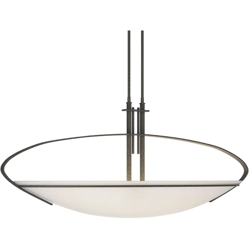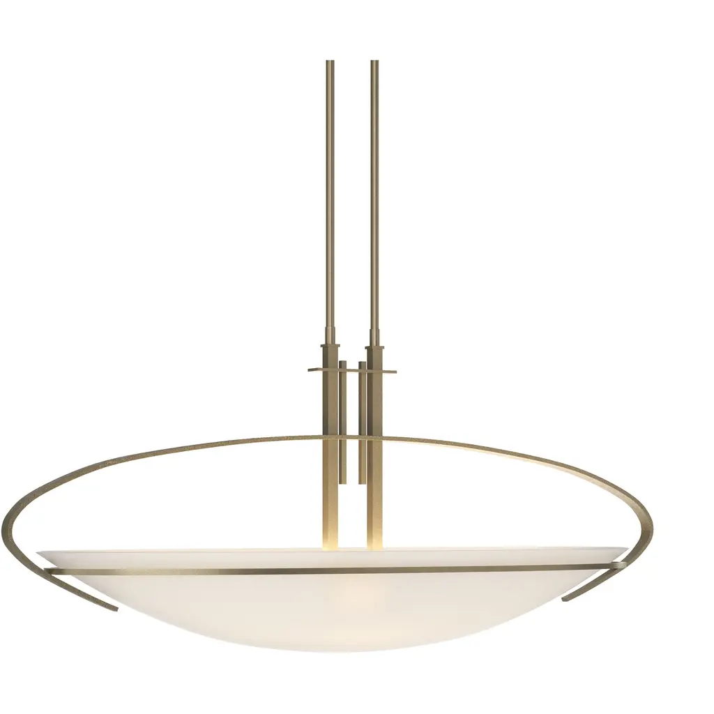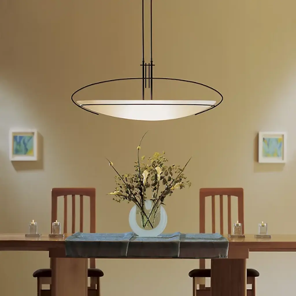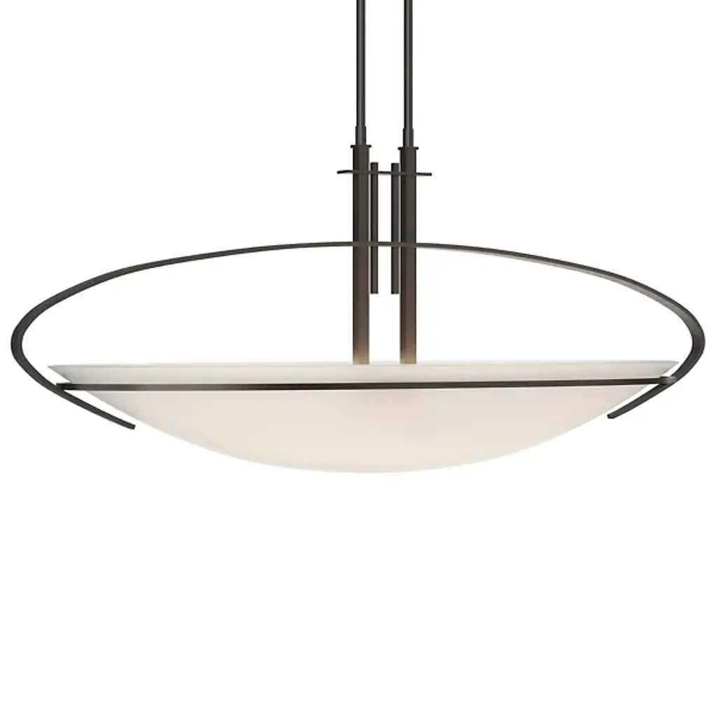 Drawing inspiration from post-impressionist and Art Nouveau design. The Mackintosh Bowl Pendant from Hubbardton Forge provides a warm and inviting illumination and pays homage to the renowned architect Charles Rennie Mackintosh. Crafted by hand by skilled Vermont artisans upon receiving your order, this fixture features a metal body and Opal Glass shade that diffuses light for comfortable illumination. The metal bands give the product a dynamic look by swooping and sweeping around the bowl both vertically and horizontally.