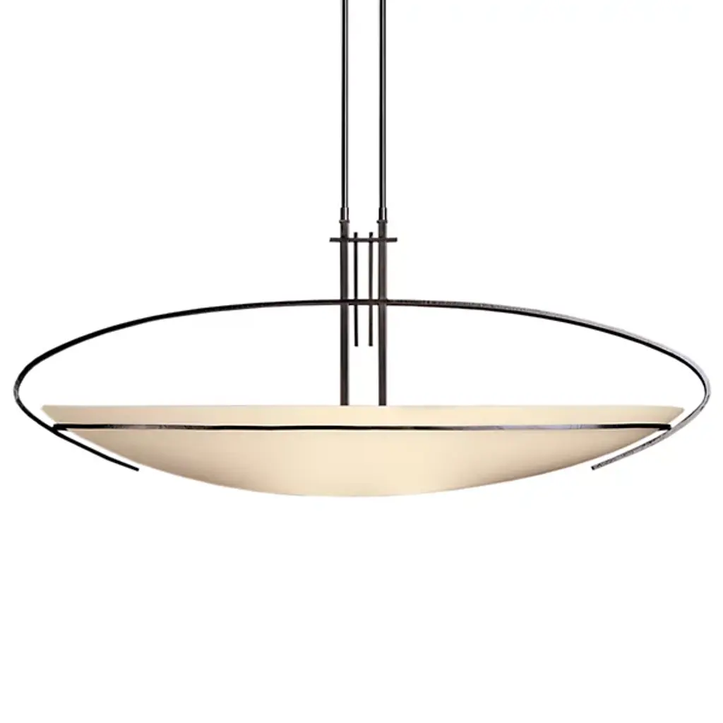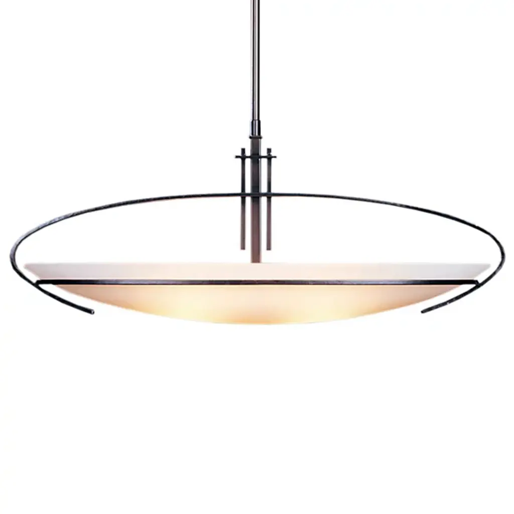 Drawing inspiration from post-impressionist and Art Nouveau design. The Mackintosh Bowl Pendant from Hubbardton Forge provides a warm and inviting illumination and pays homage to the renowned architect Charles Rennie Mackintosh. Crafted by hand by skilled Vermont artisans upon receiving your order, this fixture features a metal body and Opal Glass shade that diffuses light for comfortable illumination. The metal bands give the product a dynamic look by swooping and sweeping around the bowl both vertically and horizontally.