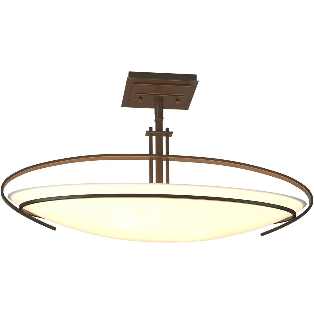 The Hubbardton Forge Mackintosh Semi-Flushmount creates abundant illumination in a design inspired by the work of Arts & Crafts architect Charles Rennie Mackintosh. The Mackintosh Semi-Flushmount-Oval features hand-blown glass shade and hand-forged wrought iron body.