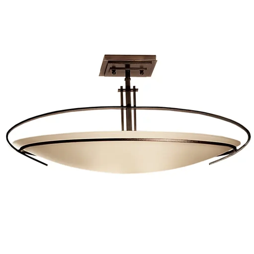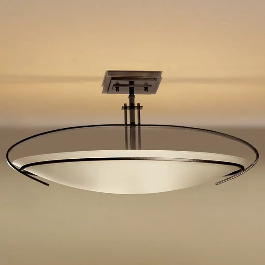 The Hubbardton Forge Mackintosh Semi-Flushmount creates abundant illumination in a design inspired by the work of Arts & Crafts architect Charles Rennie Mackintosh. The Mackintosh Semi-Flushmount-Oval features hand-blown glass shade and hand-forged wrought iron body.