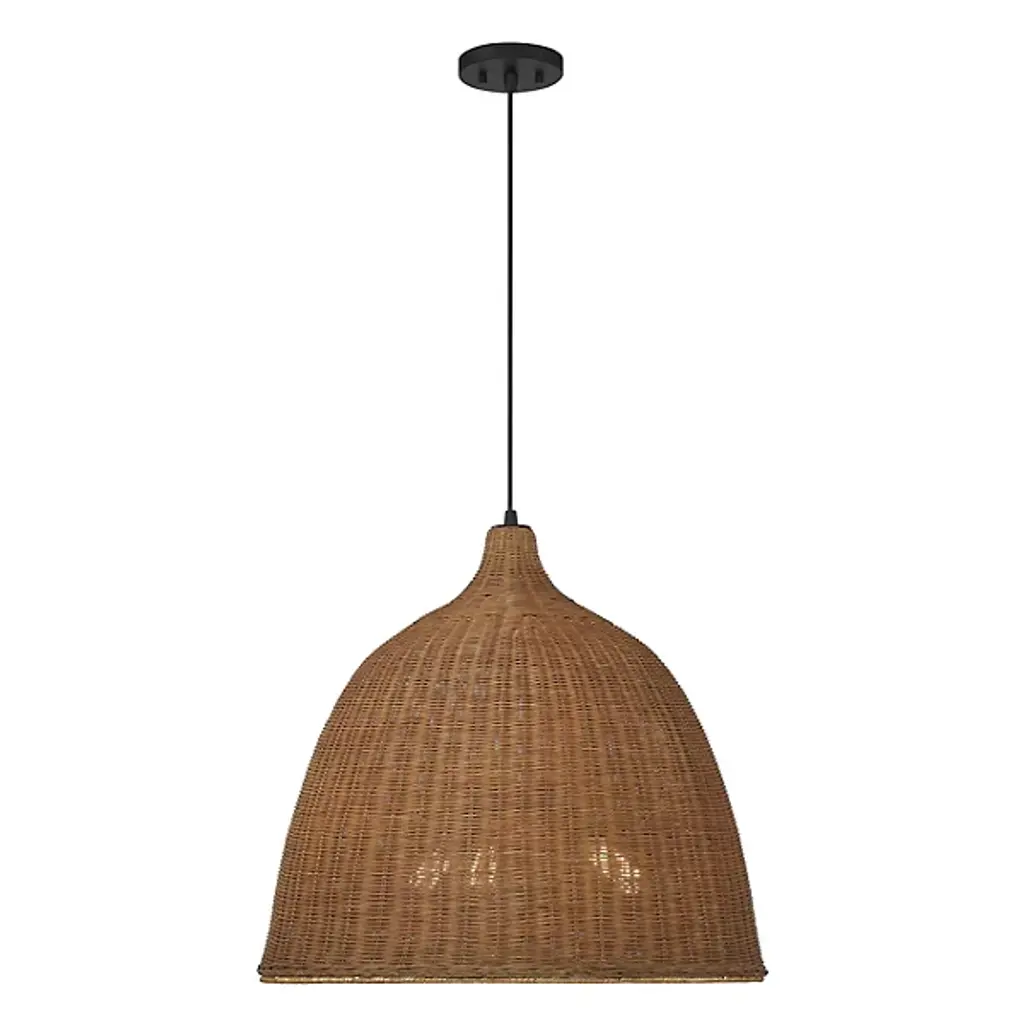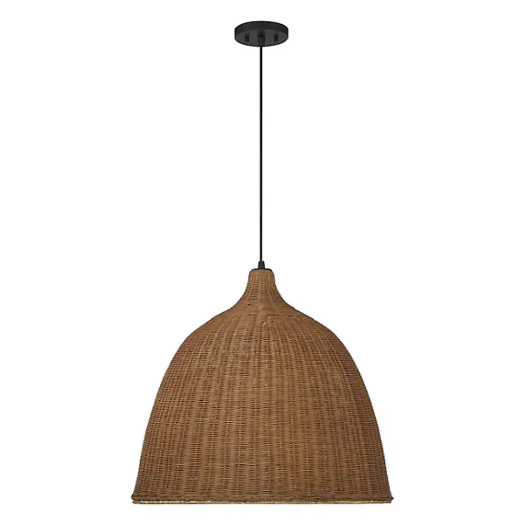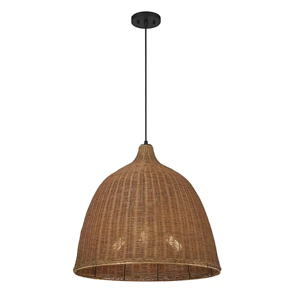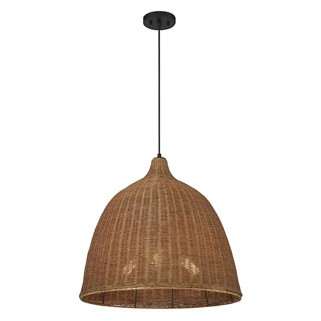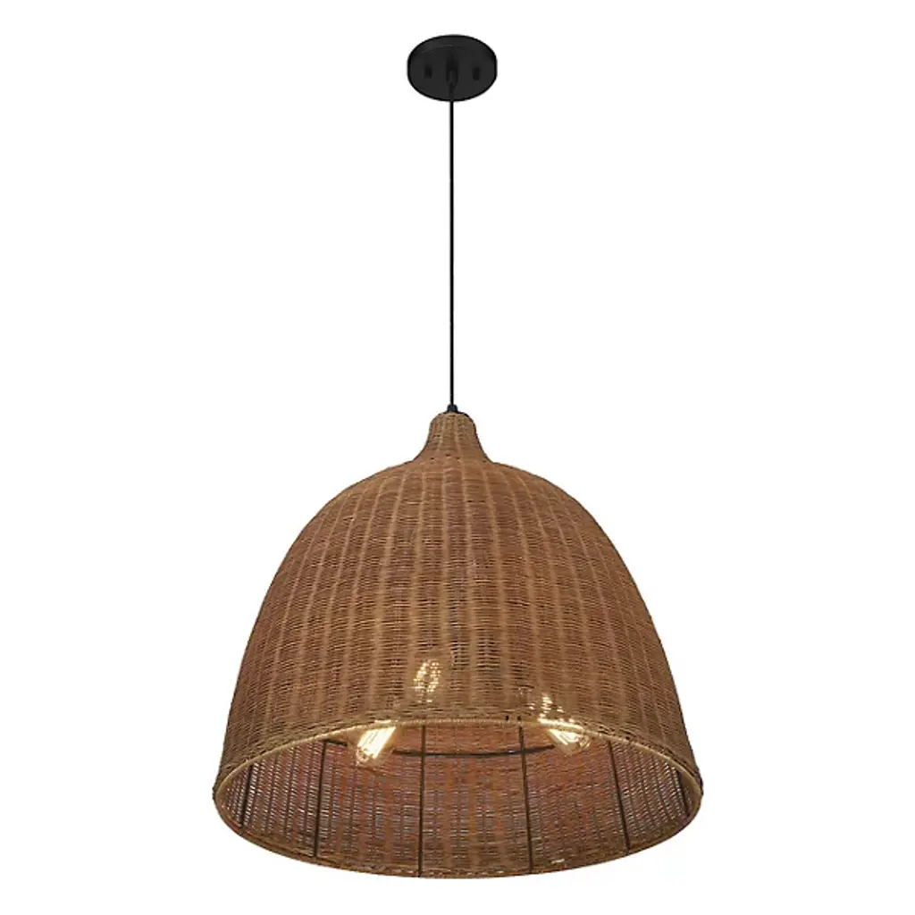 An easy piece to admire up close like a traditionally woven basket. The Macra Café Light Pendant from Savoy House graces the room with an impressive volume crafted to mellow brilliant light. It brings to life modern form using time-tested techniques. The piece hangs with fine cord from a compact canopy, making it great as a pair over a table. The dome shade captivates with an ultra-tight weave made from wicker. The wicker strands produce organic texture and color that makes the overall piece feel unique. Producing ambient highlights on the shade’s exterior, the bulbs send a pool of comfortable light below. S/F: • Woven wicker shade evokes traditional baskets • Perforations and wide opening of shade suggest an ambient and task light respectively