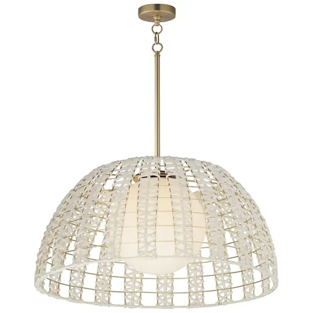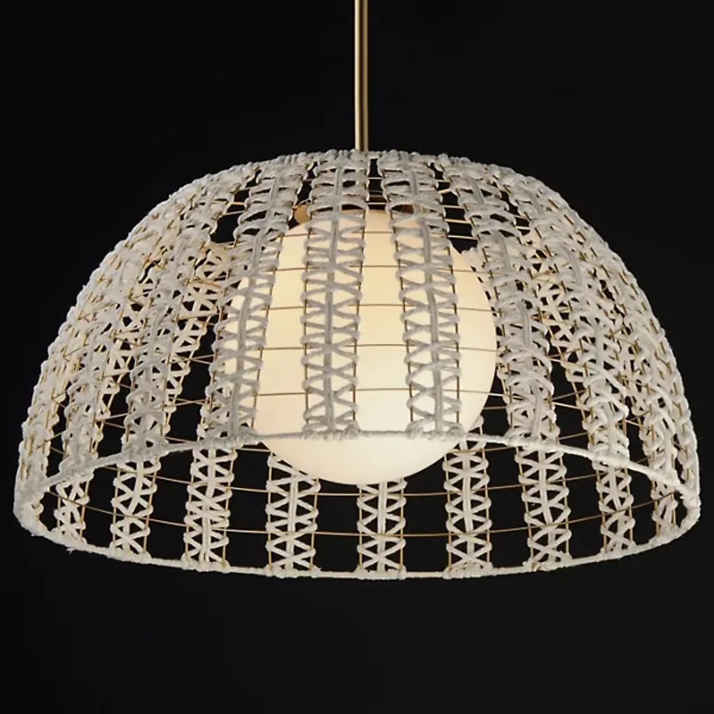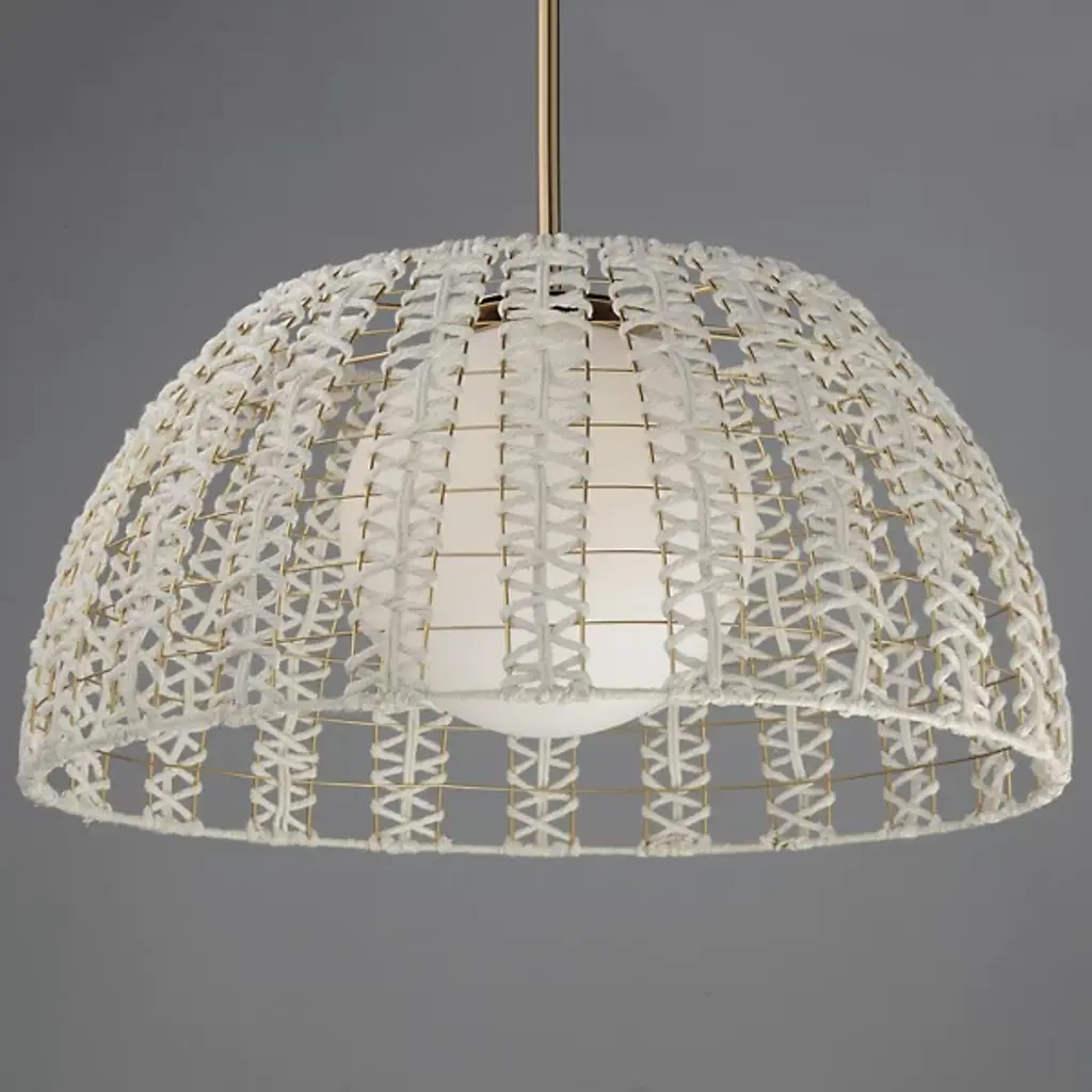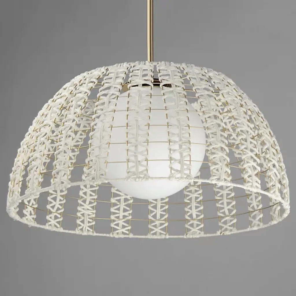 The Macrame Pendant by Maxim Lighting showcases a beautifully hand-woven cotton rope design in an Off-White finish, artfully wrapped around a durable metal frame with a luxurious Gold finish. The intricate craftsmanship forms a captivating pattern, while the Satin White glass globes gently diffuse the light, creating a cozy and welcoming glow. This sconce blends artistic detail with practical function, making it an ideal addition to any space needing a refined yet stylish lighting solution.