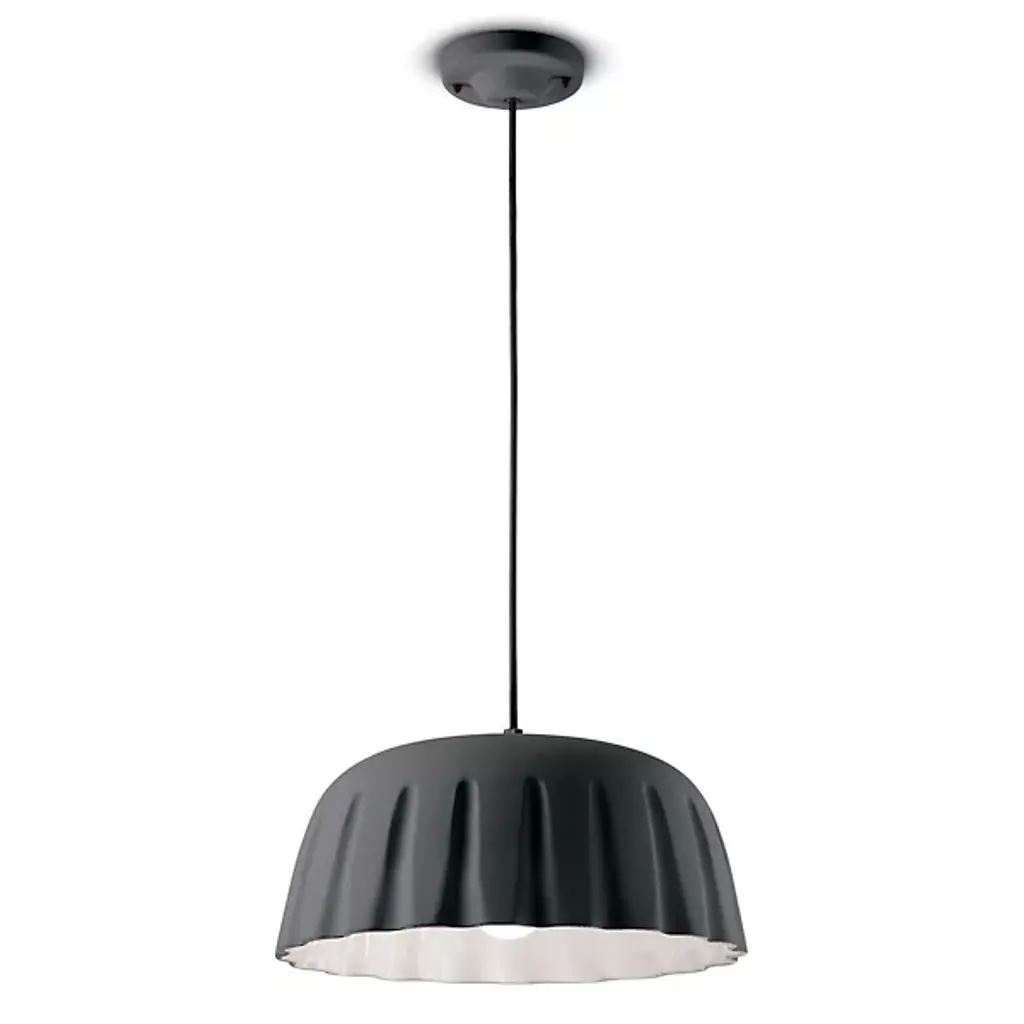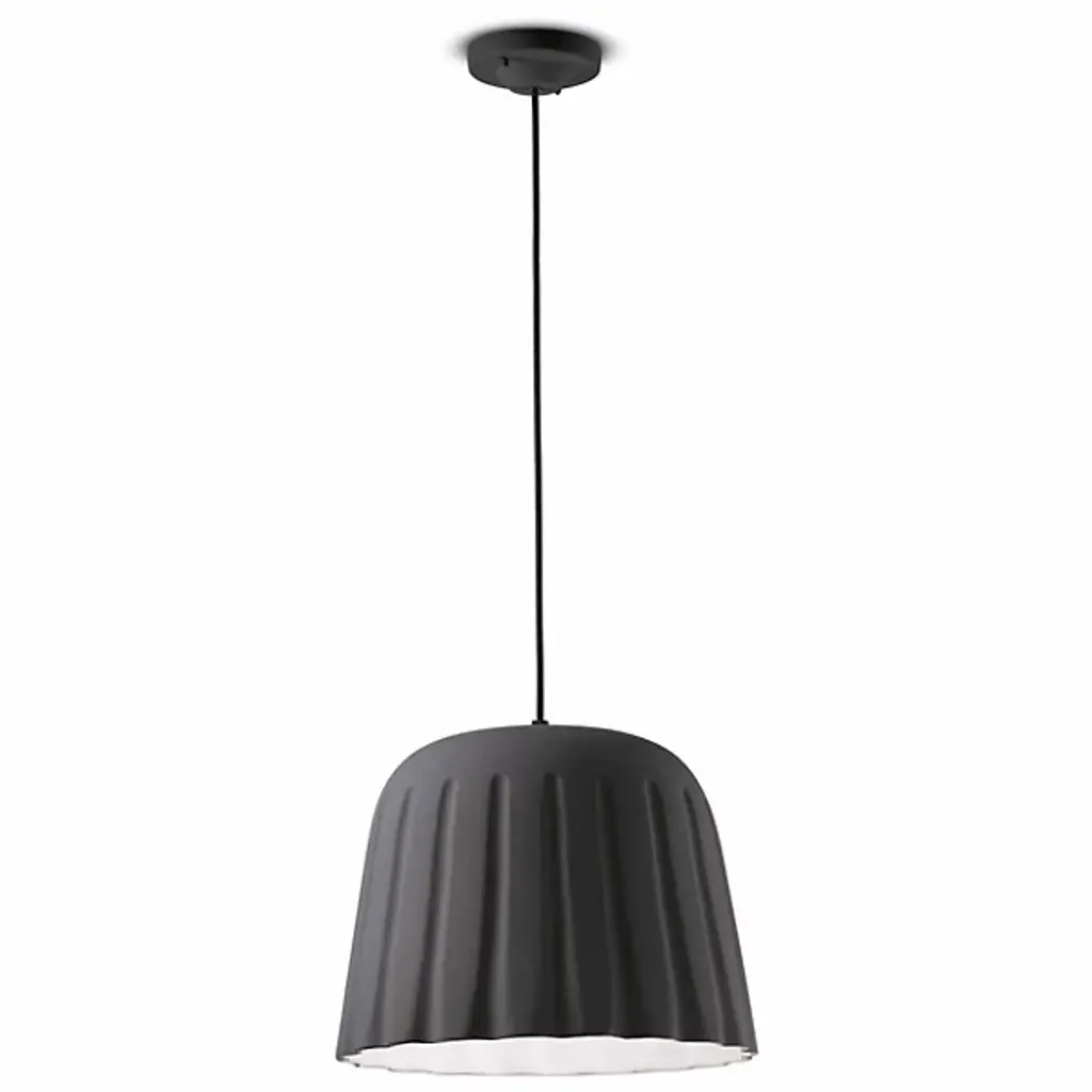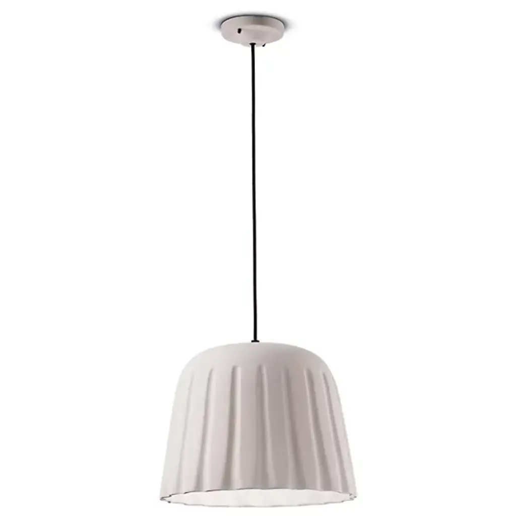 Ferroluce presents the Madame Gres Pendant. Handmade in Italy, this attractive and understated luminary features a vertical inlay and undulating surface that creates a distinctive look. Evoking the aesthetic of vintage stoneware, the ceramic bodice gives off warmth, and it has a pleated style around the perimeter with all the edges rounded in a pleasant curve. The illumination within the pendant flows from its aperture to animate décor and locales of choice.