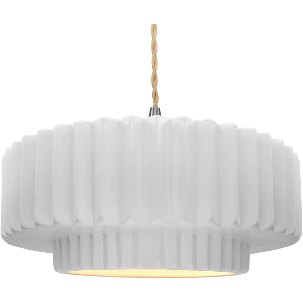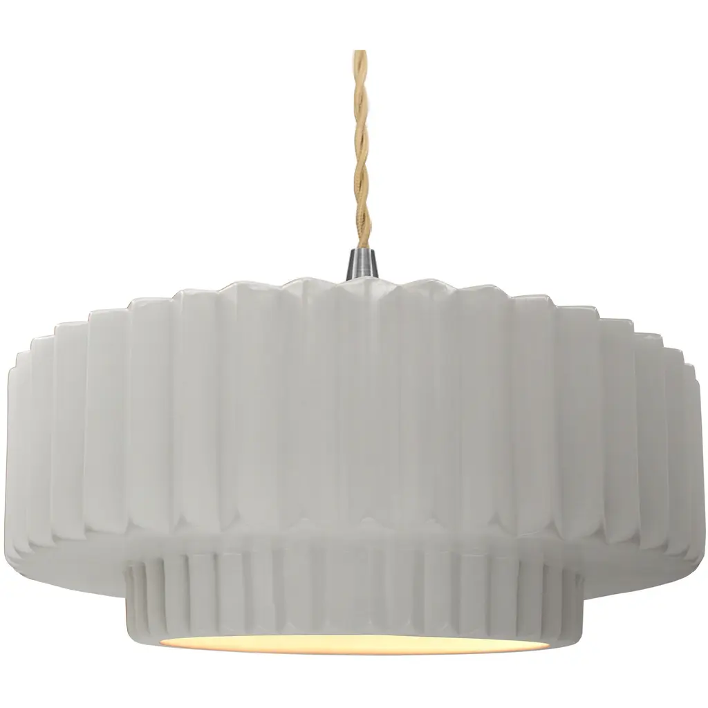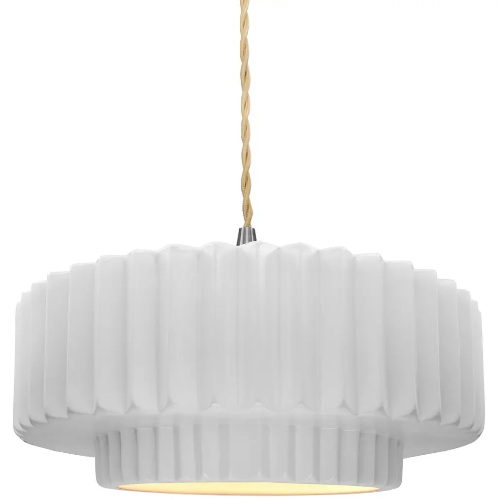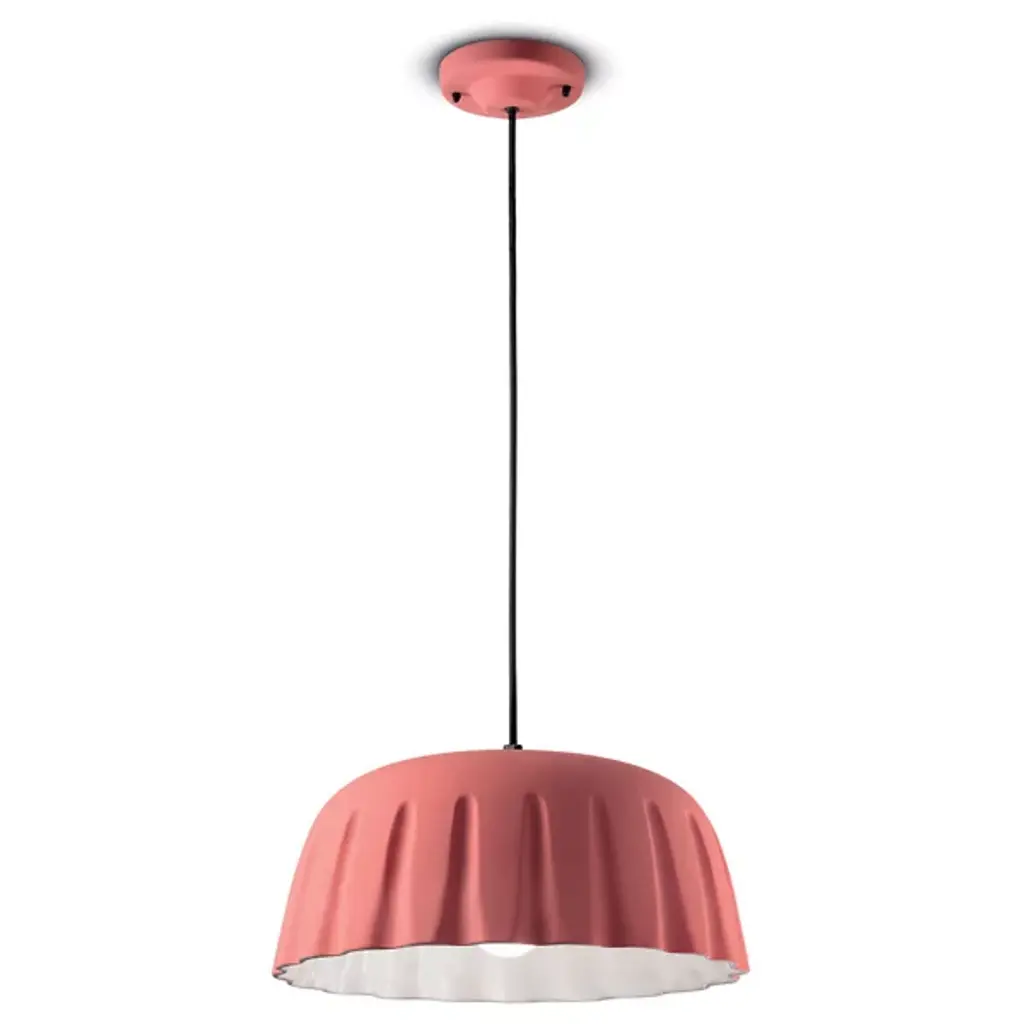 Ferroluce presents the Madame Gres Pendant. Handmade in Italy, this attractive and understated luminary features a vertical inlay and undulating surface that creates a distinctive look. Evoking the aesthetic of vintage stoneware, the ceramic bodice gives off warmth, and it has a pleated style around the perimeter with all the edges rounded in a pleasant curve. The illumination within the pendant flows from its aperture to animate décor and locales of choice.
