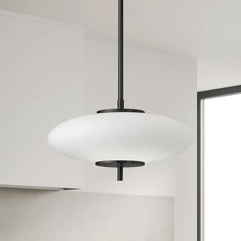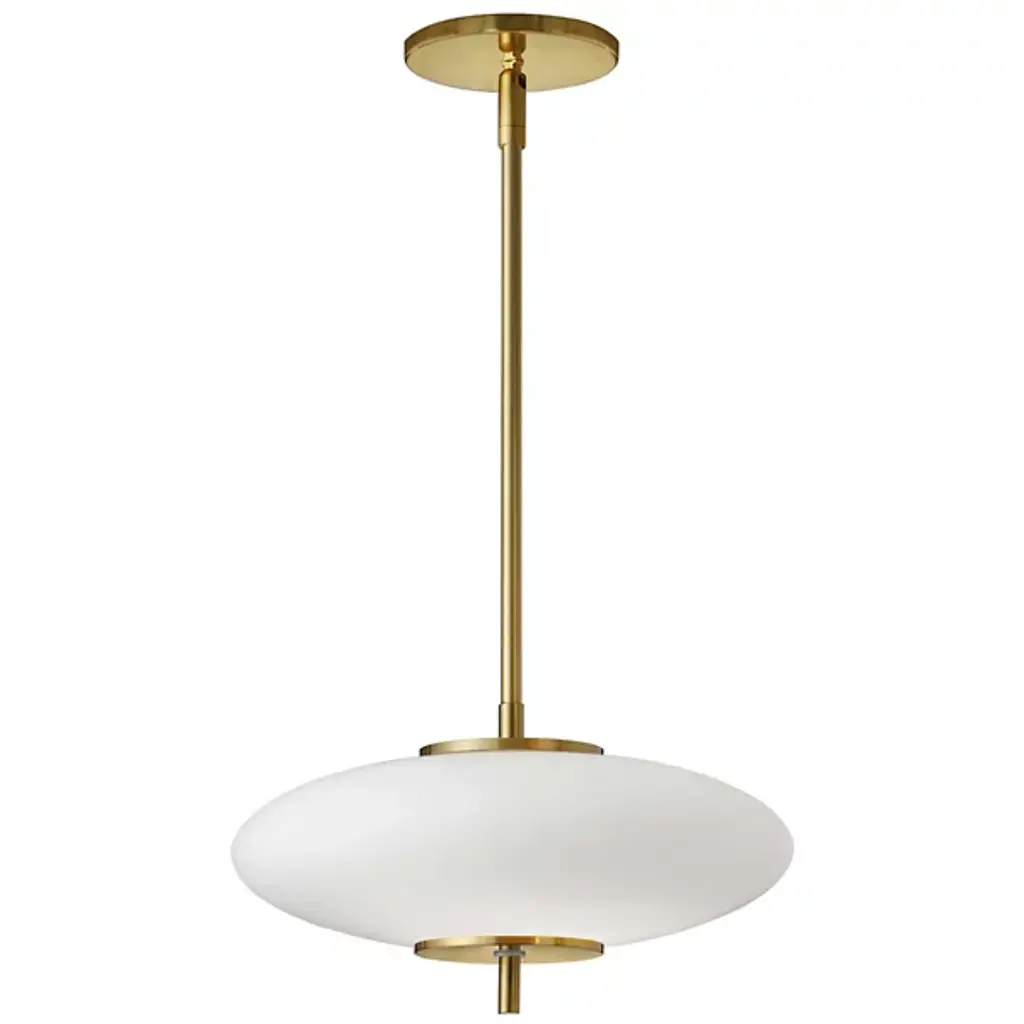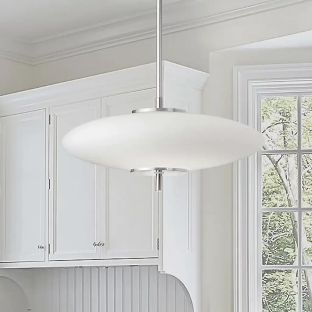 An eye-catching take on mid-century modern lighting design. With the thick disc shape of its glass shade, the Maddie LED Pendant by Dainolite gives off space-age vibes typical of so many MCM design motifs. In this case, the soft-looking shade is held securely aloft between 2 coordinating metal discs and finished with a short finial to complement the rod suspension above. In a modern kitchen or dining area, this pendant is charming and elegant.
