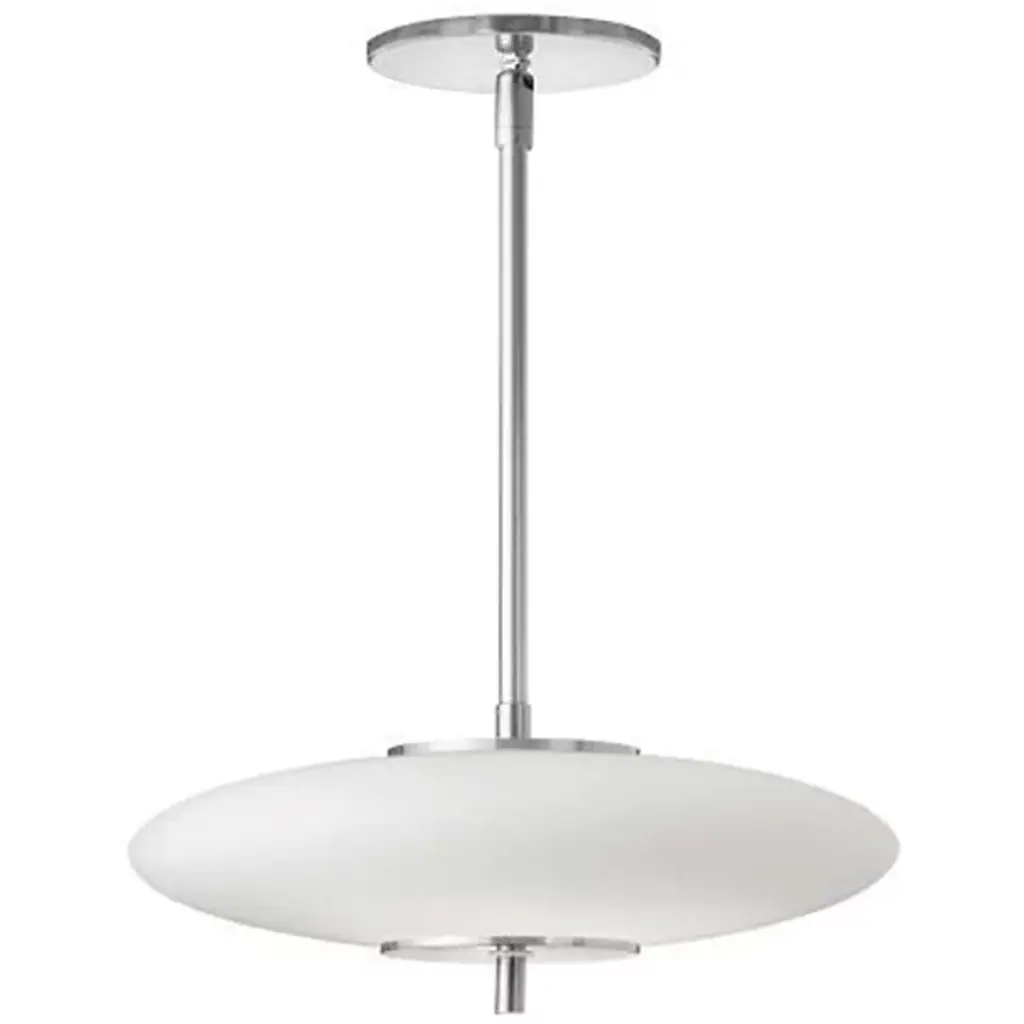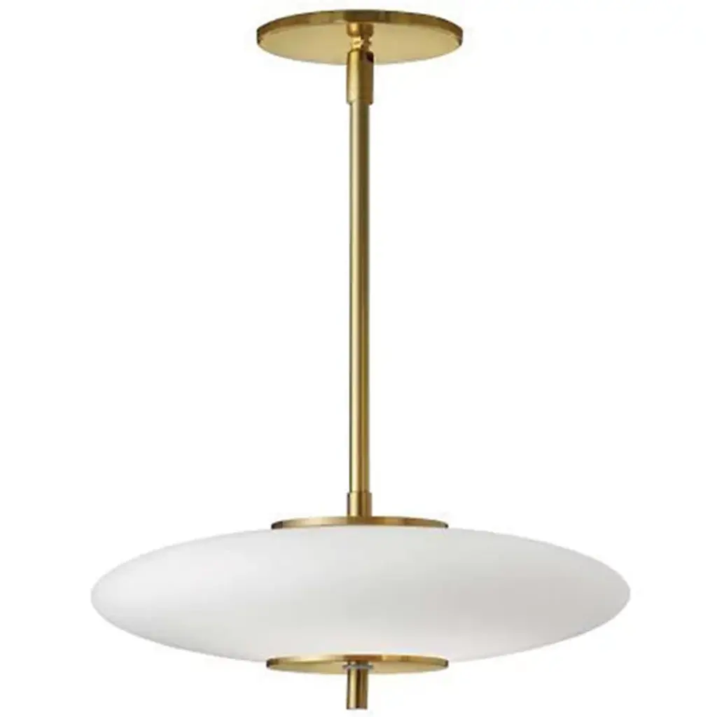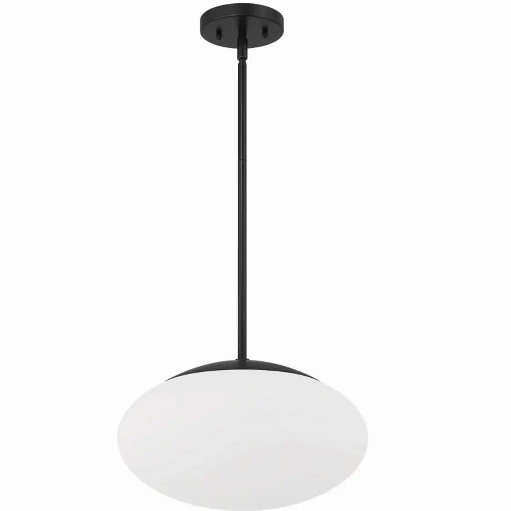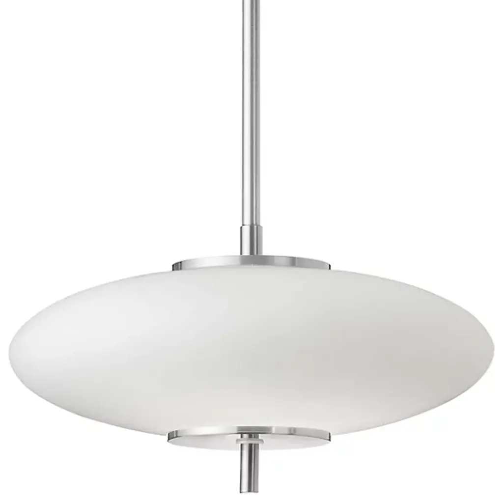 An eye-catching take on mid-century modern lighting design. With the thick disc shape of its glass shade, the Maddie LED Pendant by Dainolite gives off space-age vibes typical of so many MCM design motifs. In this case, the soft-looking shade is held securely aloft between 2 coordinating metal discs and finished with a short finial to complement the rod suspension above. In a modern kitchen or dining area, this pendant is charming and elegant.
