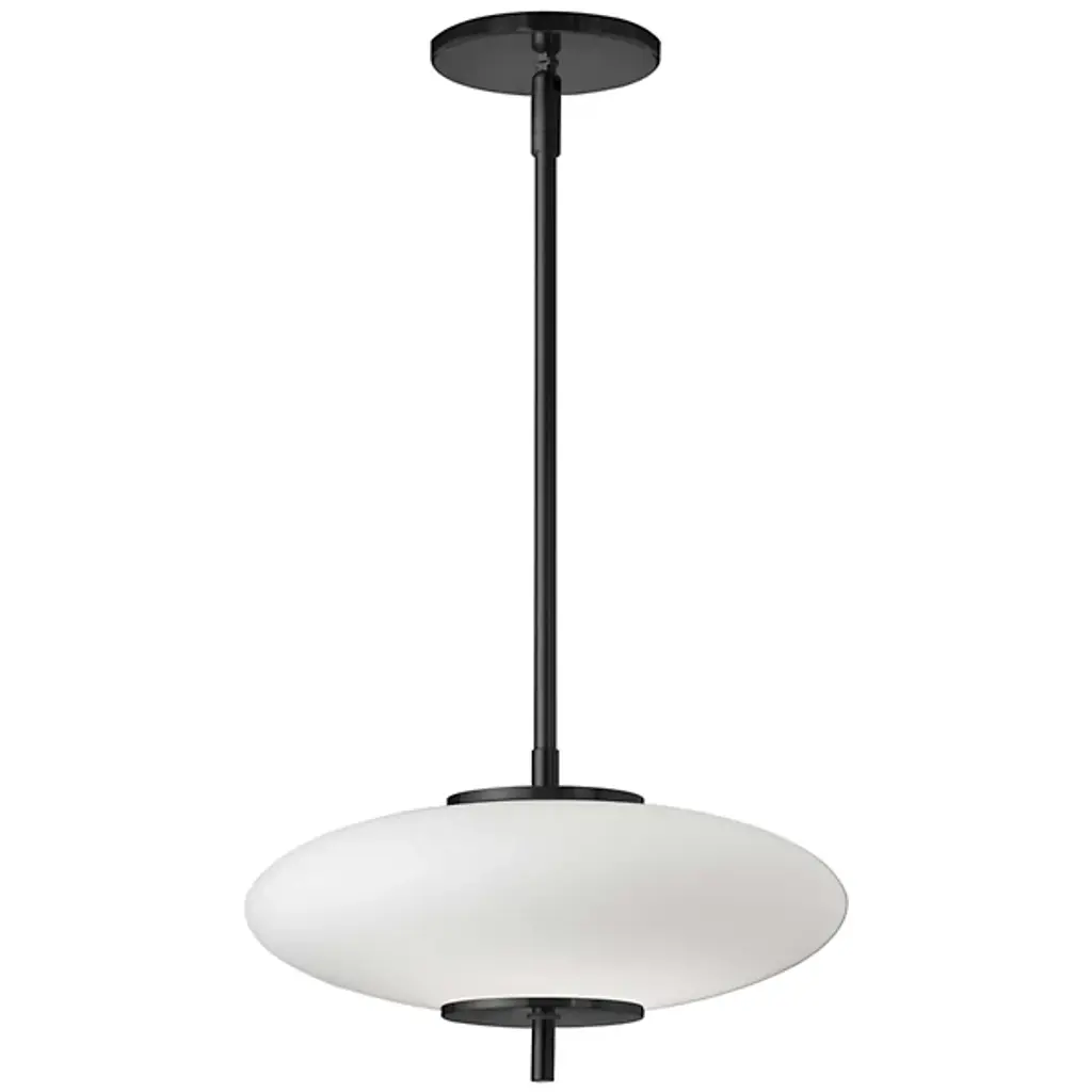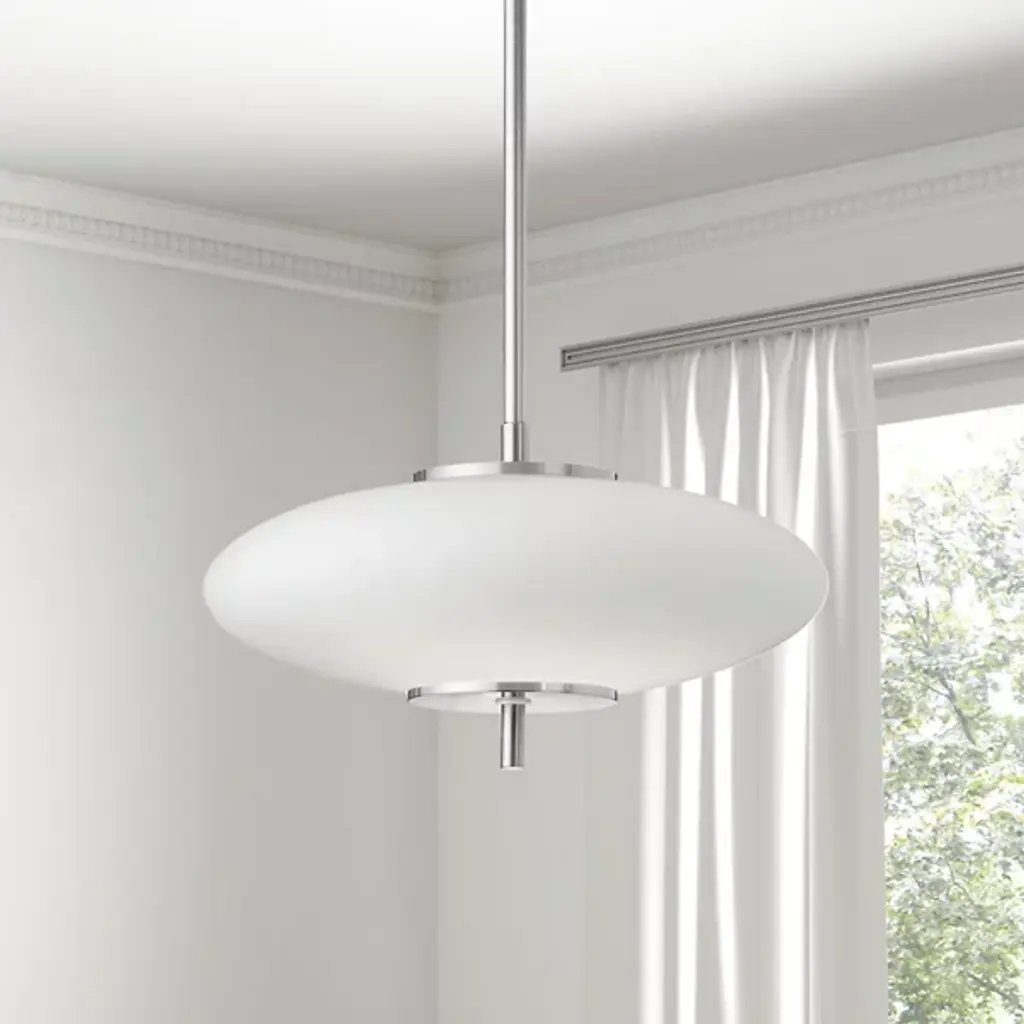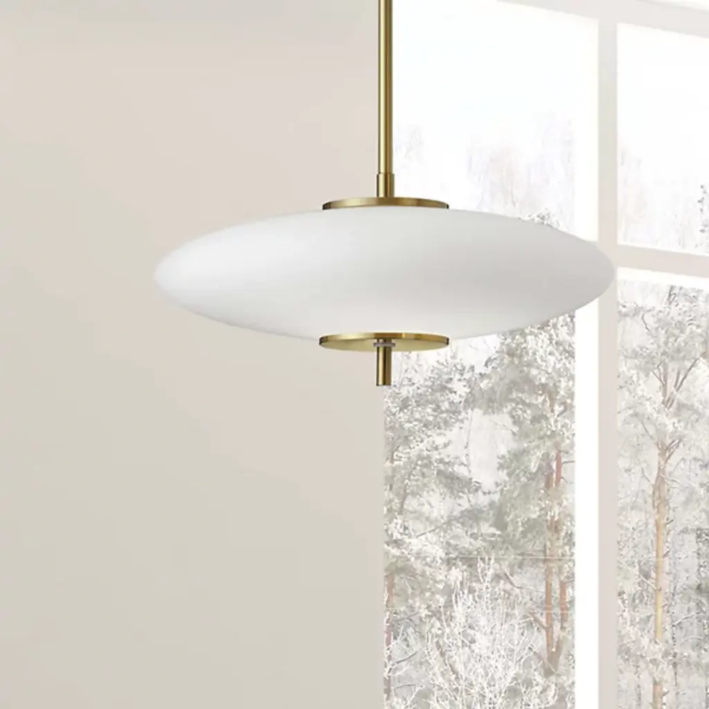 An eye-catching take on mid-century modern lighting design. With the thick disc shape of its glass shade, the Maddie LED Pendant by Dainolite gives off space-age vibes typical of so many MCM design motifs. In this case, the soft-looking shade is held securely aloft between 2 coordinating metal discs and finished with a short finial to complement the rod suspension above. In a modern kitchen or dining area, this pendant is charming and elegant.