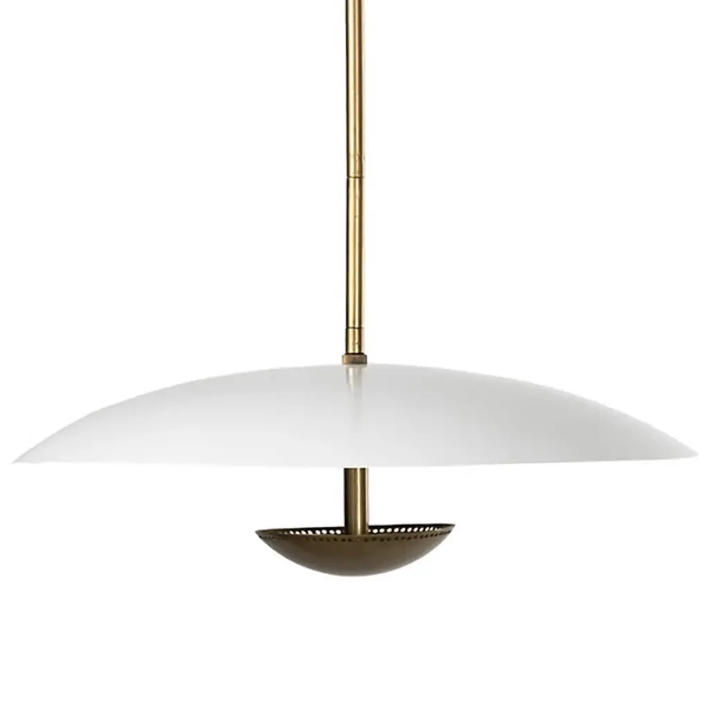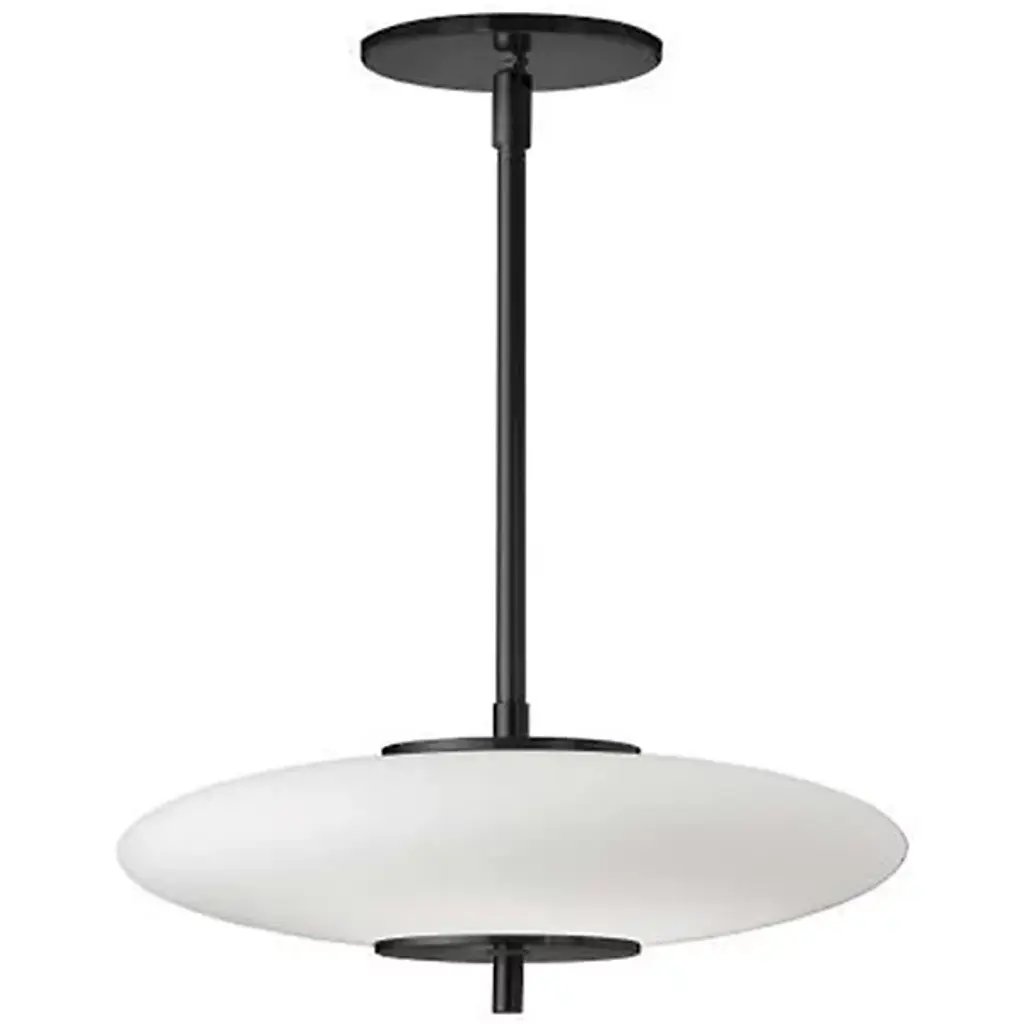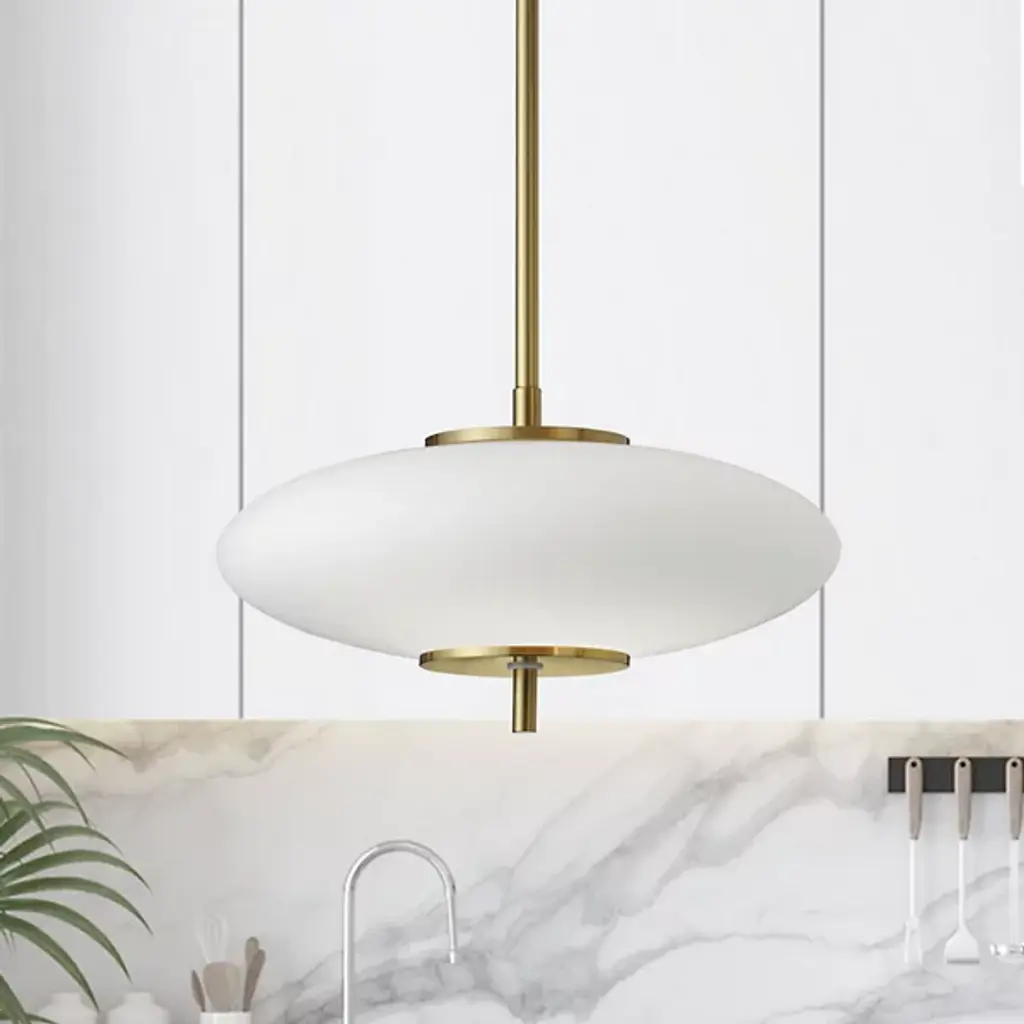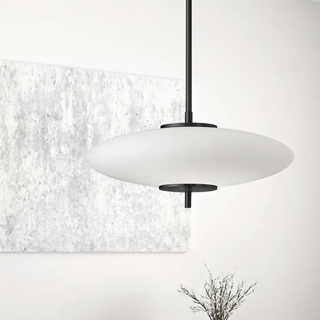 An eye-catching take on mid-century modern lighting design. With the thick disc shape of its glass shade, the Maddie LED Pendant by Dainolite gives off space-age vibes typical of so many MCM design motifs. In this case, the soft-looking shade is held securely aloft between 2 coordinating metal discs and finished with a short finial to complement the rod suspension above. In a modern kitchen or dining area, this pendant is charming and elegant.