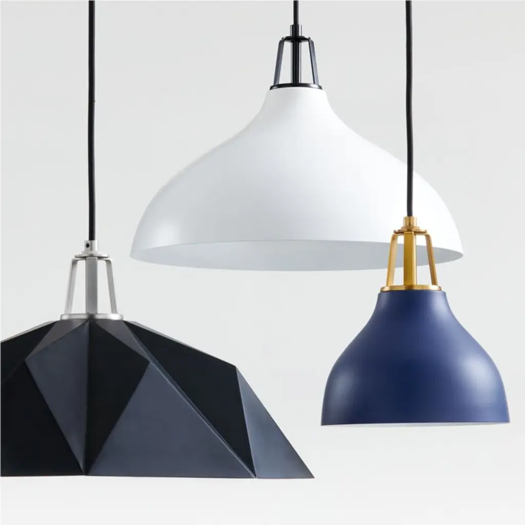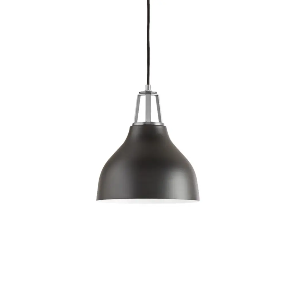 Our Maddox collection mixes and matches finishes and features, creating the perfect combination for your home. Steel shades in a variety of shapes, sizes and modern hues pair matte exteriors and glossy white interiors that reflect light beautifully, accented by decorative socket caps and ceiling plates in a range of finishes. Strikingly simple with clean geometry, this small bell pendant light contrasts a gracefully arched matte black shade with its bright inner surface and brushed nickel details. Hang the adjustable-height pendant over a breakfast nook, kitchen table or sink for a bold, graphic look and useful illumination. Blake Tovin designed our exclusive Maddox collection to be as flexible and functional as the modern home.